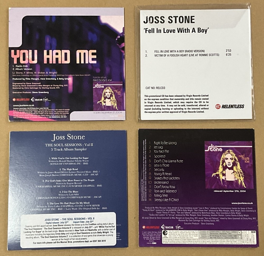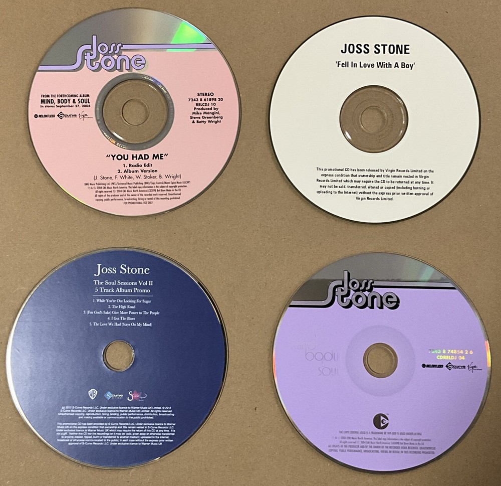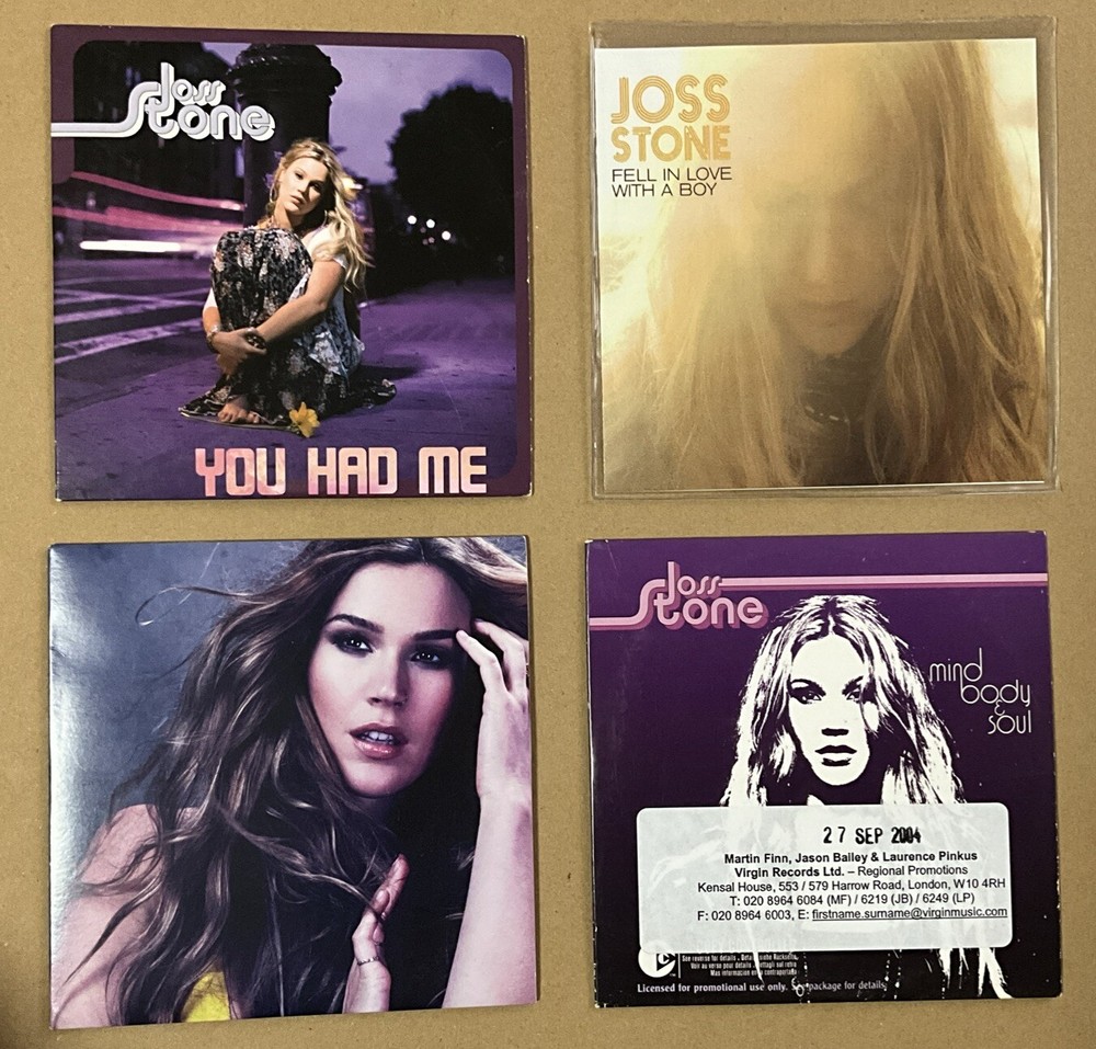 This is a 2 x Promo Cd Single + 2x Promo Cd Album/Sampler bundle by Joss Stone. All Cd's play perfectly and are in Good to Very Good condition. Card sleeves/Artwork are in Good to Very Good Condition. See below for full tracklistings. Tracklist Mind Body Soul:- 1 Right To Be Wrong 2 Jet Lag 3 You Had Me 4 Spoiled 5 Don't Cha Wanna Ride 6 Less Is More 7 Security 8 Young At Heart 9 Snakes And Ladders 10 Understand 11 Don't Know How 12 Torn And Tattered 13 Killing Time 14 Sleep Like A Child Soul Sessions Vol 2 Album Sampler Tracklist. 1 While You're Out Looking For Sugar 2 The High Road 3 (For God's Sake) Give More Power To The People 4 I Got The Blues 5 The Love We Had (Stays On My Mind) Fell In Love With A Boy Tracklist. 1 Fell In Love With A Boy (Radio Version) 2:53 2 Victim Of A Foolish Heart (Live at Ronnie Scotts) 6:25 You Had Me Tracklist 1 You Had Me (Radio Edit) 3:35 2 You Had Me (Album Version) 3:59 We sell a huge selection of very rare items by top music artists including Cd's, Vinyl and Dvd's. Sign up for our email newsletters by adding our eBay Shop to your favourites Worldwide shipping! I combine P+P so the more you buy...the more you save!! I always obtain proof of posting for all items sent. Recorded/signed for delivery for your added security. Check out my other items! Thanks for looking! Please note:- All items MUST be paid for within 4 days. All overseas sales are not inclusive of any sales tax which you are responsible for paying and may be added to your invoice. RETURNS In all cases, please contact us, (Pillar Box Gifts), via eBay messages, before returning items. We are happy to cover return postage costs for Faulty, Incorrect or Incorrectly Described Items, as long as they are reported via eBay messages to Pillar Box Gifts within 30 days after the item has been delivered. We reserve the right to not refund in full if the item is returned damaged, used and/or not in the original packaging. To return your item, you must return it to us in the same condition as you received it, unopened and in the original packaging. You are responsible for returning the item. RETURNS DUE TO CHANGE OF MIND If you change your mind about an item after ordering, we are happy to accept returns on this basis after messaging us via eBay messages. You are responsible for the cost of return postage and for returning the item in the same condition it was sent in. DAMAGES We always take care with the packing of our products, we send them out with care. But there are occasions that while on route to our customers the item may receive damage for reasons that are not a fault of ours. If you have received an item that is damaged in any way, then please can you follow the following instructions so that we can process your order. *Contact us as soon as you can via eBay messages. *Take clear photos of outside, inside and contents of the box/packaging. *Take clear photos of the damaged item. *Send the images to Pillar Box Gifts via eBay messages. PLEASE NOTE:- It is important the correct Return Reason is used when opening a return on eBay. When you contact us regarding a return, we will assist you on which reason to use. Misuse of Return Reasons will not be tolerated and, as such, members will be reported to eBay, without exception. RETURNS In all cases, please contact us, (Pillar Box Gifts), via eBay messages, before returning items. We are happy to cover return postage costs for Faulty, Incorrect or Incorrectly Described Items, as long as they are reported via eBay messages to Pillar Box Gifts within 30 days after the item has been delivered. We reserve the right to not refund in full if the item is returned damaged, used and/or not in the original packaging. To return your item, you must return it to us in the same condition as you received it, unopened and in the original packaging. You are responsible for returning the item. RETURNS DUE TO CHANGE OF MIND If you change your mind about an item after ordering, we are happy to accept returns on this basis after messaging us via eBay messages. You are responsible for the cost of return postage and for returning the item in the same condition it was sent in. DAMAGES We always take care with the packing of our products, we send them out with care. But there are occasions that while on route to our customers the item may receive damage for reasons that are not a fault of ours. If you have received an item that is damaged in any way, then please can you follow the following instructions so that we can process your order. *Contact us as soon as you can via eBay messages. *Take clear photos of outside, inside and contents of the box/packaging. *Take clear photos of the damaged item. *Send the images to Pillar Box Gifts via eBay messages. PLEASE NOTE:- It is important the correct Return Reason is used when opening a return on eBay. When you contact us regarding a return, we will assist you on which reason to use. Misuse of Return Reasons will not be tolerated and, as such, members will be reported to eBay, without exception. Discounts, Best Offers, or Markdowns Tips:- Discounts (%) deducted at checkout are not valid if Best Offer is used. If you benefit more from the discount amount, just Buy It Now instead of making an offer and the Discount will be deducted at checkout. Best offers are available on some items. Please offer reasonable offers, as very low offers will be rejected. Markdowns will show the previous price and the new marked down offer price. Some markdowns may have Best Offer on the listing. It is unlikely that a Best Offer will be considered if the item is already Marked Down. Combined Postage. We are happy to combine postage costs on most multiple buys. This has already been set up automatically on our listings where we usually stock more than one of that particular item. Just add the items to your basket and checkout and the postage discount will be applied. For one off listings, buyers may request a total BEFORE paying. You may want to look up t