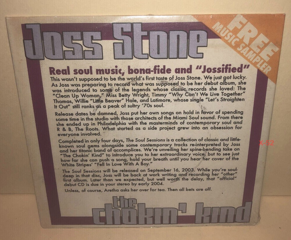 Offering the OFFICIAL release CD: JOSS STONE SAMPLER THE CHOKIN' KIND Questions welcome / More CDs MOVIE s TOYs in OUR ebay store https://www.ebay.com/str/X-52-STORE?_trksid=p2047675.l2563 Reduce shipping with multiple buys (contact us)