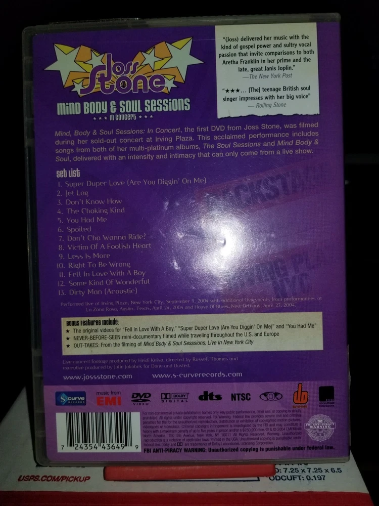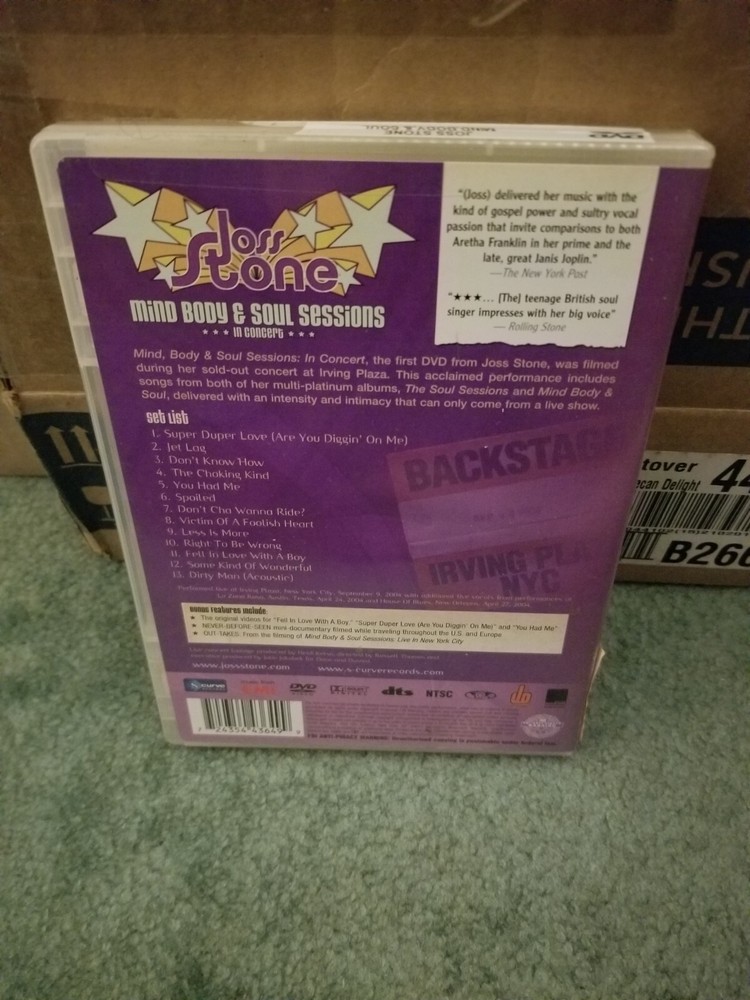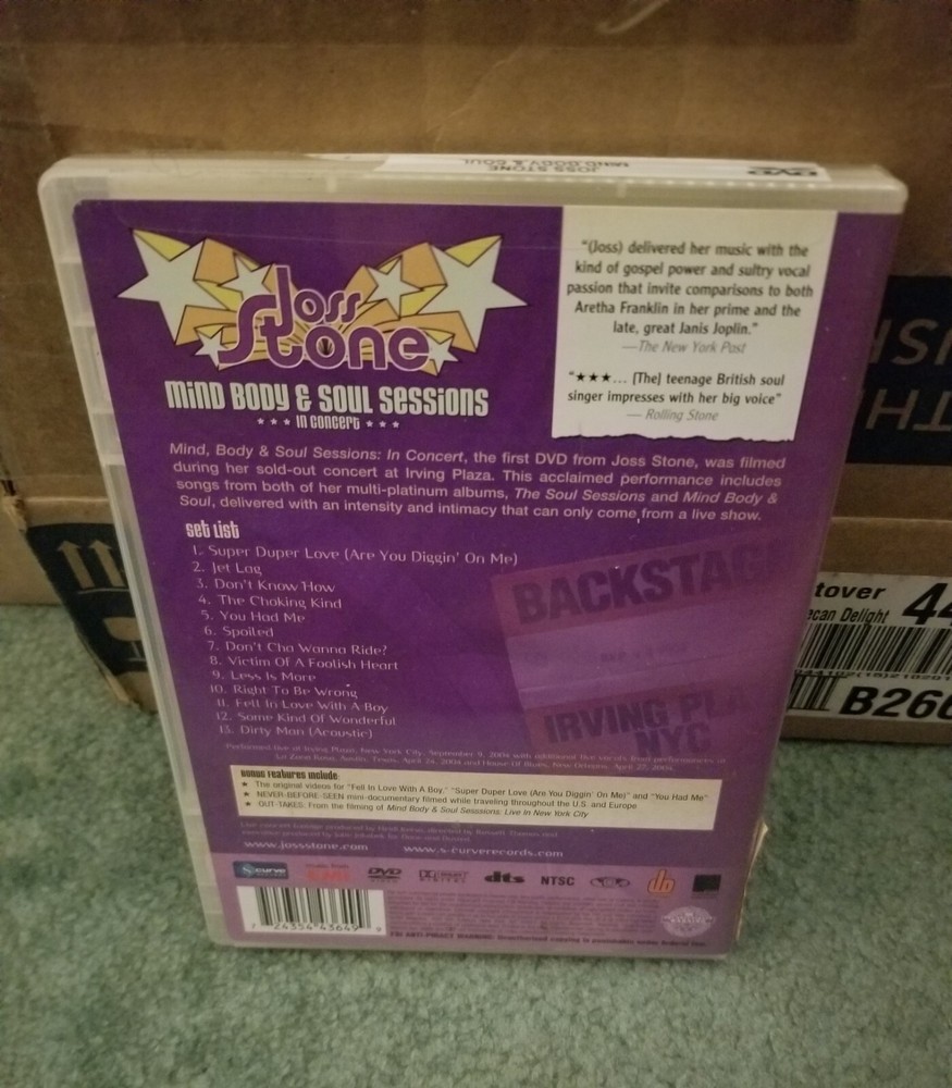 This DVD is titled "Joss Stone: Mind Body & Soul Sessions" and was released in 2004. It falls under the genre of Musical & Performing Arts and the sub-genre of Pop Music. The DVD features Joss Stone showcasing her talents in this musical performance. The format of the DVD is standard, and it is in Very Good Condition (VGC+), making it a great addition to any music lover's collection.