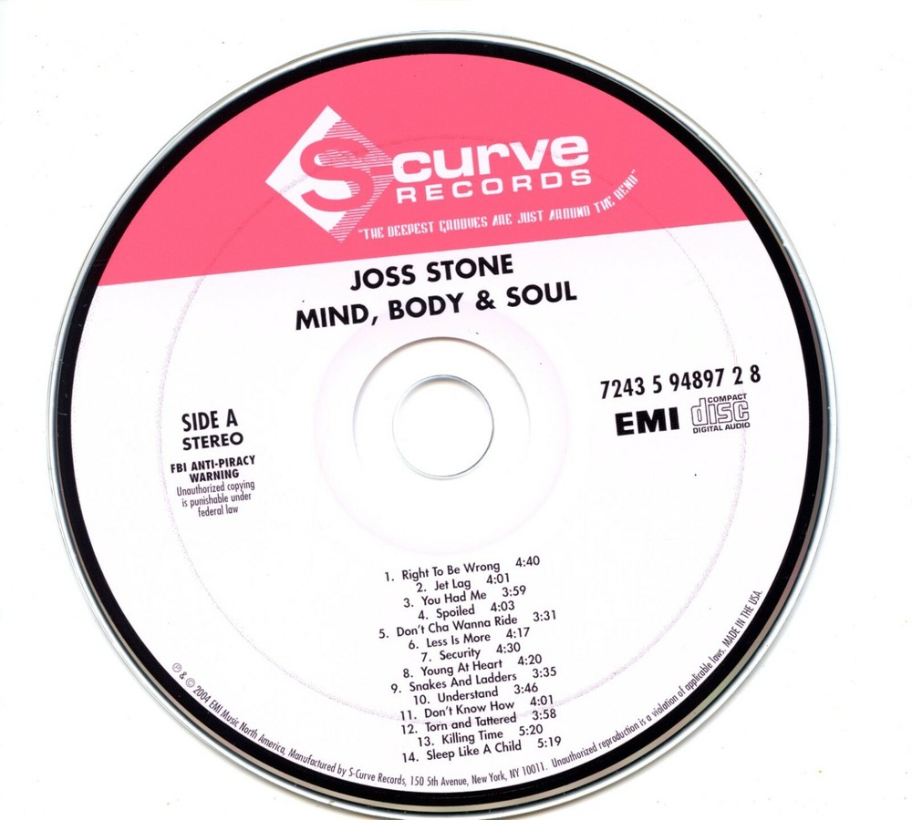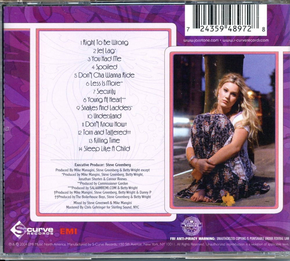 FREE SHIPPING IN CANADA Artist: Joss Stone UPC: 724359489728 Format: CD Release Year: 2004 Record Label: S-Curve Genre: Rock Tracklist Right To Be Wrong 4:40 Jet Lag 4:01 You Had Me 3:59 Spoiled 4:03 Don't Cha Wanna Ride 3:31 Less Is More 4:17 Security 4:30 Young At Heart 4:20 Snakes And Ladders 3:35 Understand 3:46 Don't Know How 4:01 Torn And Tattered 3:58 Killing Time 5:20 Sleep Like A Child 5:19 (silence) 10:08 Daniel 2:46 Details CD Length 72 Min. Producer Mike Mangini, Steve Greenberg & Betty Wright Distributor: S-Curve Records US Recording Type: Studio Recording Mode: Stereo Spar Code FREE SHIPPING IN CANADA PLEASE NOTE that due to the pandemic, mail delivery times have been delayed across the world. While some packages are flowing as normal, you could experience a delay. As always, I will ship out same business day or next business day depending on what time of day payment is received. More than 30 US states now require buyers to pay sales tax on eBay purchases In states where eBay is required to collect Internet Sales Tax from buyers, order totals sent for processing will reflect the gross order amount inclusive of tax. Ask about combined shipping for multiple items