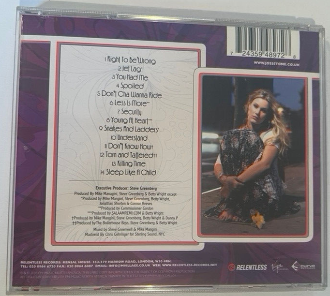 Immerse yourself in the soulful tunes of Joss Stone's "Mind, Body & Soul" CD, a stellar addition to any R&B and soul music collection. Released in 2004 by S-Curve Records, this album showcases a blend of neo-soul rhythms and melodies that resonate with the listener, featuring hits like "You Had Me Right" and "Spoiled." The CD comes in a standard jewel case, ensuring secure storage and longevity. With a run time of 72 minutes, the album is presented in English and reflects the artistic signature of the early 2000s era. Whether you're a long-time fan or discovering this album for the first time, the rich vocals and stirring performances make for an enchanting auditory experience. Joss Stone – Mind Body & Soul More images Label: S-Curve Records – 7243 5 94897 2 8 Format: CD , Album Country: US Released: Sep 28, 2004 Genre: Rock , Funk / Soul Style: Pop Rock , Soul , Contemporary R&B 1 Right To Be Wrong Electric Piano [Fender Rhodes] – Angelo Morris Flugelhorn – Tom "Bones" Malone * Organ [B3] – Raymond Angry Piano – Benny Latimore Producer – Betty Wright , Mike Mangini , Steve Greenberg Written-By – B. Wright * , D. Child * , J. Stone * 4:41 2 Jet Lag Backing Vocals [Background Vocals] – Mercedes Martinez , Tracey Moore Bass – Pete Iannacone Drums – Jonathan Joseph (2) Electric Piano [Rhodes], Synthesizer, Programmed By, Drum Programming, Keyboards – Jonathan Shorten Lyrics By [Additional] – Betty Wright Organ [B3] – Raymond Angry Percussion – Nir Zidkyahu Producer – Betty Wright , Connor Reeves * , Jonathan Shorten , Mike Mangini , Steve Greenberg Written-By – C. Reeves * , J. Shorten * , J. Stone * 4:01 3 You Had Me Electric Piano [Rhodes] – Angelo Morris Guitar – Nile Rodgers Organ [B3], Clavinet, Synthesizer [Moog] – Raymond Angry Producer – Betty Wright , Mike Mangini , Steve Greenberg Trumpet, Trombone, Saxophone [Tenor & Baritone] – Tom "Bones" Malone * Written-By – B. Wright * , F. White * , J. Stone * , W. Stoker * 3:59 4 Spoiled Arranged By [String & Horn Arrangements] – Thom Bell Bass – Angelo Morris Organ [B3] – Timmy Thomas Piano – Benny Lattimore * Producer – Betty Wright , Mike Mangini , Steve Greenberg Written-By – B. Dozier * , J. Stone * , L. Dozier * 4:03 5 Don't Cha Wanna Ride Bass, Keyboards – Mike Mangini Drums – Jonathan Joseph (2) Piano, Organ [B3] – Raymond Angry Producer – Betty Wright , Mike Mangini , Steve Greenberg Saxophone [Baritone, Tenor], Trombone, Trumpet – Tom "Bones" Malone * Written-By – B. Wright * , D. Child * , E. Record * , J. Stone * , M. Mangini * , W. Sanders * , S. Greenberg * 3:32 6 Less Is More Arranged By [Backing Vocal Arrangement], Backing Vocals [Background Vocals] – Connor Reeves * Bass – Delroy "Chris" Cooper * Drums – Astor "Crusty" Campbell * Drums [Additional] – Wilburn "Squidley" Cole * Engineer – Commissioner Gordon , Jamie Siegel Guitar – Earl "Chinna" Smith Keyboards – Jonathan Shorten Percussion – Commissioner Gordon Producer – Commissioner Gordon Producer [Vocal Production] – Betty Wright Saxophone – Teodross Avery Trombone – Stafford Hunter , Tanya Darby Written-By – C. Reeves * , J. Shorten * , J. Stone * 4:18 7 Security Backing Vocals [Background Vocals] – Clovette Danzy , Ellison Kendrick , Jeanette Wright , Margaret Reynolds , Mercedes Martinez , Ruby Baker , Tracey Moore , Veronica Sanchez , William "Kooly" Scott Electric Piano [Rhodes] – Angie Stone Flugelhorn – Tom "Bones" Malone * Guitar – Angelo Morris , Danny P. Organ [B3], Piano – Raymond Angry Producer – Betty Wright , Mike Mangini , Steve Greenberg Written-By – D. Pierre * , J. Stone * , S. Greenberg * 4:31 8 Young At Heart Backing Vocals [Background Vocals] – Jeni Fujita Bass, Electric Piano [Wurlitzer], Organ, Strings – Salaam Remi Clarinet, Saxophone [Alto & Soprano] – Vincent Henry Drums – Troy Auxilly-Wilson Engineer – Gary "Mon" Noble * Engineer [Asst.] – Shomoni "Sho" Dylan * Guitar – Van Gibbs Producer – Betty Wright , SALAAMREMI.COM * Producer [Vocal Production] – Betty Wright Trumpet, Flugelhorn – Bruce Purse Written-By – J. Stone * , S. Remi * 4:10 9 Snakes And Ladders Electric Guitar – Alan Weekes Keyboards, Arranged By [String Arrangement], Programmed By – Jonathan Shorten Percussion – Carl Vandenbosche * Producer – Betty Wright , Connor Reeves * , Jonathan Shorten , Mike Mangini , Steve Greenberg Written-By – C. Reeves * , J. Shorten * , J. Stone * 3:35 10 Understand Bass – Steve Greenwell Electric Piano [Wurlitzer] – Benny Latimore Guitar – Angelo Morris Organ – Timmy Thomas Percussion – Ignacio Nuñez Producer – Betty Wright , Mike Mangini , Steve Greenberg Synthesizer [Moog] – Raymond Angry Written-By – A. Morris * , B. Wright * , J. Stone * , M. Mangini * , S. Greenberg * 3:47 11 Don't Know How Bass, Guitar, Electric Piano [Rhodes] – Danny P. Organ – Raymond Angry Producer – Betty Wright , Daniel "Danny P" Pierre , Mike Mangini , Steve Greenberg Written-By – C. Richardson * , D. Pierre * , J. Ruzumna * , J. Gray * 4:01 12 Torn And Tattered Bass – Angelo Morris Organ – Timmy Thomas Piano – Benny Lattimore * Producer – Betty Wright , Steve Greenberg , The Boilerhouse Boys Written-By – A. Dean * , A. Howard * , B. Wolf * , B. Wright * 3:58 13 Killing Time Backing Vocals [Background Vocals] – Jeanette Wright , Margaret Reynolds , Ruby Baker Bass – Angelo Morris Organ – Timmy Thomas Piano – Benny Latimore Producer – Betty Wright , Mike Mangini , Steve Greenberg Trombone, Trumpet, Saxophone [Baritone & Tenor] – Tom "Bones" Malone * Written-By – B. Gibbons * , B. Wright * , J. Stone * 5:12 14 Sleep Like A Child Bass – Mike Mangini Drums – Ahmir "?uestlove" Thompson * Electric Piano [Rhodes] – Jonathan Shorten Piano – Danny P. Producer – Betty Wright , Mike Mangini , Steve Greenberg Written-By – P. Seymour * 15:27 15 Untitled (Daniel) 2:44 Manufactured By 