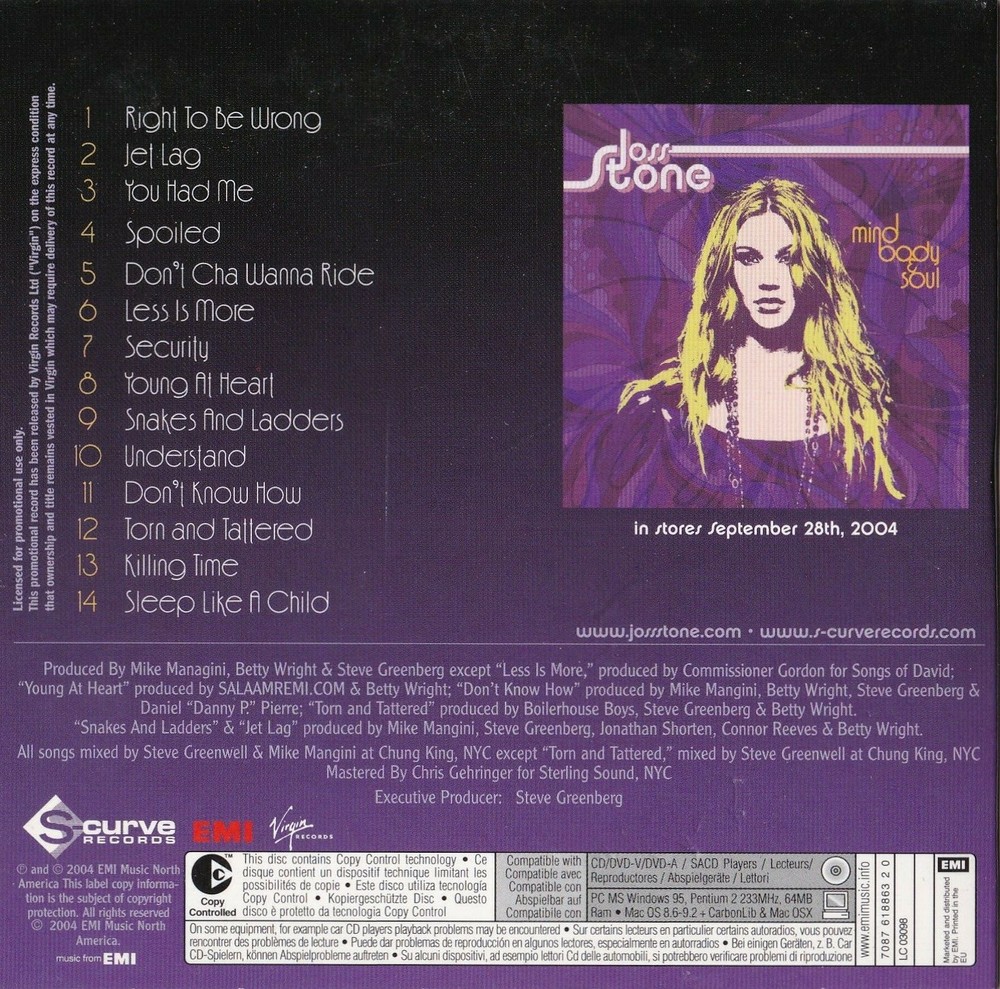 This item includes a rare Promotional Use Copy of the Mind Body Soul CD by Joss Stone. Includes 14 tracks, issued in 2004. Condition: All very good! Postage: USD 7 inside The European Union by Air Mail. Because of the current problems with the international mail this item will be sent outside EU only by Registered Mail, with a tracking code to secure the delivery of the item = USD 21.90. Payment: PayPal accepted. In Europe you can also pay directly to my bank account with IBAN and BIC numbers. Feel free to ask for other payment options as well. Delivery: Rapid delivery after the payment. 100 % satisfied buyers. Please, take also look at the other autographed items I'm selling at the moment. I'm happy to combine shipping. Genuine & Authentic: All the items I'm selling are 100 % authentic. You can see in my sales history that I'm a long-time seller and have more than 3.800 positive feedback. I have sold hundreds and hundreds of items to 100 % happy customers all over the world. I'm also giving a life-time guarantee to each and every item bought from me with a certification of authenticity. I'm selling many other autographed & Olympic items here as well. Please, take a look at my other items. I'm happy to combine shipping. Don't hesitate to contact me with any possible matters related to this item. You are also free to give your Best Offers.
