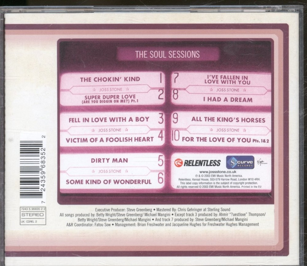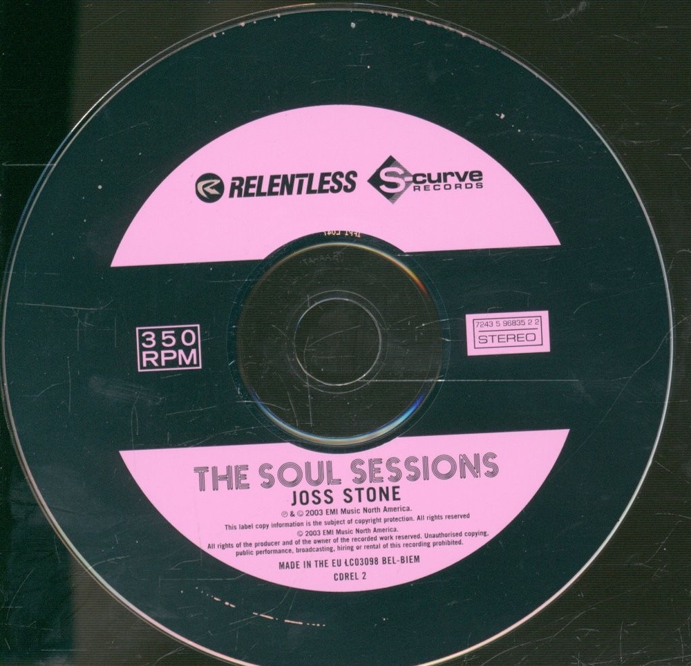 GRADING Our Grading System The table below is an overview of how our grading system works. The first grade is for the sleeve and second grade is for the media/disc, e.g. VG+/EX means that the item's sleeve is in Very Good Plus condition and the media/disc is in Excellent condition. If there is only one condition, e.g. /EX, it means that the item is not in a picture sleeve and that the media/disc is in excellent condition. Records that aren't in picture sleeves will either be in a company sleeve or a generic plain sleeve. If you have any questions, please get in touch. Condition Sleeve Media MINT (10/10) Mint, perfect Mint, perfect EX+ (9/10) Excellent plus, near mint Excellent plus, near perfect EX (8/10) Excellent, well looked after, clean, only slight signs of use Excellent, well looked after, clean, only slight signs of use EX- (7/10) Excellent minus, light wear and signs of use Excellent minus, light wear and signs of use VG+ (6/10) Very good plus, some moderate wear Very good plus, some scuffs, no deep marks VG (5/10) Very good, well used and worn Very good, well used and marked VG- (4/10) Very good minus, very worn Very good minus, very worn and marked GOOD (3/10) Good, some major wear Good, some major wear and scuffing FAIR (2/10) Fair, major wear Fair, major wear and scuffing POOR (1/10) Poor, severe wear Poor, severe wear and scuffing DELIVERY Combined Postage If you add all the items you wish to purchase from us to your shopping basket/cart, and then go to the checkout page from the shopping basket page, the shipping cost will be automatically combined. Packaging All of our items are parcelled using strong specially designed packaging, each vinyl in an order is placed in a clear plastic sleeve and plain paper white sleeve, and is separated from its cover (unless it is advertised as sealed), to prevent any damage during transit. If an item is sealed, and you would prefer the vinyl to be placed outside of its sleeve before dispatch, please let us know. Prices You can see all delivery options and prices for an item on the "Postage and payments" tab. Tracked delivery If you wish to have a tracking number with your order, please select the "Signed" or "Express" delivery option, "Standard" delivery does not include a tracking number. SHOP Click here to view our Ebay shop, with over 200,000 items in stock FAQ Does a used item include the original inner sleeve/insert/poster etc.? We will always include in the description if a used item includes any additional parts, e.g. "with inner" or "includes poster", if you know an item originally came with any additional parts, such as a printed inner sleeve, and it isn't mentioned in the description, then generally the used item won't include it, but please feel free to ask. New items will always be complete, unless otherwise specified. CATEGORIES Shop Home 10" Vinyl Records 12" Vinyl Records 7" Vinyl Records Cassettes (Tape) CDs (Compact Discs) LP Vinyl Records Music Memorabilia Other Artist Joss Stone Title Soul Session Format CD Country Europe Label Relentless Catalogue Number CDREL2 Year 2003 Description 10 track CD Condition (Sleeve/Disc) EX/EX- Track List 1. The Chokin' Kind 2. Super Duper Love (Are You Diggin On Me?) Pt.1 3. Fell In Love With A Boy 4. Victim Of A Foolish Love 5. Dirty Man 6. Some Kind Of Wonderful 7. I've Fallen In Love With You 8. I Had A Dream 9. All The King's Horses 10. For The Love Of You Pts.1&2 DELIVERY INFORMATION If you wish to have a tracking number with your order, please choose the Signed or Express delivery option, the Standard delivery option does not include a tracking number. Please note, the Express option for delivery outside of the UK includes a tracking number, but has the same delivery time as the Standard option. WE HAVE MORE JOSS STONE ITEMS IN STOCK We have more items in stock by this artist, click here to see them. ABOUT US Vinyl Tap has been in the business of selling music for over 30 years, and in that period we have supplied many thousands of collectors and music fans around the globe with vinyl, CDs and music memorabilia. You can check out the over 200,000 items that we have in stock on our Ebay shop, here . Artist: Joss Stone - Title: Soul Session - Format: CD - Country: Europe - Label: Relentless - Catalogue Number: CDREL2 - Year: 2003 - Description: 10 track CD