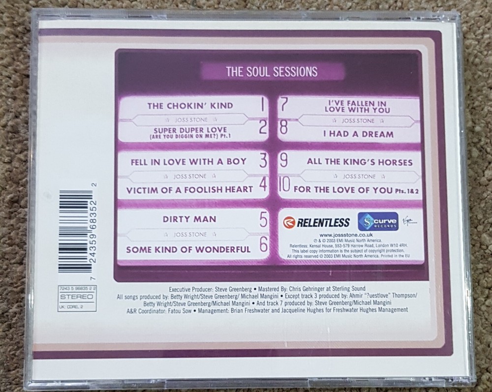 Get ready to groove with the timeless classic, Joss Stone - Soul Sessions CD (2003). This CD is a must-have for all music lovers out there who appreciate the soulful voice of the talented Joss Stone. The CD features excellent (EX) CD grading, a standard jewel case and a very good plus (VG+) case condition. In addition, the CD also boasts excellent (EX) inlay condition, making it a perfect addition to any collection. Released in 2003, this CD is a great way to relive the magic of Joss Stone's impressive voice. Don't miss out on the chance to own this musical gem!
