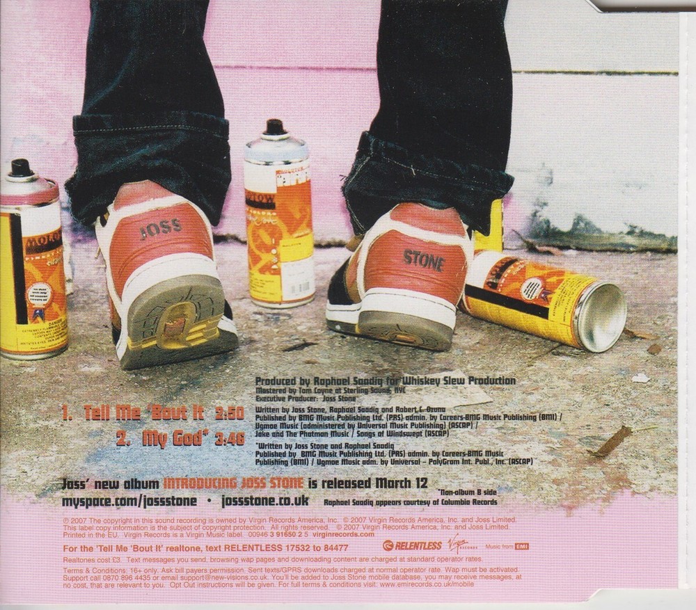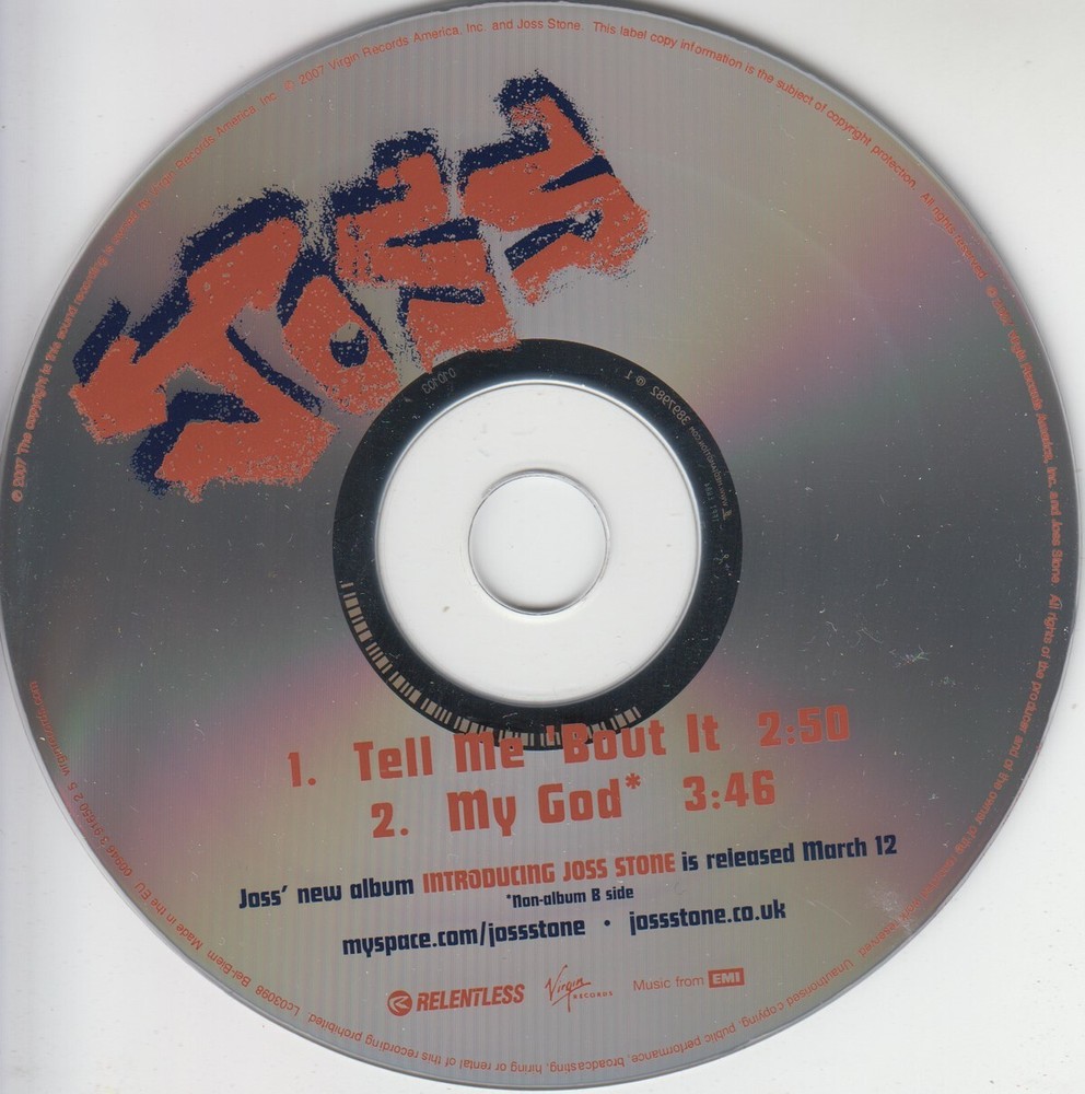 Listing Title: Joss Stone - Tell Me 'Bout It (2007) ex This item is listed under "Media > Music", please ensure it is the correct format (CD,Vinyl,Cassette etc.) you require before making a purchase. Links to other listings matched by artist are after the item description. Postage: see after item description for details. Label & Cat.no.: Relentless Records – RELCD 35 Virgin – 00946 3 91650 2 5 Relentless Records – 00946 3 91650 2 5 Picture Titles: #1 main picture #2 untitled #3 untitled #4 CD face #5 CD matrix Tracklist: 1 Tell Me 'Bout It 2:50 2 My God 3:46 Missing Information? Please contact me if any details are missing and where possible I will add the information to the listing. Postage: To UK: 1.70 Royal Mail 2nd Class To Europe: 4.48* Airmail Standard, 11.15* Airmail Tracked. *import of goods into EU are subject to VAT To US: 5.33 Airmail Standard, 12.16 Airmail Tracked To Americas, Asia, CA, JP: 5.33 Airmail Standard, 12.27 Airmail Tracked Prices are in GBP search #1 Joss Stone: 1. CDs: Joss Stone - Fell In Love With A Boy (2004) vg+ 114721266593 £1.45 Very Good 2. CDs: Joss Stone - Mind Body & Soul (2004) ex 116307832489 £3.95 Very Good 3. CDs: Joss Stone - Mind Body & Soul (2004) nm 113895782419 £4.50 Like New 4. CDs: Joss Stone - Mind Body & Soul (2004) vg 113954908706 £3.00 Very Good 5. CDs: Joss Stone - Mind Body & Soul (2004) vg+ vg1 113913940240 £3.75 Very Good 6. CDs: Joss Stone - Mind Body & Soul (2004) vg+ vg2 113913940373 £3.75 Very Good 7. CDs: Joss Stone - Right To Be Wrong (2004) vg+ 114721253983 £2.45 Very Good 8. CDs: Joss Stone - Super Duper Love (2004,CD-R,Promo) vg+ 114721338163 £2.45 Very Good 9. CDs: Joss Stone - Tell Me 'Bout It (2007) ex 114720993262 £5.15 Very Good [this listing] 10. CDs: Joss Stone - Tell Me 'Bout It (2007) nm 114720993261 £5.95 Like New 11. CDs: Joss Stone - The Soul Sessions (2003) ex ex1 113954908874 £2.80 Very Good 12. CDs: Joss Stone - The Soul Sessions (2003) ex ex2 113954909388 £2.65 Very Good 13. CDs: Joss Stone - The Soul Sessions (2003) nm nm1 113913939664 £3.45 Like New 14. CDs: Joss Stone - The Soul Sessions (2003) nm nm2 113913963563 £3.15 Like New
