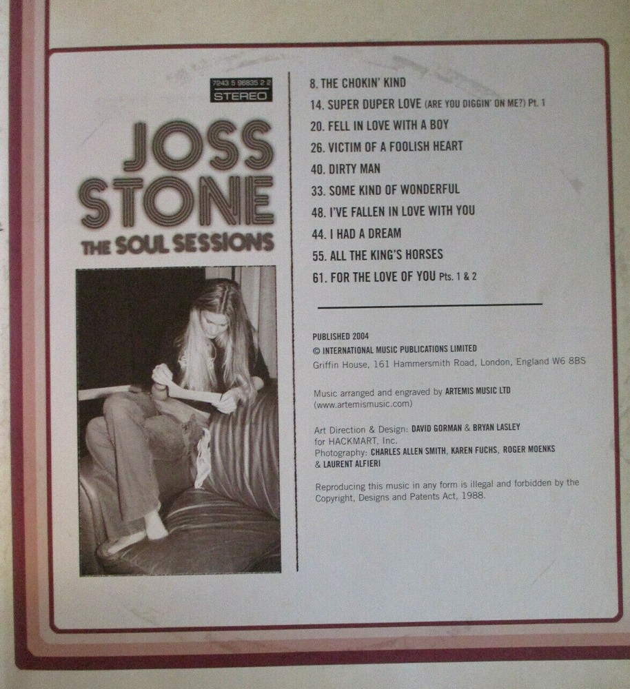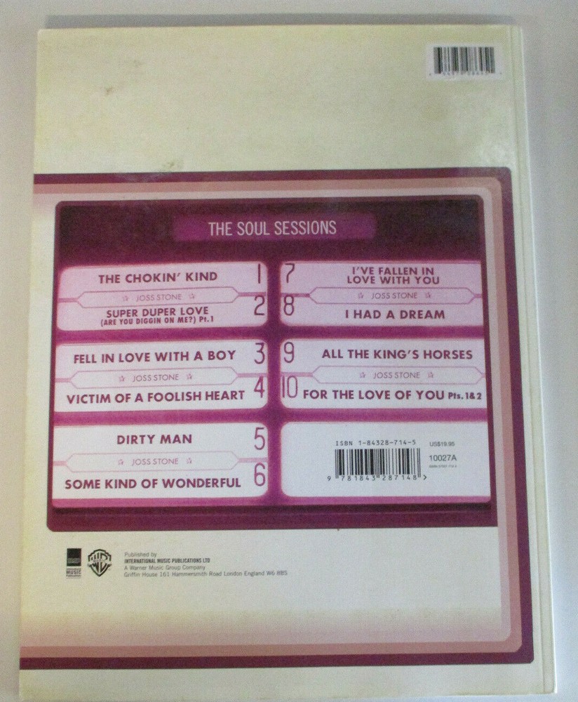 Joss Stone The Soul Sessions This book is in good second hand condition. Light wearing to the cover, edgewear. Published by International Music Publications, 2004, 66 pages. Blurb: Songs for voice, piano and guitar. ISBN ? Item weighs 279 grams. Buyer to pay postage where indicated . I will happily combine items. Please contact me prior to bidding if you have any queries.