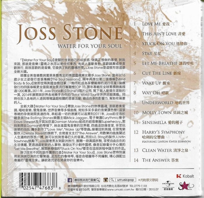 Joss Stone Water For Your Soul CD, w/ TAIWAN OBI (New & Sealed) STANDARD SHIPPING TO USA, EUROPE, SOUTH AMERICA, & ASIA (REGISTERED) EACH ADDITIONAL ITEM: $2.50