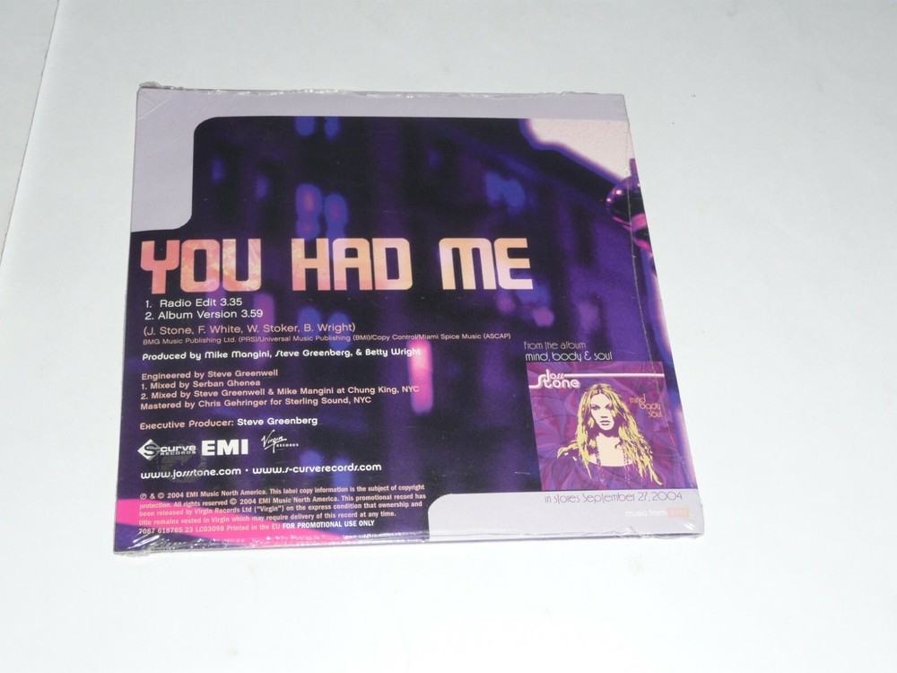 Joss Stone - You had me (PROMO CD Single ) SEALED As sealed, the CD Single and sleeve are in Excellent condition . Postage charges(including Recorded Delivery) are as follows: If you are based in the UK, £NIL (including Recorded Delivery) . If you are based in Europe, £7.00 (including Registered Post) . If you are based in the USA, Canada, Japan or Australia, £9.00 (including Registered Post) . Finally, the very best of luck with your bid.