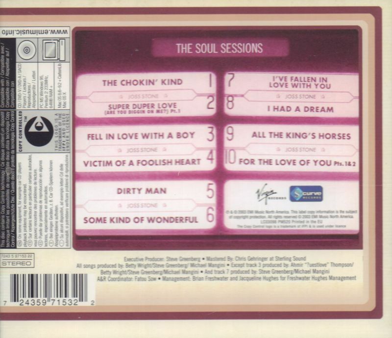 CD VINYL MEMORABILIA BOOKS CD Album Joss Stone The Soul Sessions Label: Virgin Cat No: 7243 5 97153 22 Country: EU Released: 2003 Condition: Like New Number of Track/s: 10