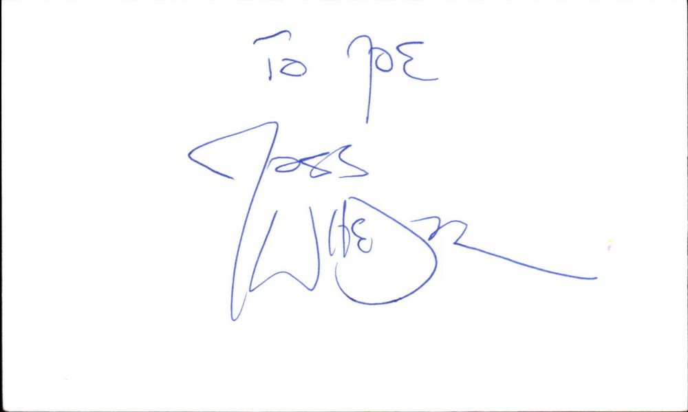 Joss Whedon Signed Auto 3x5 Index Card The Avengers Vintage Hand Signed/Authentic 3"x 5" Index Card. Most cards are Personalized "To Joe" This is part of an 20,000 signed 3"x 5" Collection we recently acquired. All originate from one collection, obtained in person in New York from the early 1950's until recently. May have some staining on card, See pictures for more detail. All autographs are guaranteed to pass PSA/DNA, JSA, or Beckett Authentication. Joss Whedon Signed Auto 3x5 Index Card The Avengers Vintage Hand Signed/Authentic 3"x 5" Index Card. Most cards are Personalized "To Joe" This is part of an 20,000 signed 3"x 5" Collection we recently acquired. All originate from one collection, obtained in person in New York from the early 1950's until recently. May have some staining on card, See pictures for more detail. All autographs are guaranteed to pass PSA/DNA, JSA, or Beckett Authentication. × Buy now and save! Shipping info Click the Shipping & Payments tab above the listing description for more info Click the Shipping & Payments tab above the listing description for more info! Additional delivery notes PICK UP OPTION Sorry, our items are NOT available for pick-up. PAYMENT Immediate payment is required upon selecting "Buy It Now" or upon checking out through the cart. We accept payment via U.S. PayPal accounts and all Major Credit Cards, Debit Cards & Google Pay. We are legally required to collect sales tax in those states and localities where we maintain a physical presence (nexus). The applicable amount of sales tax charged to an order will be calculated based on the shipment destination's state and local sales tax laws. Thank you for shopping with us on eBay! Additional Information No additional information at this time Ask seller a question You might also like Peyton Manning Signed Indianapolis Colts 8x10 Photograph - Upper Deck COA Wayne Gretzky Signed Autographed 8x10 Photograph - Beckett BAS LOA Warren Spahn Signed Perez-Steele Postcard JSA Ambroise Thomas Signed Autograph AMQS Card PSA/DNA - French Composer Contact To contact our Customer Service Team, simply click the button here and our Customer Service team will be happy to assist. Ask seller a question © Sportscards.com Shipping & Payments Click the Shipping & Payments tab above the listing description for more info Payment Accepted Payment Methods Immediate payment is required upon selecting "Buy It Now" or upon checking out through the cart. We accept payment via U.S. PayPal accounts and all Major Credit Cards, Debit Cards & Google Pay. We are legally required to collect sales tax in those states and localities where we maintain a physical presence (nexus). The applicable amount of sales tax charged to an order will be calculated based on the shipment destination's state and local sales tax laws. Thank you for shopping with us on eBay! Returns Returns are accepted Items must be returned within 30 days of the auction ending Buyer will pay for return shipping. eBay integration by