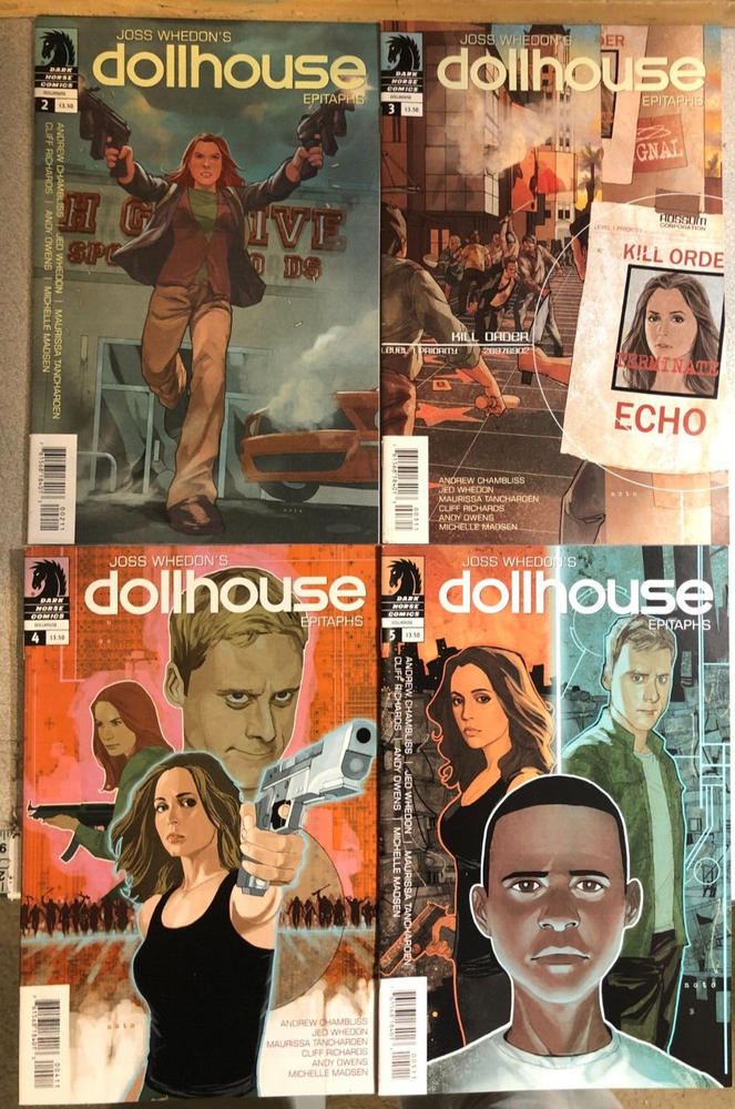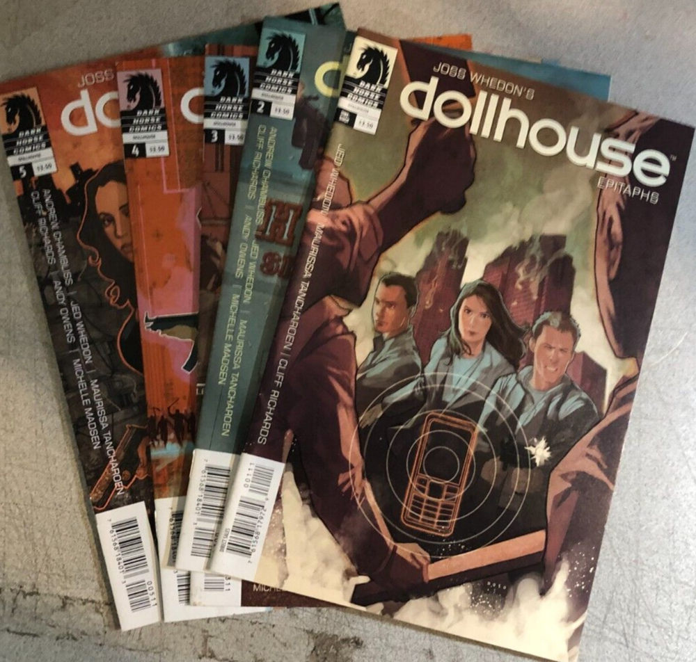 DOLLHOUSE lot of five (5) issues, as shown Dark Horse Comics (2011) MY GRADING SYSTEM FOR COMICS I try to be fair and honest in my grading, and make every attempt to mention loose pages, stains, tears, binding damage, etc. Sometimes I find that a comic falls between two grades, in which case I will list it with a two-grade scale. NEAR MINT - MINT: I rarely use these grades, except when a comic is in truly exceptional condition. VERY FINE: very nice with virtually no major defects. FINE+: an even nicer copy, with minimal obvious defects. FINE: a nice copy, flat with minor creases; may have some spine stress, but no prominent defects. FINE-: better than VG+ but just a bit short of what I would consider Fine. VERY GOOD+: most of the comics I list fall into this grade; a typical read comic with obvious defects as noted; may have light back cover stains. VERY GOOD: fairly well-read with an accumulation of tears and defects as noted; may be heavily creased or spine-rolled; back cover stains may be present. GOOD: a complete but heavily-read comic; may be missing pieces of covers, loose covers, rolled spine or other noted damage. FAIR: a rough comic, with many defects including tears. missing pieces, water damage, spine wear, etc. POOR: no missing pages unless noted, but otherwise a pretty trashed comic; almost any and every damage may be present.