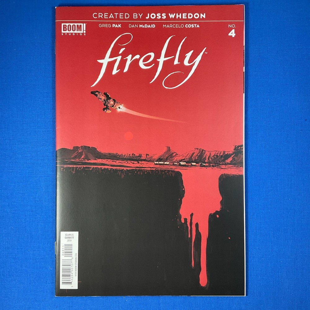 Joss Whedon's FIREFLY #4 Cover A First Printing Boom Studios 2019 Comic Book Check out my other comic book back issue listings and save with combined shipping! Cover A First Printing. Written by Greg Pak. Art by Dan McDaid. Cover by Lee Garbett. The truth about Mal and Zoe's past during the Unification War has been exposed and now the Unificators make their final move against them in the shocking conclusion to the first arc! New enemies arise, heroes fall and the crew of Serenity will pay the price.