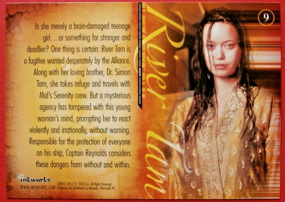 This Firefly trading card featuring River Tam is a must-have for any fan of the series! The artwork is stunning, capturing her mysterious and intense personality perfectly. As part of the 2006 Inkworks set, it’s a great addition to any collection, bringing back memories of Serenity’s wild adventures. Highly recommended for collectors and Browncoats alike!
