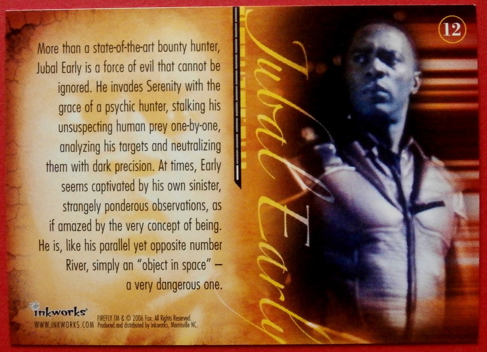 Joss Whedon's FIREFLY - Individual Card from the 72 card BASE SET issued by Inkworks in 2006. Firefly is an American space western drama television series created by writer and director Joss Whedon, under his Mutant Enemy Productions label. Whedon served as an executive producer, along with Tim Minear. The series is set in the year 2517, after the arrival of humans in a new star system and follows the adventures of the renegade crew of Serenity, a "Firefly-class" spaceship. The ensemble cast portrays the nine characters who live on Serenity. Whedon pitched the show as "nine people looking into the blackness of space and seeing nine different things". The show explores the lives of a group of people who fought on the losing side of a civil war and others who now make a living on the fringe of society, as part of the pioneer culture of their star system. In this future, the only two surviving superpowers, the United States and China, fused to form the central federal government, called the Alliance, resulting in the fusion of the two cultures. According to Whedon's vision, "nothing will change in the future: technology will advance, but we will still have the same political, moral, and ethical problems as today". Firefly premiered in the U.S. on the Fox network on September 20, 2002. By mid-December, Firefly had averaged 4.7 million viewers per episode and was 98th in Nielsen ratings. It was canceled after eleven of the fourteen produced episodes were aired. Despite the relatively short life span of the series, it received strong sales when it was released on DVD and has large fan support campaigns. It won a Primetime Emmy Award in 2003 for Outstanding Special Visual Effects for a Series. TV Guide ranked the series at No. 5 on their 2013 list of 60 shows that were "Cancelled Too Soon". The post-airing success of the show led Whedon and Universal Pictures to produce Serenity, a 2005 film which continues from the story of the series, and the Firefly franchise expanded to other media, including comics and a role-playing game. Backstory: The series takes place in the year 2517, on a variety of planets and moons. The TV series does not reveal whether these celestial bodies are within one star system, only saying that Serenity's mode of propulsion is a "gravity-drive". The film Serenity makes clear that all the planets and moons are in one large system, and production documents related to the film indicate that there is no faster-than-light travel in this universe. The characters occasionally refer to "Earth-that-was", and the film establishes that, long before the events in the series, a large population had emigrated from Earth to a new star system in generation ships: "Earth-that-was could no longer sustain our numbers, we were so many". The emigrants established themselves in this new star system, with "dozens of planets and hundreds of moons". Many of these were terraformed, a process in which a planet or moon is altered to resemble Earth. The terraforming process was only the first step in making a planet habitable, however, and the outlying settlements often did not receive any further support in the construction of their civilizations. This resulted in many of the border planets and moons having forbidding, dry environments, well-suited to the Western genre. Synopsis: The show takes its name from the "Firefly-class" spaceship, Serenity, that the central characters call home. It resembles a firefly in general arrangement, and the tail section, analogous to a bioluminescent insectoid abdomen, lights up during acceleration. The ship was named after the Battle of Serenity Valley, where Mal and Zoe were on the losing side. It is revealed in "Bushwhacked" that the Battle of Serenity Valley is widely considered the loss which sealed the fate of the Independents. Throughout the series, the Alliance is shown to govern the star system through an organization of "core" planets, following its success in forcibly unifying all the colonies under a single government. DVD commentary suggests that the Alliance is composed of two primary "core" systems, one predominantly Western in culture, the other pan-Asian, justifying the mixed linguistic and visual themes of the series. The central planets are firmly under Alliance control, but the outlying planets and moons resemble the 19th-century American West, with little governmental authority. Settlers and refugees on the outlying worlds have relative freedom from the central government, but lack the amenities of the high-tech civilization that exists on the inner worlds. In addition, the outlying areas of space ("the black") are inhabited by the Reavers, a cannibalistic group of nomadic humans that have become savage and animalistic. The captain of the crew of Serenity is Malcolm "Mal" Reynolds (Nathan Fillion) and the episode "Serenity" establishes that the captain and his first mate Zoe Washburne (Gina Torres) are veteran "Browncoats" of the Unification War, a failed attempt by the outlying worlds to resist the Alliance's assertion of control. A later episode, titled "Out of Gas", reveals that Mal bought the spaceship Serenity to continue living beyond Alliance control. Much of the crew's work consists of cargo runs or smuggling. One of the main story arcs is that of River Tam (Summer Glau) and her brother Simon (Sean Maher). River is a child prodigy, whose brain was subjected to experiments at the hands of Alliance scientists at a secret government institution. As a result, she displays schizophrenia and often hears voices. It is later revealed that she is a "reader", one who possesses telepathic abilities. Simon gave up a career as a highly successful trauma surgeon to rescue her from the Alliance, and as a result of this rescue they are both wanted fugitives. In the original pilot "Serenity", Simon joins the crew as a paying passenger with River smuggled on board as cargo. As Whedon states in an episodic DVD commentary, every show he does is about creati