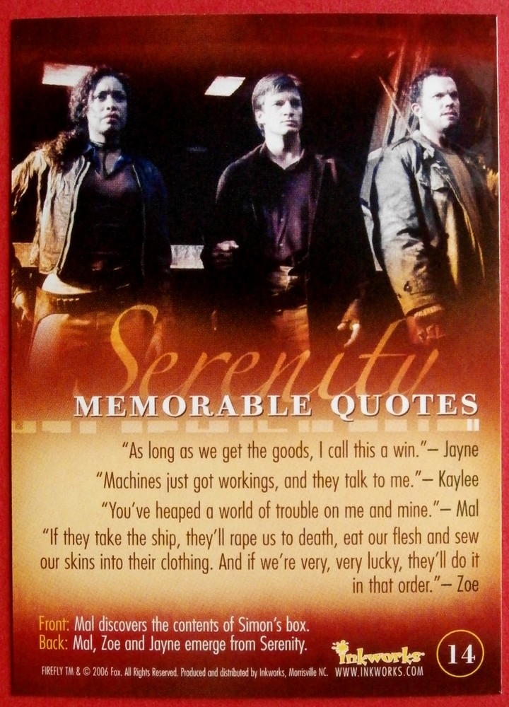 Joss Whedon's FIREFLY - Individual Card from the 72 card BASE SET issued by Inkworks in 2006. Firefly is an American space western drama television series created by writer and director Joss Whedon, under his Mutant Enemy Productions label. Whedon served as an executive producer, along with Tim Minear. The series is set in the year 2517, after the arrival of humans in a new star system and follows the adventures of the renegade crew of Serenity, a "Firefly-class" spaceship. The ensemble cast portrays the nine characters who live on Serenity. Whedon pitched the show as "nine people looking into the blackness of space and seeing nine different things". The show explores the lives of a group of people who fought on the losing side of a civil war and others who now make a living on the fringe of society, as part of the pioneer culture of their star system. In this future, the only two surviving superpowers, the United States and China, fused to form the central federal government, called the Alliance, resulting in the fusion of the two cultures. According to Whedon's vision, "nothing will change in the future: technology will advance, but we will still have the same political, moral, and ethical problems as today". Firefly premiered in the U.S. on the Fox network on September 20, 2002. By mid-December, Firefly had averaged 4.7 million viewers per episode and was 98th in Nielsen ratings. It was canceled after eleven of the fourteen produced episodes were aired. Despite the relatively short life span of the series, it received strong sales when it was released on DVD and has large fan support campaigns. It won a Primetime Emmy Award in 2003 for Outstanding Special Visual Effects for a Series. TV Guide ranked the series at No. 5 on their 2013 list of 60 shows that were "Cancelled Too Soon". The post-airing success of the show led Whedon and Universal Pictures to produce Serenity, a 2005 film which continues from the story of the series, and the Firefly franchise expanded to other media, including comics and a role-playing game. Backstory: The series takes place in the year 2517, on a variety of planets and moons. The TV series does not reveal whether these celestial bodies are within one star system, only saying that Serenity's mode of propulsion is a "gravity-drive". The film Serenity makes clear that all the planets and moons are in one large system, and production documents related to the film indicate that there is no faster-than-light travel in this universe. The characters occasionally refer to "Earth-that-was", and the film establishes that, long before the events in the series, a large population had emigrated from Earth to a new star system in generation ships: "Earth-that-was could no longer sustain our numbers, we were so many". The emigrants established themselves in this new star system, with "dozens of planets and hundreds of moons". Many of these were terraformed, a process in which a planet or moon is altered to resemble Earth. The terraforming process was only the first step in making a planet habitable, however, and the outlying settlements often did not receive any further support in the construction of their civilizations. This resulted in many of the border planets and moons having forbidding, dry environments, well-suited to the Western genre. Synopsis: The show takes its name from the "Firefly-class" spaceship, Serenity, that the central characters call home. It resembles a firefly in general arrangement, and the tail section, analogous to a bioluminescent insectoid abdomen, lights up during acceleration. The ship was named after the Battle of Serenity Valley, where Mal and Zoe were on the losing side. It is revealed in "Bushwhacked" that the Battle of Serenity Valley is widely considered the loss which sealed the fate of the Independents. Throughout the series, the Alliance is shown to govern the star system through an organization of "core" planets, following its success in forcibly unifying all the colonies under a single government. DVD commentary suggests that the Alliance is composed of two primary "core" systems, one predominantly Western in culture, the other pan-Asian, justifying the mixed linguistic and visual themes of the series. The central planets are firmly under Alliance control, but the outlying planets and moons resemble the 19th-century American West, with little governmental authority. Settlers and refugees on the outlying worlds have relative freedom from the central government, but lack the amenities of the high-tech civilization that exists on the inner worlds. In addition, the outlying areas of space ("the black") are inhabited by the Reavers, a cannibalistic group of nomadic humans that have become savage and animalistic. The captain of the crew of Serenity is Malcolm "Mal" Reynolds (Nathan Fillion) and the episode "Serenity" establishes that the captain and his first mate Zoe Washburne (Gina Torres) are veteran "Browncoats" of the Unification War, a failed attempt by the outlying worlds to resist the Alliance's assertion of control. A later episode, titled "Out of Gas", reveals that Mal bought the spaceship Serenity to continue living beyond Alliance control. Much of the crew's work consists of cargo runs or smuggling. One of the main story arcs is that of River Tam (Summer Glau) and her brother Simon (Sean Maher). River is a child prodigy, whose brain was subjected to experiments at the hands of Alliance scientists at a secret government institution. As a result, she displays schizophrenia and often hears voices. It is later revealed that she is a "reader", one who possesses telepathic abilities. Simon gave up a career as a highly successful trauma surgeon to rescue her from the Alliance, and as a result of this rescue they are both wanted fugitives. In the original pilot "Serenity", Simon joins the crew as a paying passenger with River smuggled on board as cargo. As Whedon states in an episodic DVD commentary, every show he does is about creati