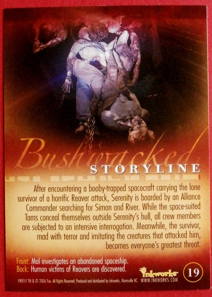 Joss Whedon's FIREFLY - Individual Card from the 72 card BASE SET issued by Inkworks in 2006. Firefly is an American space western drama television series created by writer and director Joss Whedon, under his Mutant Enemy Productions label. Whedon served as an executive producer, along with Tim Minear. The series is set in the year 2517, after the arrival of humans in a new star system and follows the adventures of the renegade crew of Serenity, a "Firefly-class" spaceship. The ensemble cast portrays the nine characters who live on Serenity. Whedon pitched the show as "nine people looking into the blackness of space and seeing nine different things". The show explores the lives of a group of people who fought on the losing side of a civil war and others who now make a living on the fringe of society, as part of the pioneer culture of their star system. In this future, the only two surviving superpowers, the United States and China, fused to form the central federal government, called the Alliance, resulting in the fusion of the two cultures. According to Whedon's vision, "nothing will change in the future: technology will advance, but we will still have the same political, moral, and ethical problems as today". Firefly premiered in the U.S. on the Fox network on September 20, 2002. By mid-December, Firefly had averaged 4.7 million viewers per episode and was 98th in Nielsen ratings. It was canceled after eleven of the fourteen produced episodes were aired. Despite the relatively short life span of the series, it received strong sales when it was released on DVD and has large fan support campaigns. It won a Primetime Emmy Award in 2003 for Outstanding Special Visual Effects for a Series. TV Guide ranked the series at No. 5 on their 2013 list of 60 shows that were "Cancelled Too Soon". The post-airing success of the show led Whedon and Universal Pictures to produce Serenity, a 2005 film which continues from the story of the series, and the Firefly franchise expanded to other media, including comics and a role-playing game. Backstory: The series takes place in the year 2517, on a variety of planets and moons. The TV series does not reveal whether these celestial bodies are within one star system, only saying that Serenity's mode of propulsion is a "gravity-drive". The film Serenity makes clear that all the planets and moons are in one large system, and production documents related to the film indicate that there is no faster-than-light travel in this universe. The characters occasionally refer to "Earth-that-was", and the film establishes that, long before the events in the series, a large population had emigrated from Earth to a new star system in generation ships: "Earth-that-was could no longer sustain our numbers, we were so many". The emigrants established themselves in this new star system, with "dozens of planets and hundreds of moons". Many of these were terraformed, a process in which a planet or moon is altered to resemble Earth. The terraforming process was only the first step in making a planet habitable, however, and the outlying settlements often did not receive any further support in the construction of their civilizations. This resulted in many of the border planets and moons having forbidding, dry environments, well-suited to the Western genre. Synopsis: The show takes its name from the "Firefly-class" spaceship, Serenity, that the central characters call home. It resembles a firefly in general arrangement, and the tail section, analogous to a bioluminescent insectoid abdomen, lights up during acceleration. The ship was named after the Battle of Serenity Valley, where Mal and Zoe were on the losing side. It is revealed in "Bushwhacked" that the Battle of Serenity Valley is widely considered the loss which sealed the fate of the Independents. Throughout the series, the Alliance is shown to govern the star system through an organization of "core" planets, following its success in forcibly unifying all the colonies under a single government. DVD commentary suggests that the Alliance is composed of two primary "core" systems, one predominantly Western in culture, the other pan-Asian, justifying the mixed linguistic and visual themes of the series. The central planets are firmly under Alliance control, but the outlying planets and moons resemble the 19th-century American West, with little governmental authority. Settlers and refugees on the outlying worlds have relative freedom from the central government, but lack the amenities of the high-tech civilization that exists on the inner worlds. In addition, the outlying areas of space ("the black") are inhabited by the Reavers, a cannibalistic group of nomadic humans that have become savage and animalistic. The captain of the crew of Serenity is Malcolm "Mal" Reynolds (Nathan Fillion) and the episode "Serenity" establishes that the captain and his first mate Zoe Washburne (Gina Torres) are veteran "Browncoats" of the Unification War, a failed attempt by the outlying worlds to resist the Alliance's assertion of control. A later episode, titled "Out of Gas", reveals that Mal bought the spaceship Serenity to continue living beyond Alliance control. Much of the crew's work consists of cargo runs or smuggling. One of the main story arcs is that of River Tam (Summer Glau) and her brother Simon (Sean Maher). River is a child prodigy, whose brain was subjected to experiments at the hands of Alliance scientists at a secret government institution. As a result, she displays schizophrenia and often hears voices. It is later revealed that she is a "reader", one who possesses telepathic abilities. Simon gave up a career as a highly successful trauma surgeon to rescue her from the Alliance, and as a result of this rescue they are both wanted fugitives. In the original pilot "Serenity", Simon joins the crew as a paying passenger with River smuggled on board as cargo. As Whedon states in an episodic DVD commentary, every show he does is about creati