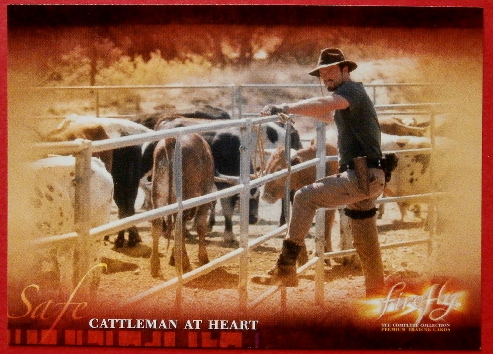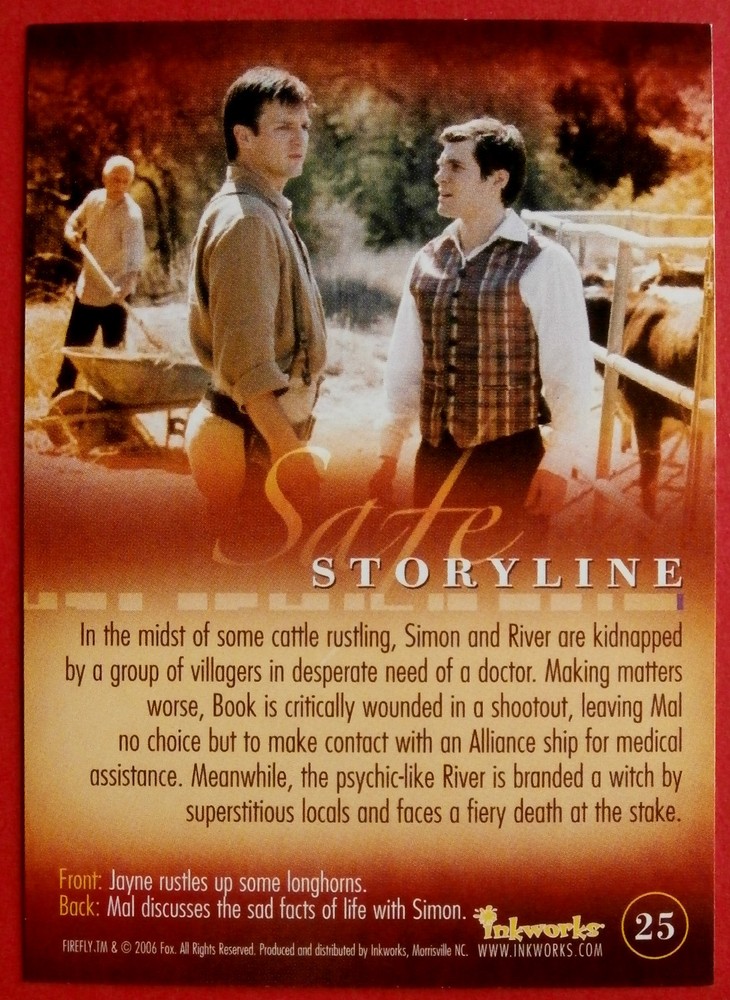 Joss Whedon's FIREFLY - Individual Card from the 72 card SET issued by Inkworks in 2006. Firefly is an American space western drama television series created by writer and director Joss Whedon, under his Mutant Enemy Productions label. Whedon served as an executive producer, along with Tim Minear. The series is set in the year 2517, after the arrival of humans in a new star system and follows the adventures of the renegade crew of Serenity, a "Firefly-class" spaceship. The ensemble cast portrays the nine characters who live on Serenity. Whedon pitched the show as "nine people looking into the blackness of space and seeing nine different things". The show explores the lives of a group of people who fought on the losing side of a civil war and others who now make a living on the fringe of society, as part of the pioneer culture of their star system. In this future, the only two surviving superpowers, the United States and China, fused to form the central federal government, called the Alliance, resulting in the fusion of the two cultures. According to Whedon's vision, "nothing will change in the future: technology will advance, but we will still have the same political, moral, and ethical problems as today". Firefly premiered in the U.S. on the Fox network on September 20, 2002. By mid-December, Firefly had averaged 4.7 million viewers per episode and was 98th in Nielsen ratings. It was canceled after eleven of the fourteen produced episodes were aired. Despite the relatively short life span of the series, it received strong sales when it was released on DVD and has large fan support campaigns. It won a Primetime Emmy Award in 2003 for Outstanding Special Visual Effects for a Series. TV Guide ranked the series at No. 5 on their 2013 list of 60 shows that were "Cancelled Too Soon". The post-airing success of the show led Whedon and Universal Pictures to produce Serenity, a 2005 film which continues from the story of the series, and the Firefly franchise expanded to other media, including comics and a role-playing game. Backstory: The series takes place in the year 2517, on a variety of planets and moons. The TV series does not reveal whether these celestial bodies are within one star system, only saying that Serenity's mode of propulsion is a "gravity-drive". The film Serenity makes clear that all the planets and moons are in one large system, and production documents related to the film indicate that there is no faster-than-light travel in this universe. The characters occasionally refer to "Earth-that-was", and the film establishes that, long before the events in the series, a large population had emigrated from Earth to a new star system in generation ships: "Earth-that-was could no longer sustain our numbers, we were so many". The emigrants established themselves in this new star system, with "dozens of planets and hundreds of moons". Many of these were terraformed, a process in which a planet or moon is altered to resemble Earth. The terraforming process was only the first step in making a planet habitable, however, and the outlying settlements often did not receive any further support in the construction of their civilizations. This resulted in many of the border planets and moons having forbidding, dry environments, well-suited to the Western genre. Synopsis: The show takes its name from the "Firefly-class" spaceship, Serenity, that the central characters call home. It resembles a firefly in general arrangement, and the tail section, analogous to a bioluminescent insectoid abdomen, lights up during acceleration. The ship was named after the Battle of Serenity Valley, where Mal and Zoe were on the losing side. It is revealed in "Bushwhacked" that the Battle of Serenity Valley is widely considered the loss which sealed the fate of the Independents. Throughout the series, the Alliance is shown to govern the star system through an organization of "core" planets, following its success in forcibly unifying all the colonies under a single government. DVD commentary suggests that the Alliance is composed of two primary "core" systems, one predominantly Western in culture, the other pan-Asian, justifying the mixed linguistic and visual themes of the series. The central planets are firmly under Alliance control, but the outlying planets and moons resemble the 19th-century American West, with little governmental authority. Settlers and refugees on the outlying worlds have relative freedom from the central government, but lack the amenities of the high-tech civilization that exists on the inner worlds. In addition, the outlying areas of space ("the black") are inhabited by the Reavers, a cannibalistic group of nomadic humans that have become savage and animalistic. The captain of the crew of Serenity is Malcolm "Mal" Reynolds (Nathan Fillion) and the episode "Serenity" establishes that the captain and his first mate Zoe Washburne (Gina Torres) are veteran "Browncoats" of the Unification War, a failed attempt by the outlying worlds to resist the Alliance's assertion of control. A later episode, titled "Out of Gas", reveals that Mal bought the spaceship Serenity to continue living beyond Alliance control. Much of the crew's work consists of cargo runs or smuggling. One of the main story arcs is that of River Tam (Summer Glau) and her brother Simon (Sean Maher). River is a child prodigy, whose brain was subjected to experiments at the hands of Alliance scientists at a secret government institution. As a result, she displays schizophrenia and often hears voices. It is later revealed that she is a "reader", one who possesses telepathic abilities. Simon gave up a career as a highly successful trauma surgeon to rescue her from the Alliance, and as a result of this rescue they are both wanted fugitives. In the original pilot "Serenity", Simon joins the crew as a paying passenger with River smuggled on board as cargo. As Whedon states in an episodic DVD commentary, every show he does is about creating fa