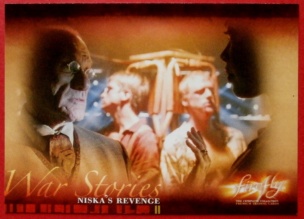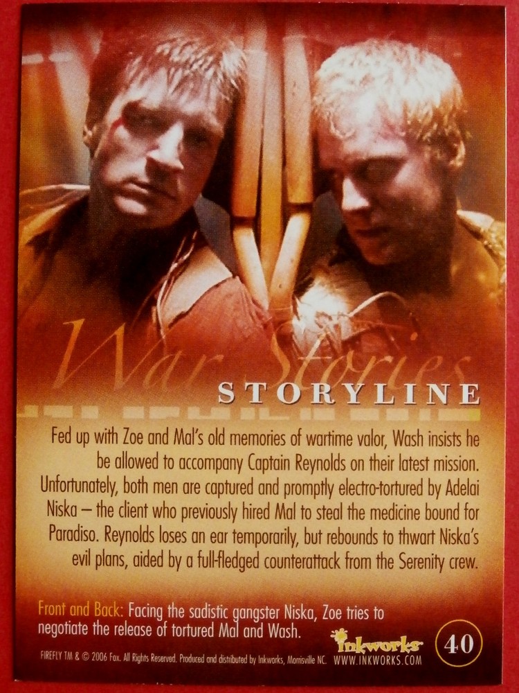 Joss Whedon's FIREFLY - Individual Card from the 72 card BASE SET issued by Inkworks in 2006. Firefly is an American space western drama television series created by writer and director Joss Whedon, under his Mutant Enemy Productions label. Whedon served as an executive producer, along with Tim Minear. The series is set in the year 2517, after the arrival of humans in a new star system and follows the adventures of the renegade crew of Serenity, a "Firefly-class" spaceship. The ensemble cast portrays the nine characters who live on Serenity. Whedon pitched the show as "nine people looking into the blackness of space and seeing nine different things". The show explores the lives of a group of people who fought on the losing side of a civil war and others who now make a living on the fringe of society, as part of the pioneer culture of their star system. In this future, the only two surviving superpowers, the United States and China, fused to form the central federal government, called the Alliance, resulting in the fusion of the two cultures. According to Whedon's vision, "nothing will change in the future: technology will advance, but we will still have the same political, moral, and ethical problems as today". Firefly premiered in the U.S. on the Fox network on September 20, 2002. By mid-December, Firefly had averaged 4.7 million viewers per episode and was 98th in Nielsen ratings. It was canceled after eleven of the fourteen produced episodes were aired. Despite the relatively short life span of the series, it received strong sales when it was released on DVD and has large fan support campaigns. It won a Primetime Emmy Award in 2003 for Outstanding Special Visual Effects for a Series. TV Guide ranked the series at No. 5 on their 2013 list of 60 shows that were "Cancelled Too Soon". The post-airing success of the show led Whedon and Universal Pictures to produce Serenity, a 2005 film which continues from the story of the series, and the Firefly franchise expanded to other media, including comics and a role-playing game. Backstory: The series takes place in the year 2517, on a variety of planets and moons. The TV series does not reveal whether these celestial bodies are within one star system, only saying that Serenity's mode of propulsion is a "gravity-drive". The film Serenity makes clear that all the planets and moons are in one large system, and production documents related to the film indicate that there is no faster-than-light travel in this universe. The characters occasionally refer to "Earth-that-was", and the film establishes that, long before the events in the series, a large population had emigrated from Earth to a new star system in generation ships: "Earth-that-was could no longer sustain our numbers, we were so many". The emigrants established themselves in this new star system, with "dozens of planets and hundreds of moons". Many of these were terraformed, a process in which a planet or moon is altered to resemble Earth. The terraforming process was only the first step in making a planet habitable, however, and the outlying settlements often did not receive any further support in the construction of their civilizations. This resulted in many of the border planets and moons having forbidding, dry environments, well-suited to the Western genre. Synopsis: The show takes its name from the "Firefly-class" spaceship, Serenity, that the central characters call home. It resembles a firefly in general arrangement, and the tail section, analogous to a bioluminescent insectoid abdomen, lights up during acceleration. The ship was named after the Battle of Serenity Valley, where Mal and Zoe were on the losing side. It is revealed in "Bushwhacked" that the Battle of Serenity Valley is widely considered the loss which sealed the fate of the Independents. Throughout the series, the Alliance is shown to govern the star system through an organization of "core" planets, following its success in forcibly unifying all the colonies under a single government. DVD commentary suggests that the Alliance is composed of two primary "core" systems, one predominantly Western in culture, the other pan-Asian, justifying the mixed linguistic and visual themes of the series. The central planets are firmly under Alliance control, but the outlying planets and moons resemble the 19th-century American West, with little governmental authority. Settlers and refugees on the outlying worlds have relative freedom from the central government, but lack the amenities of the high-tech civilization that exists on the inner worlds. In addition, the outlying areas of space ("the black") are inhabited by the Reavers, a cannibalistic group of nomadic humans that have become savage and animalistic. The captain of the crew of Serenity is Malcolm "Mal" Reynolds (Nathan Fillion) and the episode "Serenity" establishes that the captain and his first mate Zoe Washburne (Gina Torres) are veteran "Browncoats" of the Unification War, a failed attempt by the outlying worlds to resist the Alliance's assertion of control. A later episode, titled "Out of Gas", reveals that Mal bought the spaceship Serenity to continue living beyond Alliance control. Much of the crew's work consists of cargo runs or smuggling. One of the main story arcs is that of River Tam (Summer Glau) and her brother Simon (Sean Maher). River is a child prodigy, whose brain was subjected to experiments at the hands of Alliance scientists at a secret government institution. As a result, she displays schizophrenia and often hears voices. It is later revealed that she is a "reader", one who possesses telepathic abilities. Simon gave up a career as a highly successful trauma surgeon to rescue her from the Alliance, and as a result of this rescue they are both wanted fugitives. In the original pilot "Serenity", Simon joins the crew as a paying passenger with River smuggled on board as cargo. As Whedon states in an episodic DVD commentary, every show he does is about creati