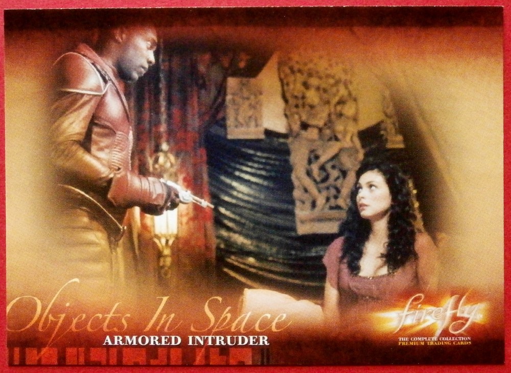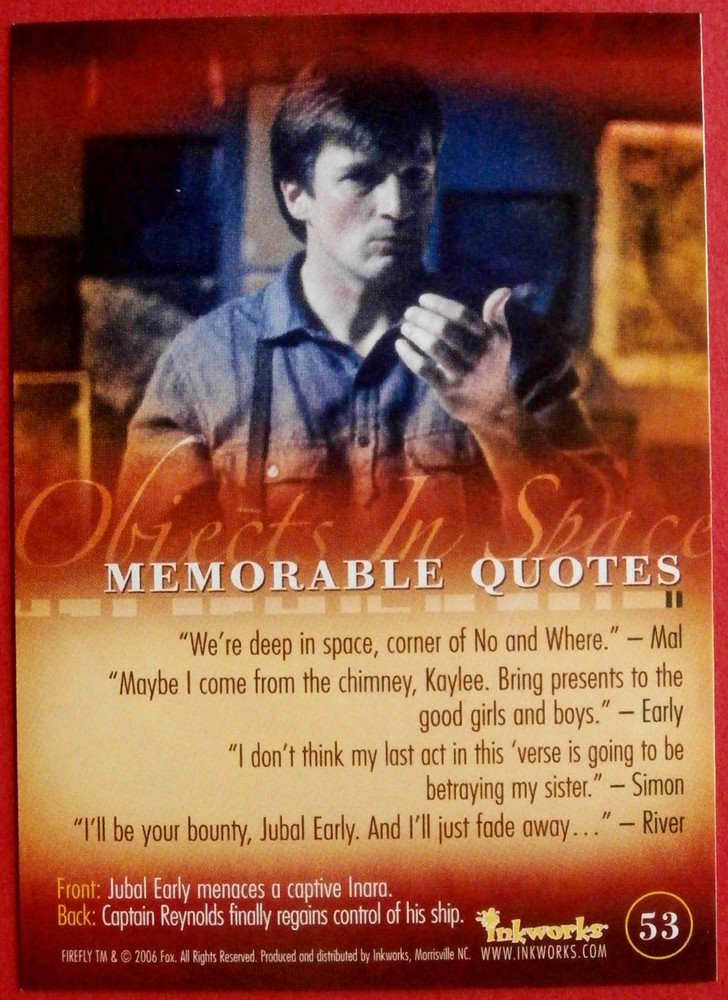 Joss Whedon's FIREFLY - Individual Card from the 72 card BASE SET issued by Inkworks in 2006. Firefly is an American space western drama television series created by writer and director Joss Whedon, under his Mutant Enemy Productions label. Whedon served as an executive producer, along with Tim Minear. The series is set in the year 2517, after the arrival of humans in a new star system and follows the adventures of the renegade crew of Serenity, a "Firefly-class" spaceship. The ensemble cast portrays the nine characters who live on Serenity. Whedon pitched the show as "nine people looking into the blackness of space and seeing nine different things". The show explores the lives of a group of people who fought on the losing side of a civil war and others who now make a living on the fringe of society, as part of the pioneer culture of their star system. In this future, the only two surviving superpowers, the United States and China, fused to form the central federal government, called the Alliance, resulting in the fusion of the two cultures. According to Whedon's vision, "nothing will change in the future: technology will advance, but we will still have the same political, moral, and ethical problems as today". Firefly premiered in the U.S. on the Fox network on September 20, 2002. By mid-December, Firefly had averaged 4.7 million viewers per episode and was 98th in Nielsen ratings. It was canceled after eleven of the fourteen produced episodes were aired. Despite the relatively short life span of the series, it received strong sales when it was released on DVD and has large fan support campaigns. It won a Primetime Emmy Award in 2003 for Outstanding Special Visual Effects for a Series. TV Guide ranked the series at No. 5 on their 2013 list of 60 shows that were "Cancelled Too Soon". The post-airing success of the show led Whedon and Universal Pictures to produce Serenity, a 2005 film which continues from the story of the series, and the Firefly franchise expanded to other media, including comics and a role-playing game. Backstory: The series takes place in the year 2517, on a variety of planets and moons. The TV series does not reveal whether these celestial bodies are within one star system, only saying that Serenity's mode of propulsion is a "gravity-drive". The film Serenity makes clear that all the planets and moons are in one large system, and production documents related to the film indicate that there is no faster-than-light travel in this universe. The characters occasionally refer to "Earth-that-was", and the film establishes that, long before the events in the series, a large population had emigrated from Earth to a new star system in generation ships: "Earth-that-was could no longer sustain our numbers, we were so many". The emigrants established themselves in this new star system, with "dozens of planets and hundreds of moons". Many of these were terraformed, a process in which a planet or moon is altered to resemble Earth. The terraforming process was only the first step in making a planet habitable, however, and the outlying settlements often did not receive any further support in the construction of their civilizations. This resulted in many of the border planets and moons having forbidding, dry environments, well-suited to the Western genre. Synopsis: The show takes its name from the "Firefly-class" spaceship, Serenity, that the central characters call home. It resembles a firefly in general arrangement, and the tail section, analogous to a bioluminescent insectoid abdomen, lights up during acceleration. The ship was named after the Battle of Serenity Valley, where Mal and Zoe were on the losing side. It is revealed in "Bushwhacked" that the Battle of Serenity Valley is widely considered the loss which sealed the fate of the Independents. Throughout the series, the Alliance is shown to govern the star system through an organization of "core" planets, following its success in forcibly unifying all the colonies under a single government. DVD commentary suggests that the Alliance is composed of two primary "core" systems, one predominantly Western in culture, the other pan-Asian, justifying the mixed linguistic and visual themes of the series. The central planets are firmly under Alliance control, but the outlying planets and moons resemble the 19th-century American West, with little governmental authority. Settlers and refugees on the outlying worlds have relative freedom from the central government, but lack the amenities of the high-tech civilization that exists on the inner worlds. In addition, the outlying areas of space ("the black") are inhabited by the Reavers, a cannibalistic group of nomadic humans that have become savage and animalistic. The captain of the crew of Serenity is Malcolm "Mal" Reynolds (Nathan Fillion) and the episode "Serenity" establishes that the captain and his first mate Zoe Washburne (Gina Torres) are veteran "Browncoats" of the Unification War, a failed attempt by the outlying worlds to resist the Alliance's assertion of control. A later episode, titled "Out of Gas", reveals that Mal bought the spaceship Serenity to continue living beyond Alliance control. Much of the crew's work consists of cargo runs or smuggling. One of the main story arcs is that of River Tam (Summer Glau) and her brother Simon (Sean Maher). River is a child prodigy, whose brain was subjected to experiments at the hands of Alliance scientists at a secret government institution. As a result, she displays schizophrenia and often hears voices. It is later revealed that she is a "reader", one who possesses telepathic abilities. Simon gave up a career as a highly successful trauma surgeon to rescue her from the Alliance, and as a result of this rescue they are both wanted fugitives. In the original pilot "Serenity", Simon joins the crew as a paying passenger with River smuggled on board as cargo. As Whedon states in an episodic DVD commentary, every show he does is about creati