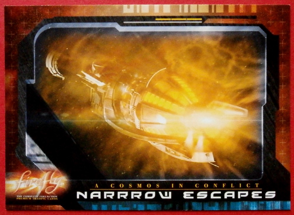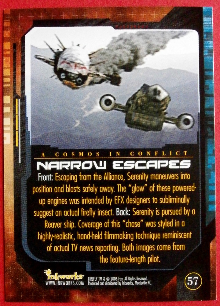Joss Whedon's FIREFLY - Individual Card from the 72 card BASE SET issued by Inkworks in 2006. Firefly is an American space western drama television series created by writer and director Joss Whedon, under his Mutant Enemy Productions label. Whedon served as an executive producer, along with Tim Minear. The series is set in the year 2517, after the arrival of humans in a new star system and follows the adventures of the renegade crew of Serenity, a "Firefly-class" spaceship. The ensemble cast portrays the nine characters who live on Serenity. Whedon pitched the show as "nine people looking into the blackness of space and seeing nine different things". The show explores the lives of a group of people who fought on the losing side of a civil war and others who now make a living on the fringe of society, as part of the pioneer culture of their star system. In this future, the only two surviving superpowers, the United States and China, fused to form the central federal government, called the Alliance, resulting in the fusion of the two cultures. According to Whedon's vision, "nothing will change in the future: technology will advance, but we will still have the same political, moral, and ethical problems as today". Firefly premiered in the U.S. on the Fox network on September 20, 2002. By mid-December, Firefly had averaged 4.7 million viewers per episode and was 98th in Nielsen ratings. It was canceled after eleven of the fourteen produced episodes were aired. Despite the relatively short life span of the series, it received strong sales when it was released on DVD and has large fan support campaigns. It won a Primetime Emmy Award in 2003 for Outstanding Special Visual Effects for a Series. TV Guide ranked the series at No. 5 on their 2013 list of 60 shows that were "Cancelled Too Soon". The post-airing success of the show led Whedon and Universal Pictures to produce Serenity, a 2005 film which continues from the story of the series, and the Firefly franchise expanded to other media, including comics and a role-playing game. Backstory: The series takes place in the year 2517, on a variety of planets and moons. The TV series does not reveal whether these celestial bodies are within one star system, only saying that Serenity's mode of propulsion is a "gravity-drive". The film Serenity makes clear that all the planets and moons are in one large system, and production documents related to the film indicate that there is no faster-than-light travel in this universe. The characters occasionally refer to "Earth-that-was", and the film establishes that, long before the events in the series, a large population had emigrated from Earth to a new star system in generation ships: "Earth-that-was could no longer sustain our numbers, we were so many". The emigrants established themselves in this new star system, with "dozens of planets and hundreds of moons". Many of these were terraformed, a process in which a planet or moon is altered to resemble Earth. The terraforming process was only the first step in making a planet habitable, however, and the outlying settlements often did not receive any further support in the construction of their civilizations. This resulted in many of the border planets and moons having forbidding, dry environments, well-suited to the Western genre. Synopsis: The show takes its name from the "Firefly-class" spaceship, Serenity, that the central characters call home. It resembles a firefly in general arrangement, and the tail section, analogous to a bioluminescent insectoid abdomen, lights up during acceleration. The ship was named after the Battle of Serenity Valley, where Mal and Zoe were on the losing side. It is revealed in "Bushwhacked" that the Battle of Serenity Valley is widely considered the loss which sealed the fate of the Independents. Throughout the series, the Alliance is shown to govern the star system through an organization of "core" planets, following its success in forcibly unifying all the colonies under a single government. DVD commentary suggests that the Alliance is composed of two primary "core" systems, one predominantly Western in culture, the other pan-Asian, justifying the mixed linguistic and visual themes of the series. The central planets are firmly under Alliance control, but the outlying planets and moons resemble the 19th-century American West, with little governmental authority. Settlers and refugees on the outlying worlds have relative freedom from the central government, but lack the amenities of the high-tech civilization that exists on the inner worlds. In addition, the outlying areas of space ("the black") are inhabited by the Reavers, a cannibalistic group of nomadic humans that have become savage and animalistic. The captain of the crew of Serenity is Malcolm "Mal" Reynolds (Nathan Fillion) and the episode "Serenity" establishes that the captain and his first mate Zoe Washburne (Gina Torres) are veteran "Browncoats" of the Unification War, a failed attempt by the outlying worlds to resist the Alliance's assertion of control. A later episode, titled "Out of Gas", reveals that Mal bought the spaceship Serenity to continue living beyond Alliance control. Much of the crew's work consists of cargo runs or smuggling. One of the main story arcs is that of River Tam (Summer Glau) and her brother Simon (Sean Maher). River is a child prodigy, whose brain was subjected to experiments at the hands of Alliance scientists at a secret government institution. As a result, she displays schizophrenia and often hears voices. It is later revealed that she is a "reader", one who possesses telepathic abilities. Simon gave up a career as a highly successful trauma surgeon to rescue her from the Alliance, and as a result of this rescue they are both wanted fugitives. In the original pilot "Serenity", Simon joins the crew as a paying passenger with River smuggled on board as cargo. As Whedon states in an episodic DVD commentary, every show he does is about creati