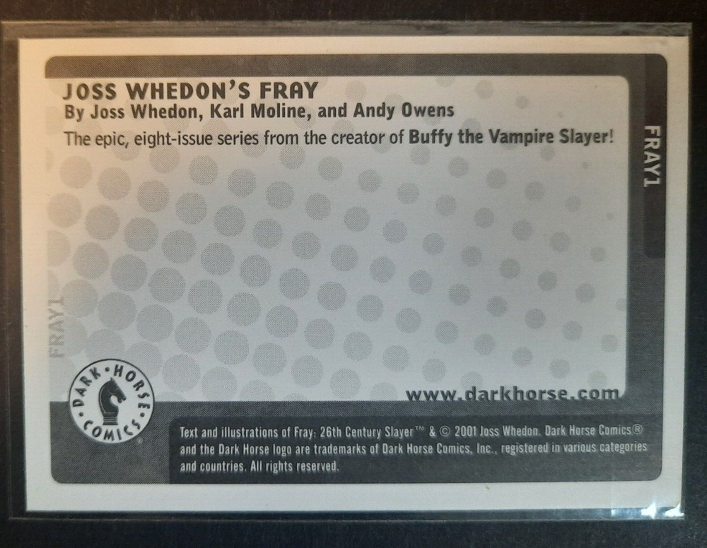 **CHECK OUT MY STORE FOR THOUSANDS OF OTHER COOL LISTINGS! NEW ITEMS ADDED WEEKLY, SO ADD ME TO YOUR FAVORITE SELLERS AND CHECK OFTEN!** You are bidding on: Joss Whedon's FRAY Promo Card #FRAY1. Issued by Dark Horse Comics in 2001. Condition: NM/M I do offer combined shipping for ALL items, so the more you purchase, the better the postage rate! Payment must be in my hands within 48 hours of purchase!