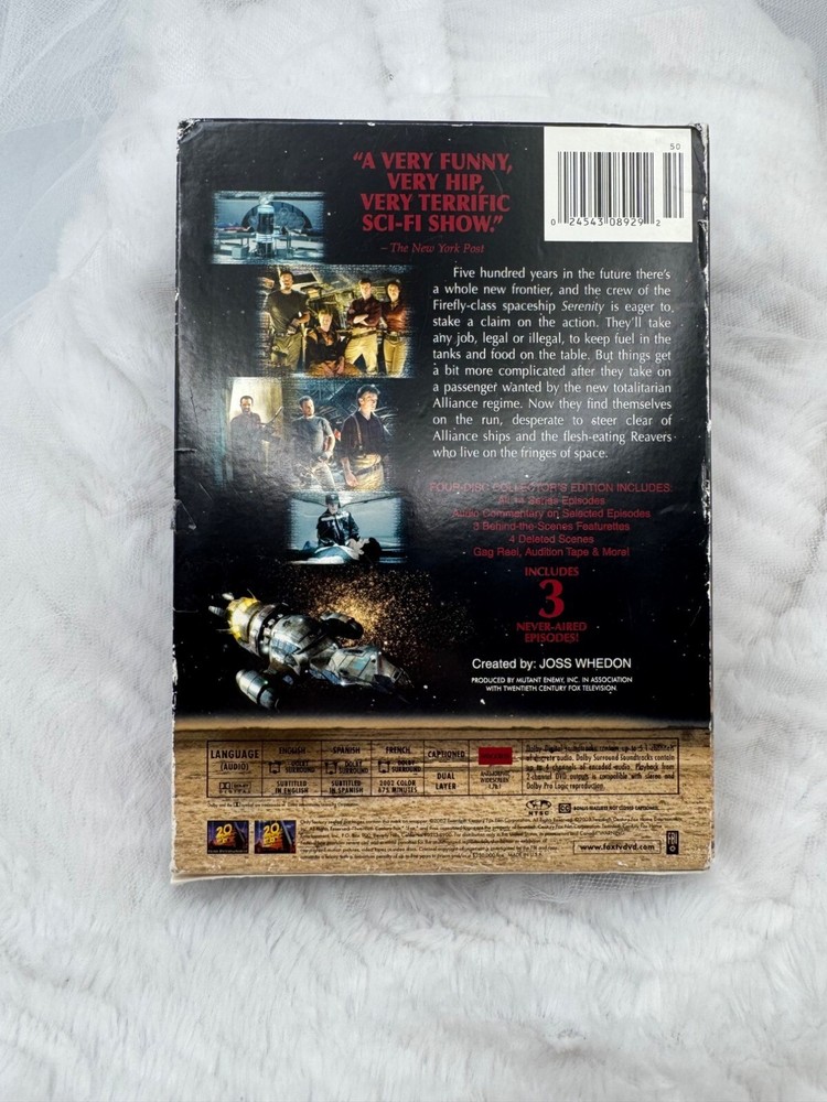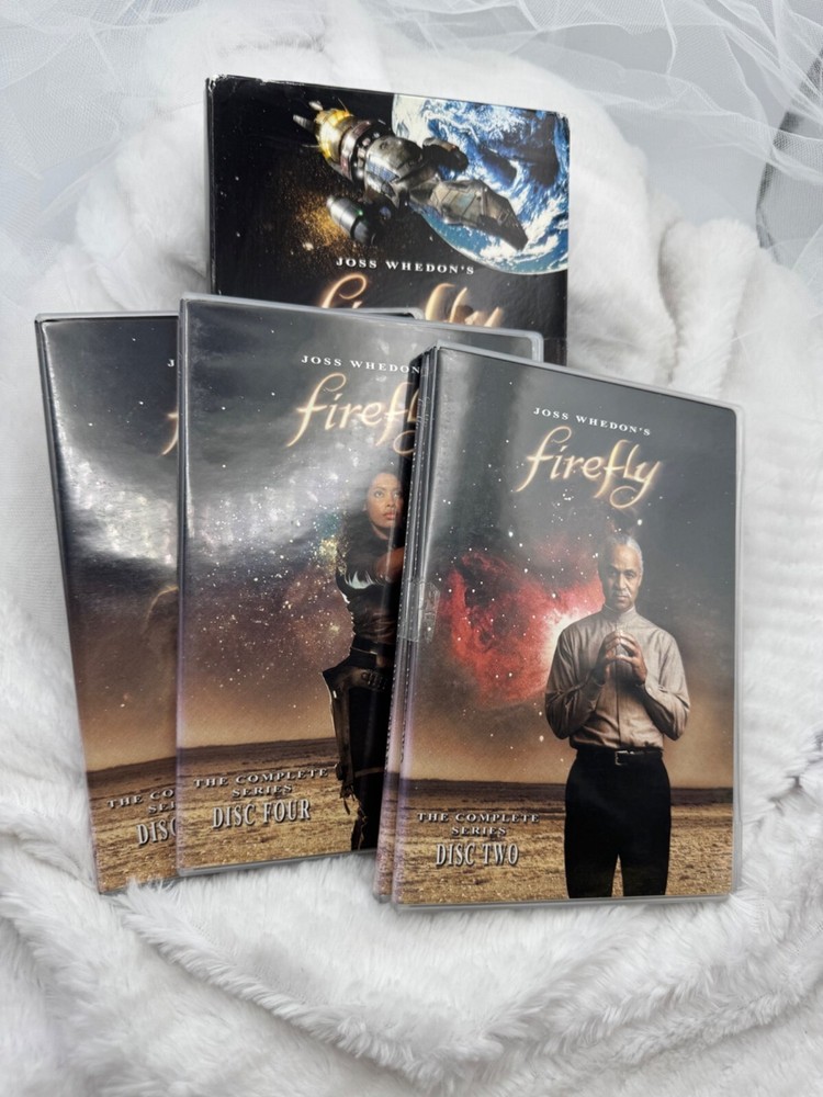 Joss Whedons Firefly DVD Complete Series The complete Firefly series offers a captivating blend of science fiction and western themes, showcasing a memorable ensemble cast and engaging storytelling. • Includes all episodes from the series • 3-disc DVD set in excellent condition • Features bonus content and behind-the-scenes clips • Compact and durable packaging • English language audio with subtitles Slight wear on the outer box; discs are in pristine condition. Box dimensions: 7.5 x 5.5 x 1.25 inches. Good condition with normal wear. Sold and shipped from a clean, smoke-free home. **Please note our media is used, unless otherwise noted. Normal, used wear and tear is present in most items. All used media has been tested** DVD-145 Condition: Pre-Owned Good