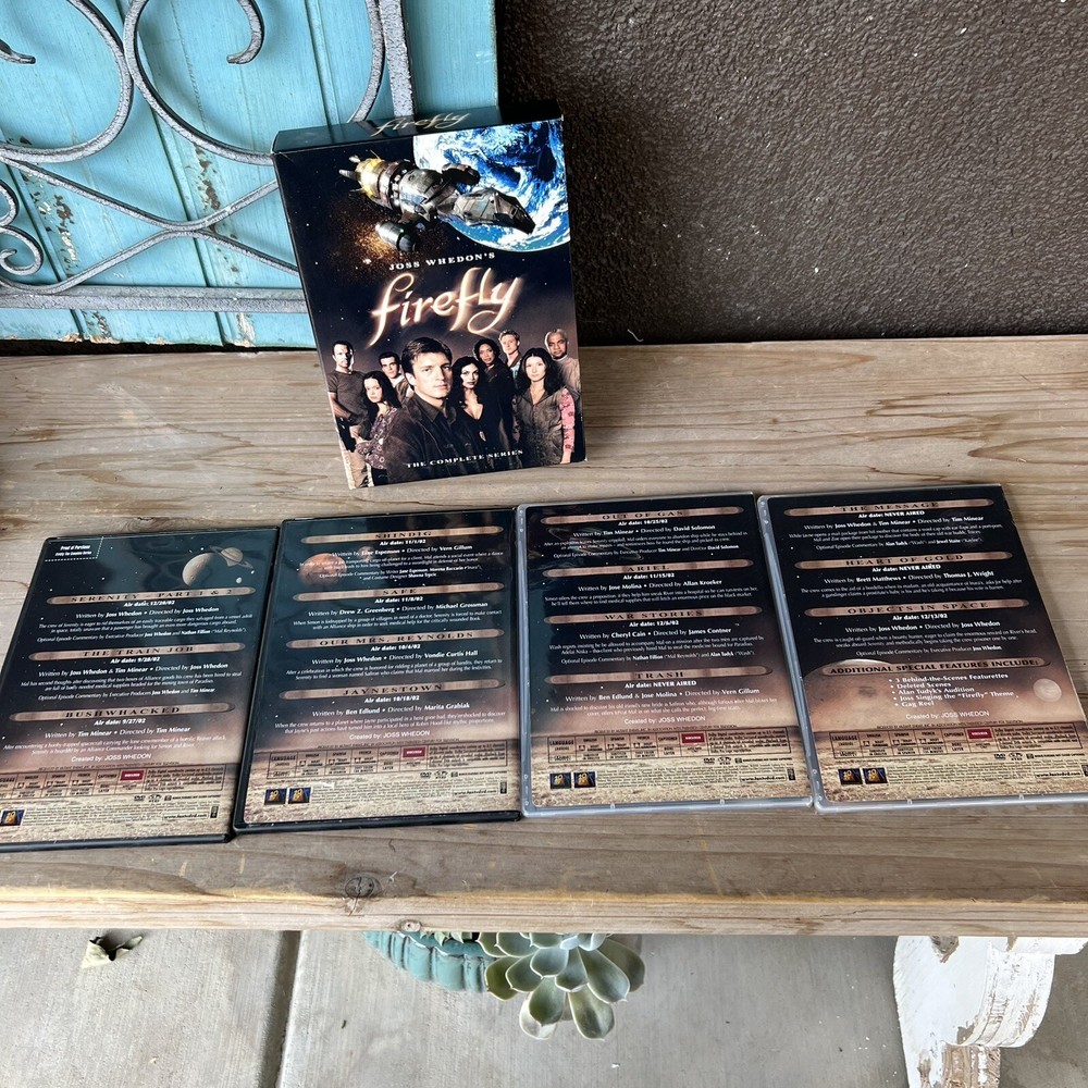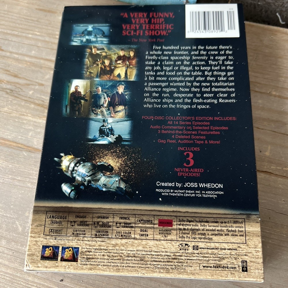 Smoke and pet free home This four-disc DVD set contains the complete series of Joss Whedon's Firefly, released by 20th Century Fox in 2002. The show follows the adventures of the crew of the Serenity, a spaceship in a future where humans have colonized a new star system. The series features an ensemble cast including Gina Torres, Adam Baldwin, Morena Baccarin, Summer Glau, Jewel Staite, Alan Tudyk, and Nathan Fillion, and was directed by Allan Kroeker, David Solomon, James A. Contner, Joss Whedon, Marita Grabiak, Michael N. Grossman, Thomas J. Wright, Tim Minear, Vern Gillum, and Vondie Curtis-Hall. This DVD set is perfect for fans of science fiction and adventure, and includes all episodes of the show in NTSC video format with English language. Add this DVD set to your collection today and experience the epic journey of the Serenity and its crew!