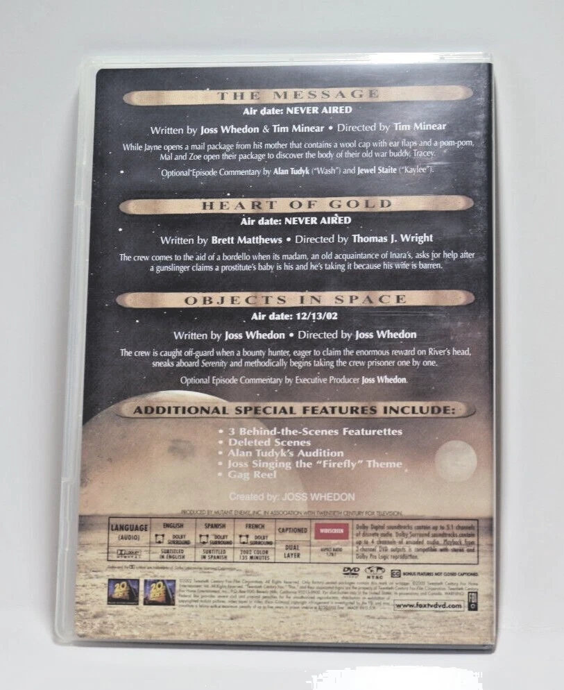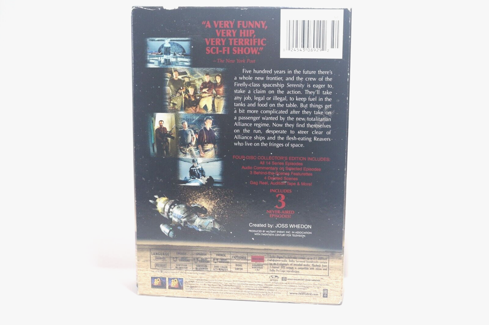 You can't take the sky from me. Joss Whedon's FIREFLY The complete series, 4-disc set with all 14 series episodes and 3 NEVER AIRED EPISODES! Will ship with cardboard protection on each side of your DVD so you will receive what you ordered.