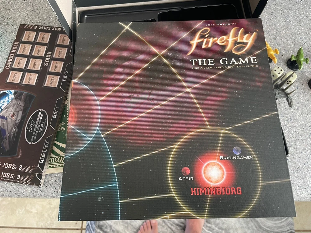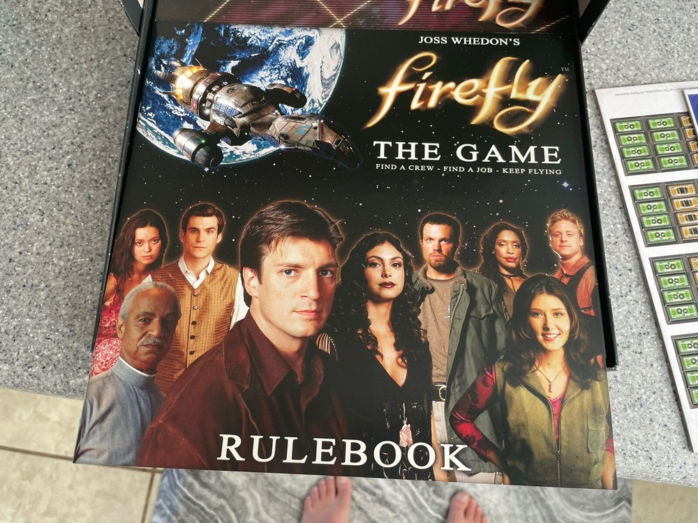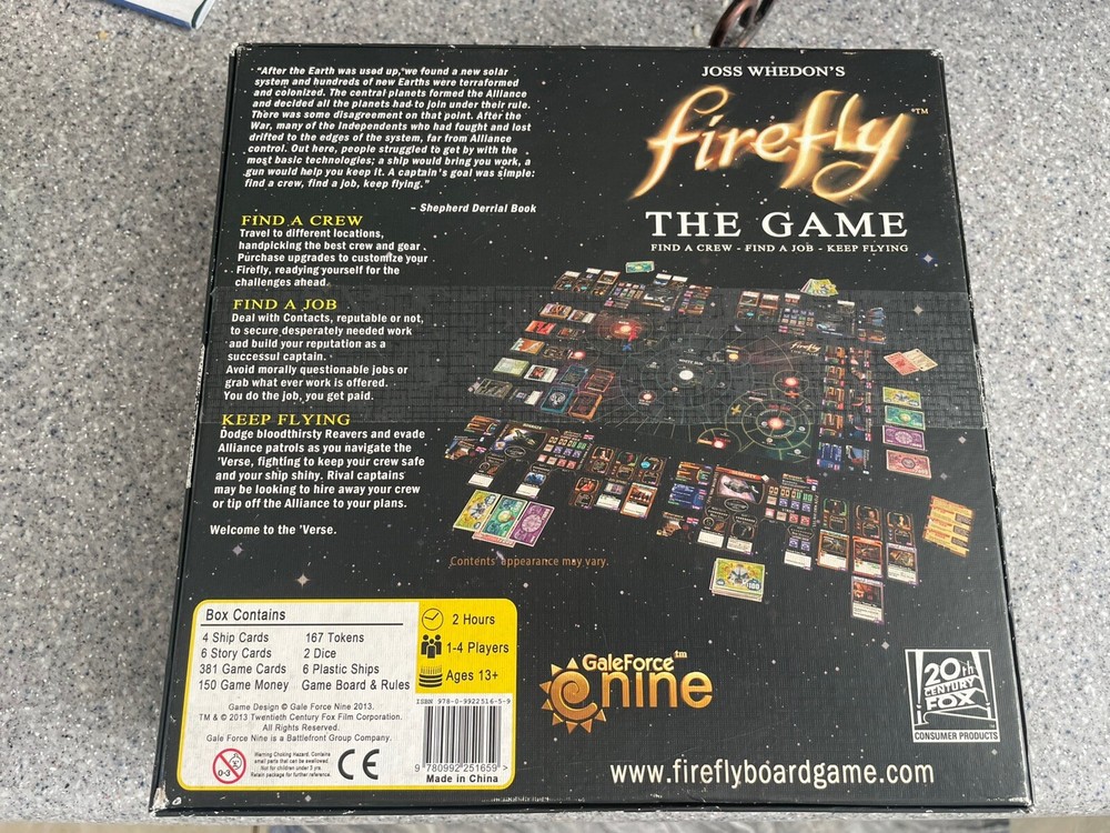 The product is a board game titled "Joss Whedon's Firefly: The Game" by Gale Force Nine. It falls under the Brand category of Gale Force Nine and the Game Type category of Board Game. The theme of the game is Strategy, providing players with a strategic gaming experience set in the world of Firefly created by Joss Whedon. New open box. One pig is missing but all else seems to be there. Please see photos for completeness and quality.