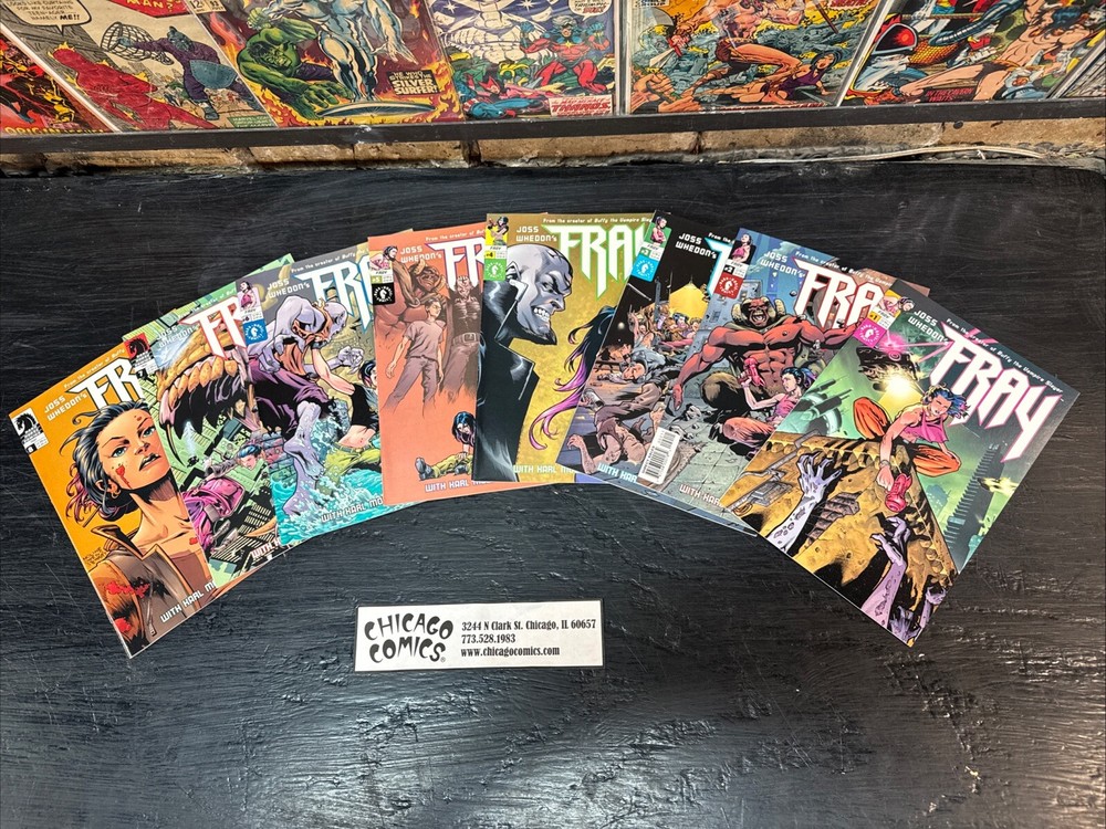 This is an official Chicago Comics auction, one of the leading retailers of independent publishing in the mid-west! By bidding on and winning this auction you agree to purchase the following items: Joss Whedon's Fray 1-8 Complete Set Dark Horse Comics 2001 Our Grading Estimate for this set: VG/FN See photos for more details! Grading Estimate Meanings: VF-NM: These issues have very light wear. Overall, a fantastic set of comics. FN-VF: These issues have light wear. Overall, a very nice set of comics. VG-FN: These issues have moderate wear. Overall, a pretty good set of comics. G-VG: These issues have heavy wear. Overall, a decent set of comics. PR/FR-G: These issues have extremely heavy wear. Overall, a poor set of comics. Since grading collectables can be somewhat subjective, we prefer to give an estimated range instead of a solid numbered grade for lots and sets of comics. Example of a grading estimate: G-VG, we wouldn't grade it lower than a G (Good) and we wouldn't grade it higher than a VG (very good). Combined Shipping: If you would like to combine shipping; add the items to your cart, and while in your cart click on the link "Request total from seller". That will allow me to adjust the shipping cost and send you an invoice with the correct total that is owed. It WILL NOT work on mobile. Local Pickup: This option is available for buyers that would like to avoid shipping costs by picking up their order at our retail store located 3244 N Clark St, Chicago IL 60657. Once purchased, you will wait for a message letting you know that it is ready to be picked up. We will hold your order for pickup no longer than 7 days. The Fine Print : Buyer is responsible for all shipping charges, duties and taxes. We ship most items Tuesday through Friday. Although it is very expensive, International shipping is only available as USPS priority mail to make sure that it reaches its destination and arrives in one piece. We will combine shipping costs on all auctions that will fit in one package together!!! Buyer must pay within 3 days of auction end or an unpaid item dispute will be opened. We pride ourselves on ending our auctions smoothly, please do not hesitate to contact us with any concerns you may have. Thanks and happy bidding! We have tons more comic related auctions and exclusive store merchandise for you to check out. Also, don't forget to add us to your favorites list ! Staff: Downstairs Bookshelf