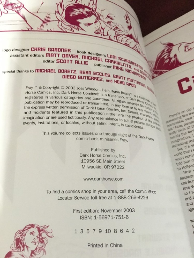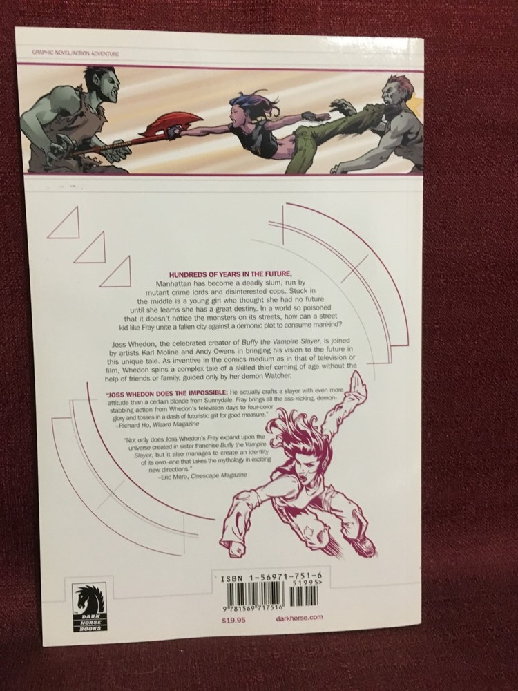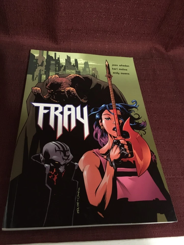 Joss Whedon's Fray Paperback Dark Horse Books The cover has some scratches, marks, bent corners, creases, and worn marks around the edges on it. There are some marks and scratches along the edges. There are some crimped pages and bent corners. The book is a bit creased. Please look at all the included photos. Please ask all questions prior to bidding. Payment is due within 3 days. U.S.A. SHIPPING ONLY. ALL ORDERS ARE GENERALLY SHIPPED WITHIN 2 BUSINESS DAYS OF RECEIVING CLEARED PAYMENT.