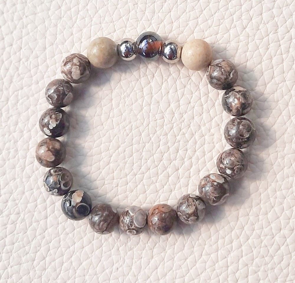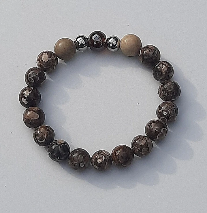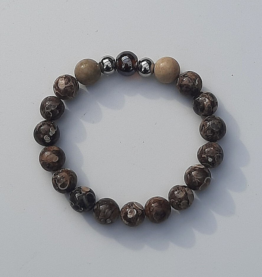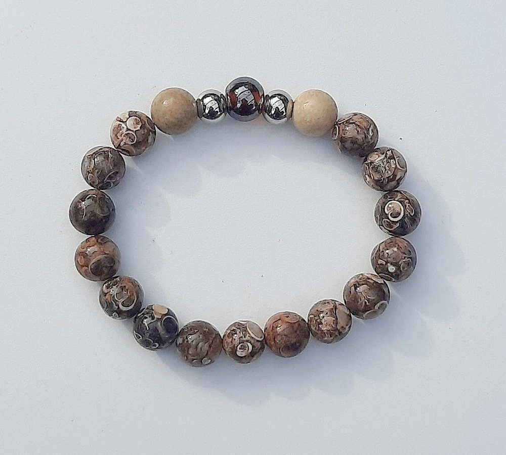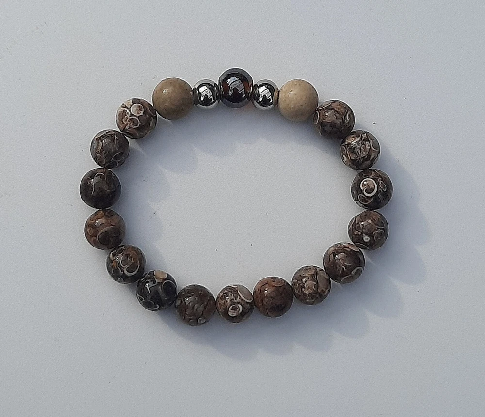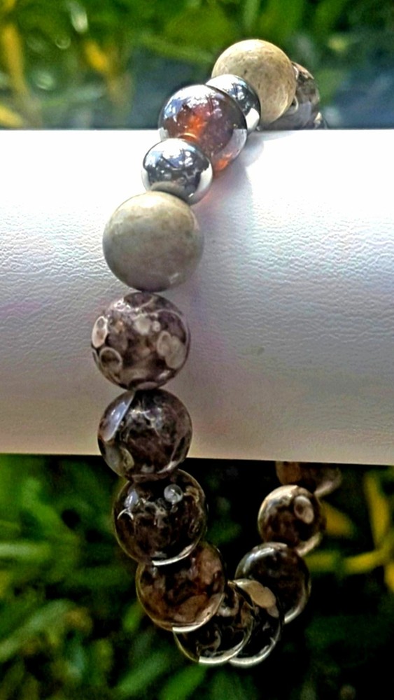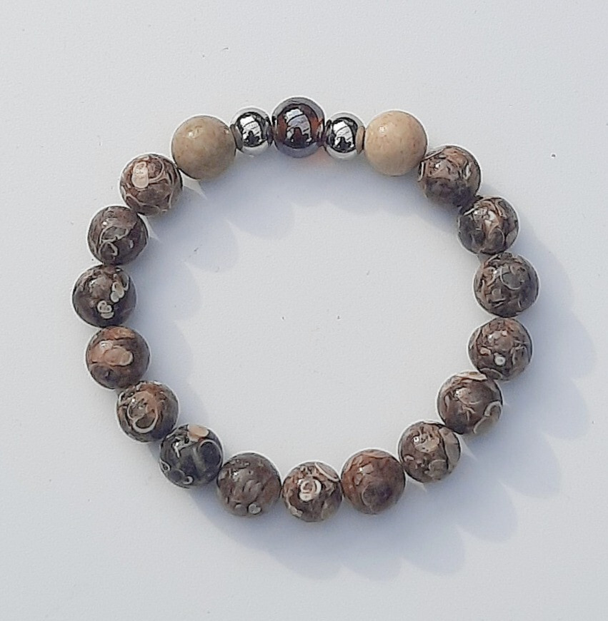 - 7.5" stretch bracelet with 10mm Turntella, Jasper and stainless steel beads...