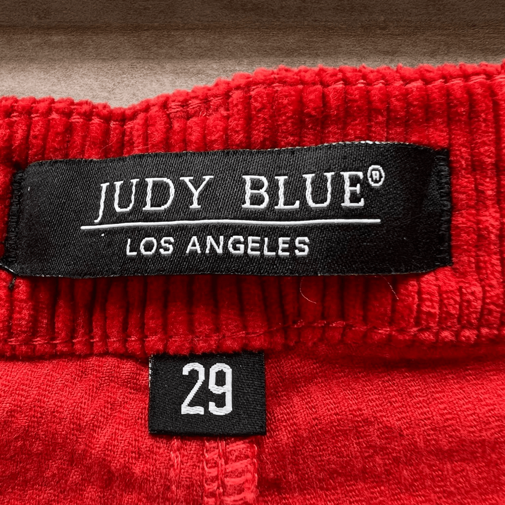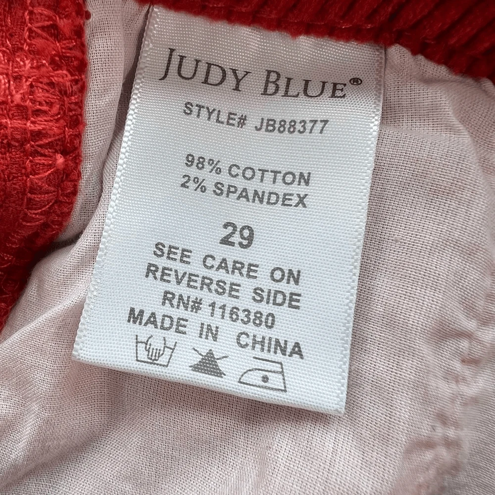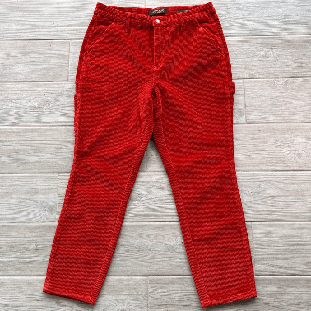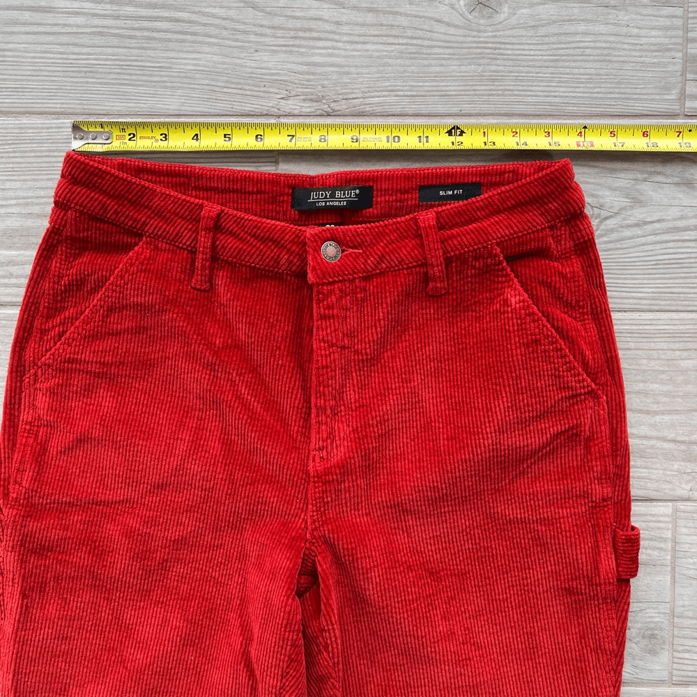 Judy Blue Womens Red Five Pocket Mid-Rise Slim Fit Corduroy Pants Size 29 I would say is more of a brick 🧱 color Brand: Judy Blue Department: Womens Size: 29 Color: Red Type: Pants Style: Corduroy Fit: Slim fit Rise: Mid-rise Closure: Button and zipper fly closure Length: Full-length Pattern: Solid Material: 98% Cotton, 2% Spandex Condition: Pre-owned in excellent condition Features: • Classic 5-pocket design • Belt loops • Copper-tone Judy Blue branded button • Carpenter-style side pocket detail • Judy Blue branded leather patch on the back waistband • Stretchy fabric Approximate Measurements: Waist: 15.5 inches Inseam: 26 inches Length: 37.5 inches Please see the photos for complete details. Let me know if you need any help. Thank you for visiting my store!