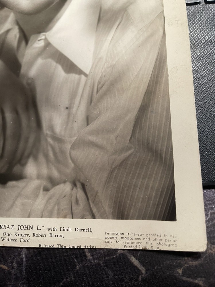 Classic Star Pictures is not on the actual photo, it is a watermark I put on the scan. Lee Sullivan close-up The Great John L 1945 8 x 10 vintage movie still. This photograph is in good condition. Please look at the scan carefully. Classic Star Pictures is not on the photograph. It is a watermark that was added to the scan to prevent copies being made. This item is being sold as a collectors item. It is an original still from my collection. This is a photograph, not a DVD or VHS movie. Check back often, as we are always upgrading our inventory.Thanks for Looking at my Listings,