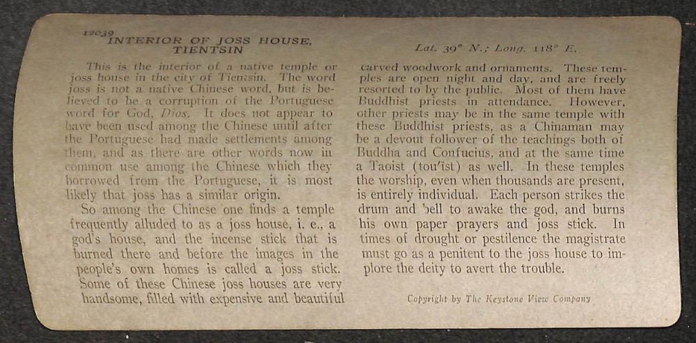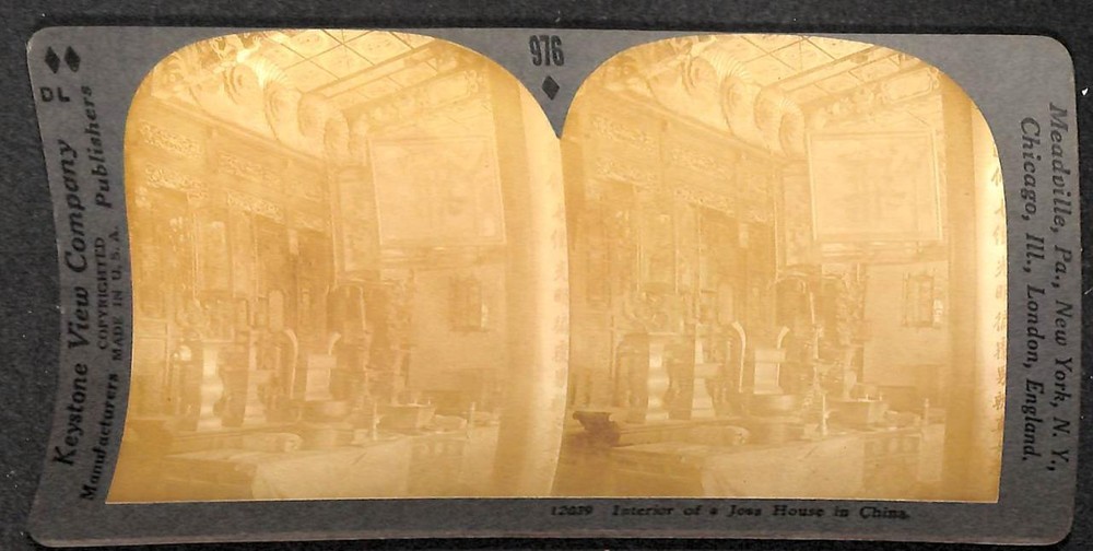 Very attractive and historic stereoview showing 'Interior of a Joss House in China.' Normal curvature, Very fine condition. Shipping is $2.00 domestic mail and $3.00 international. All items/orders selling at or over $49.95 will be insured and based upon final sale price. Please wait for an invoice from seller before making payment. Insured mailing is required for all items that sell for $49.95 or higher and for multiple combined purchases exceeding this amount. The shipping information given below is only for items at starting prices not requiring insurance. Please take a look at my other listings. There is a clickable link below the image to view a larger picture. The scans accurately reflect the condition yet if you have any questions please feel free to ask. Check out the other items I have for sale! Pictures sell! Auctiva Free Image Hosting. Auctiva, THE simple solution for eBay sellers. Track Page Views With Auctiva's FREE Counter