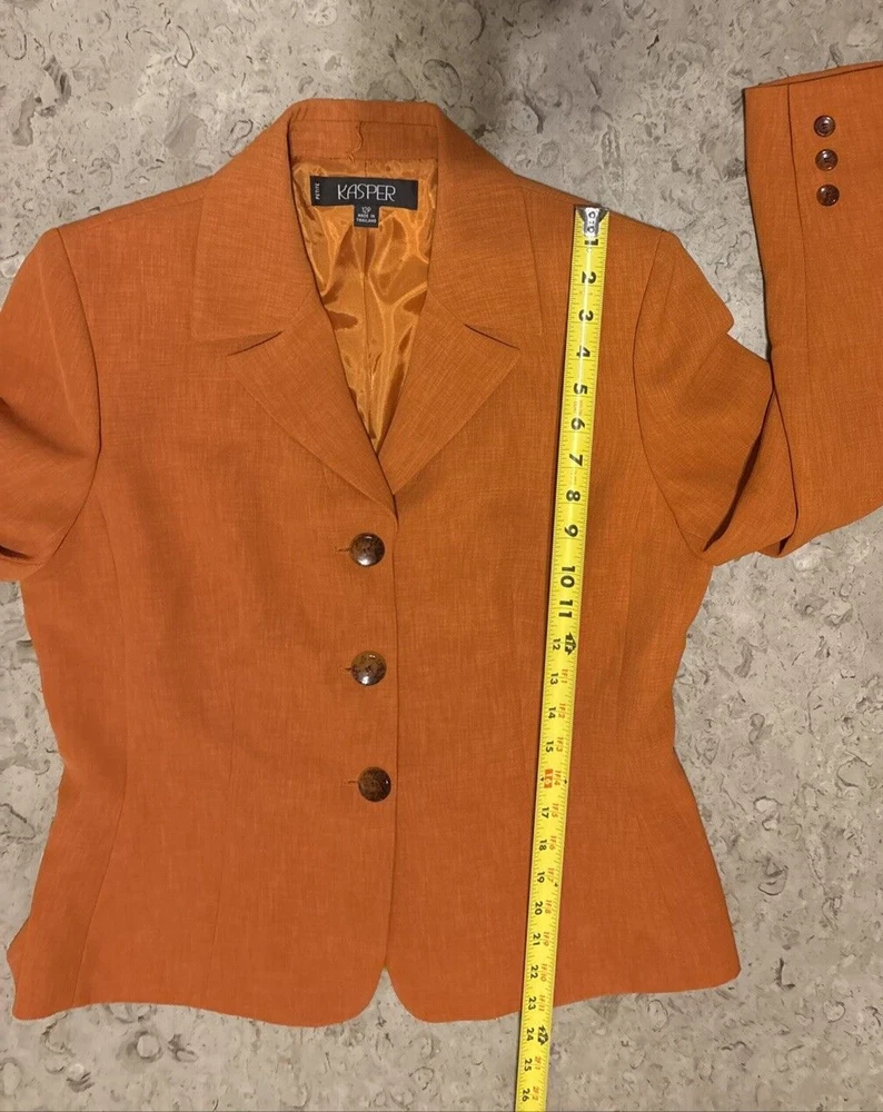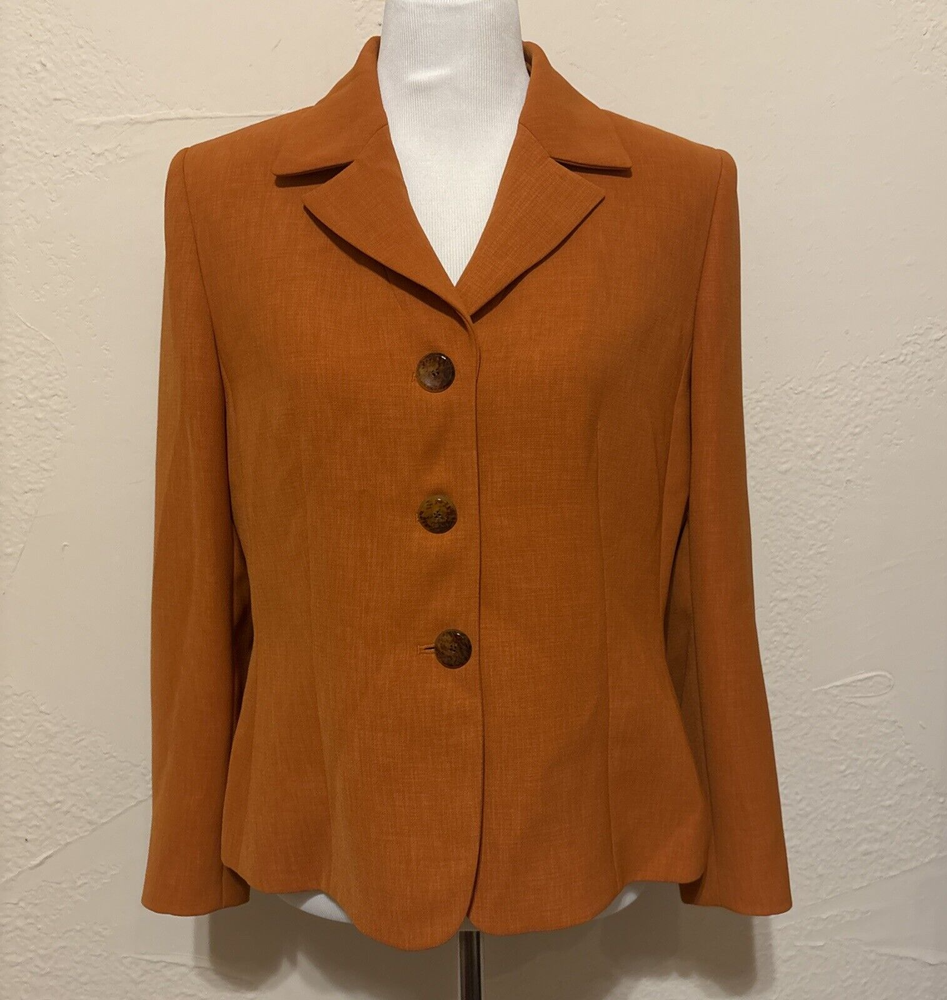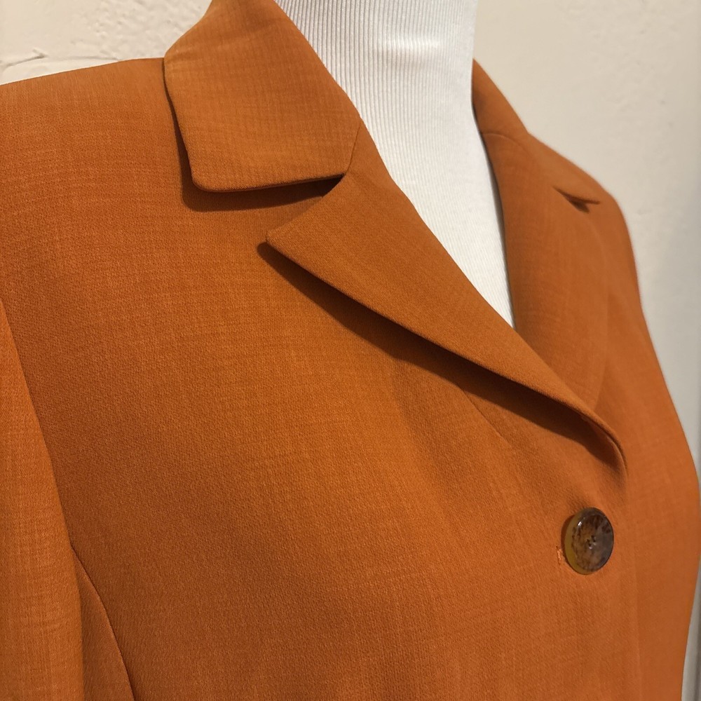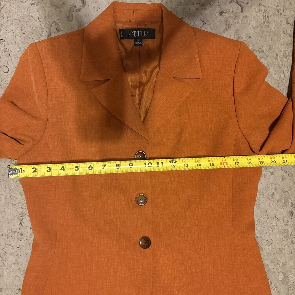 Elevate your wardrobe with this stunning Kasper blazer in a beautiful rust/burnt orange hue. This classic piece features a single-breasted cut with a notched collar and button closure, perfect for any occasion from workwear to cocktail parties. The blazer is made from high-quality polyester twill fabric, which makes it durable and easy to care for with dry cleaning. The blazer is fully lined with polyester, adding to its comfort and structure. The vintage-inspired design adds a touch of sophistication to any outfit, while the mid-length coat and long sleeves make it perfect for fall, winter, and spring seasons. This blazer is a must-have for any woman's wardrobe, and it's available in size 12P.