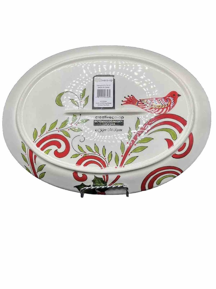 KATE McROSTIE CREATIVE CO-OP RED BIRD HOLLY SERVING PLATTER PLATER 13” L 9.6” W. Platter still has paper sticker on back so this is unused and unwashed. B22