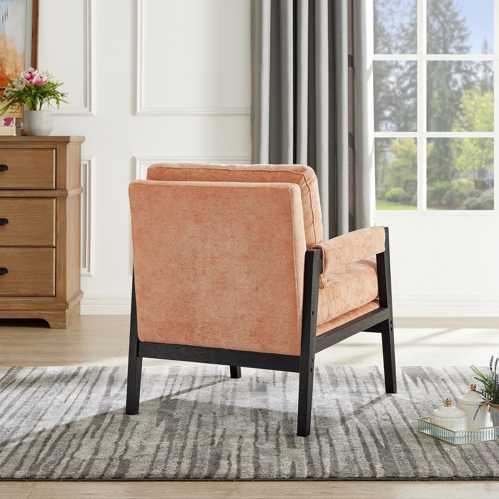 Luxurious Chenille Upholstery: Immerse yourself in comfort with the sumptuous chenille upholstery, offering a plush and inviting seating experience. Solid Acacia Wood Frame: Crafted for durability and elegance, the solid Acacia wood frame in sleek black finish ensures a stable and stylish foundation. The legs feature integrated leg glides, ensuring smooth movement and surface safeguarding. Removable Back Cushion: Tailor your comfort effortlessly with a removable back cushion, providing versatile support for different seating preferences. Soft Cushioned Seat: Experience lasting comfort with a generously padded seat that supports and cradles you during relaxation or work. Dimensions: Overall(with pillow): 26.25"W x 32.5"D x 33"H. Seat width: 23". Seat Height: 19"; Seat depth with pillow: 20", without pillow: 27". Back cushion height: 15.75". Some assembly is required with all parts and instructions included. Photo may be slightly different from the actual item in terms of color due to the monitor's display