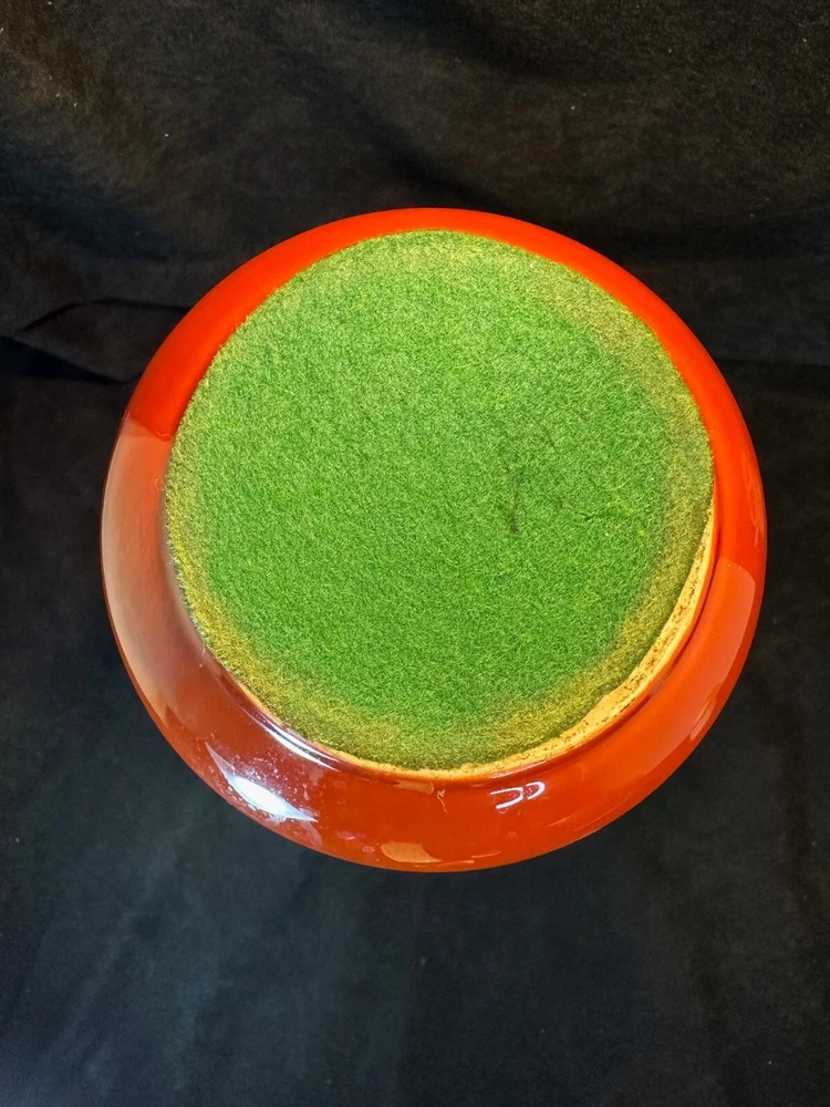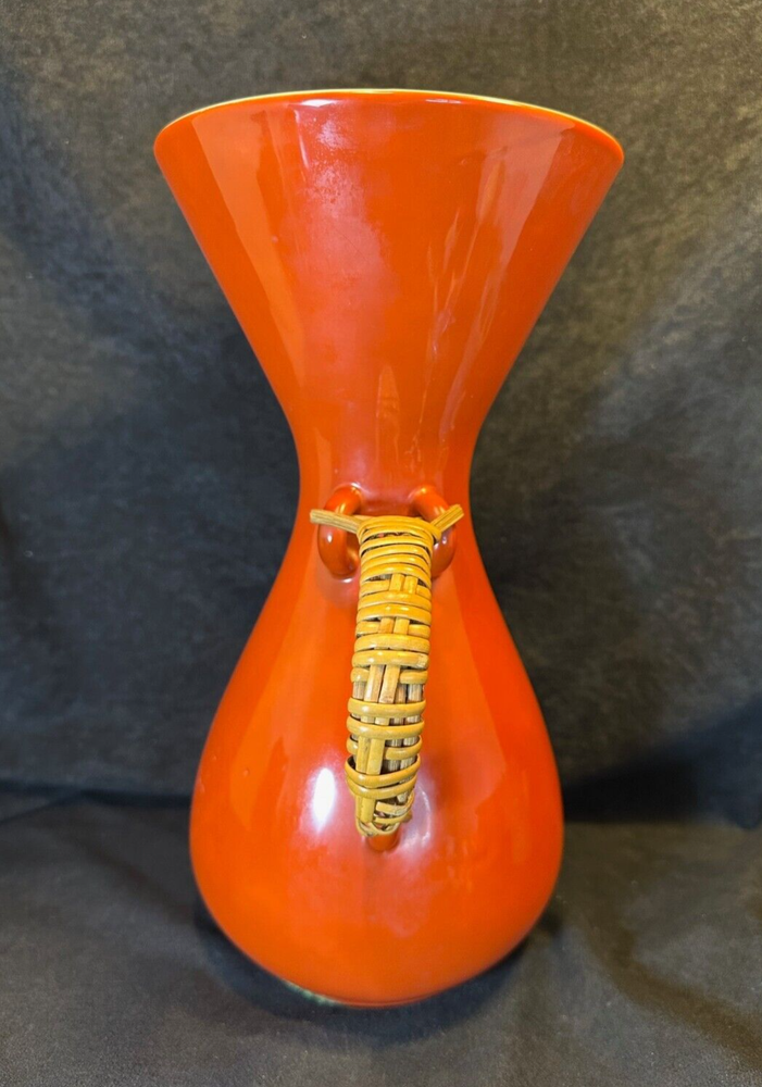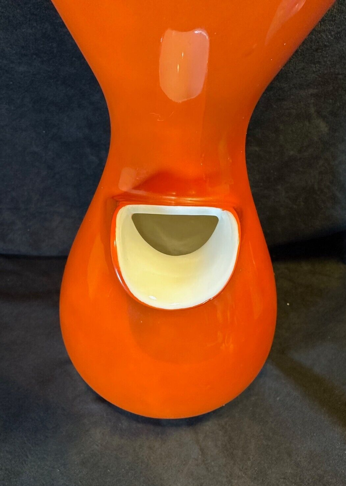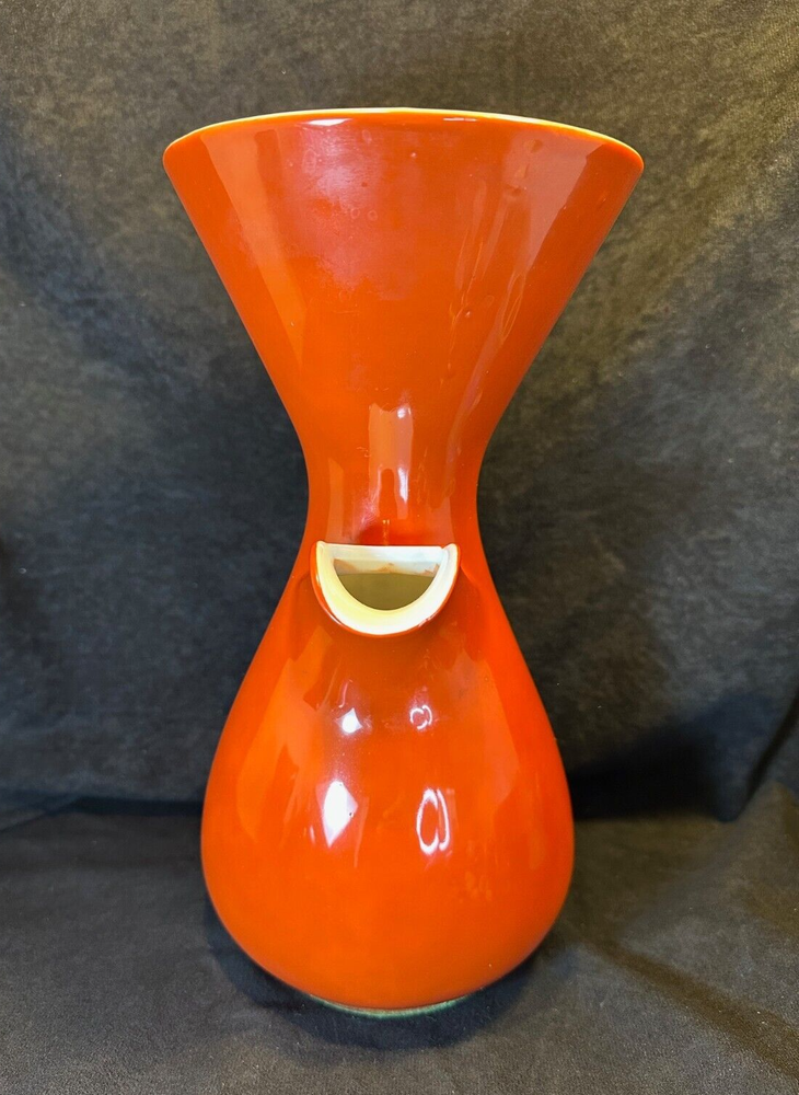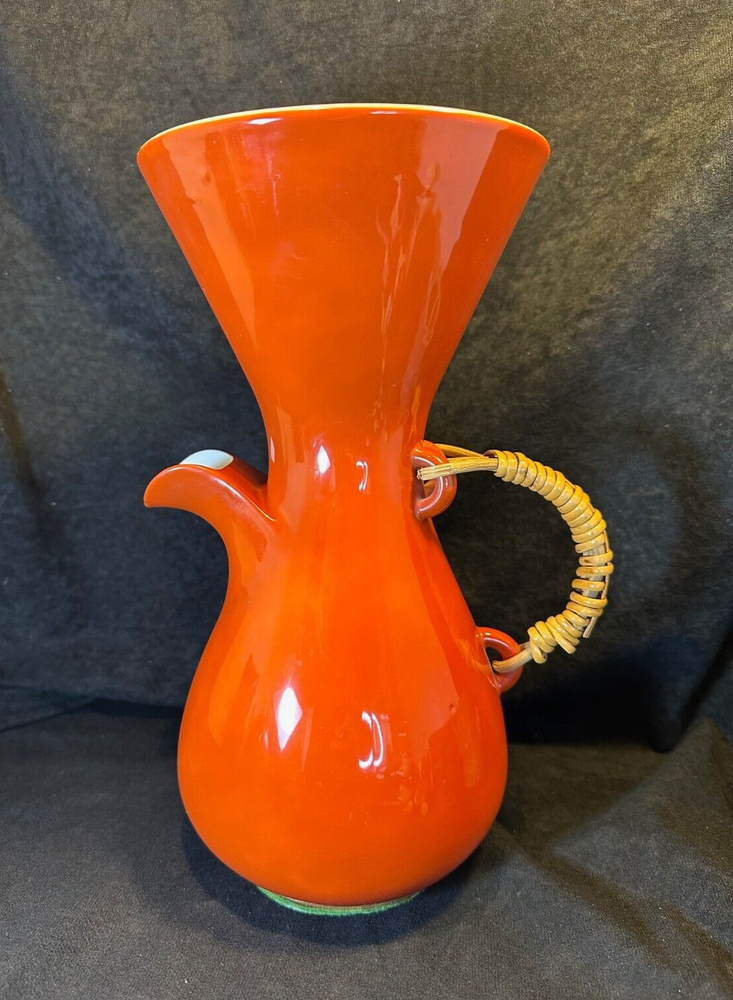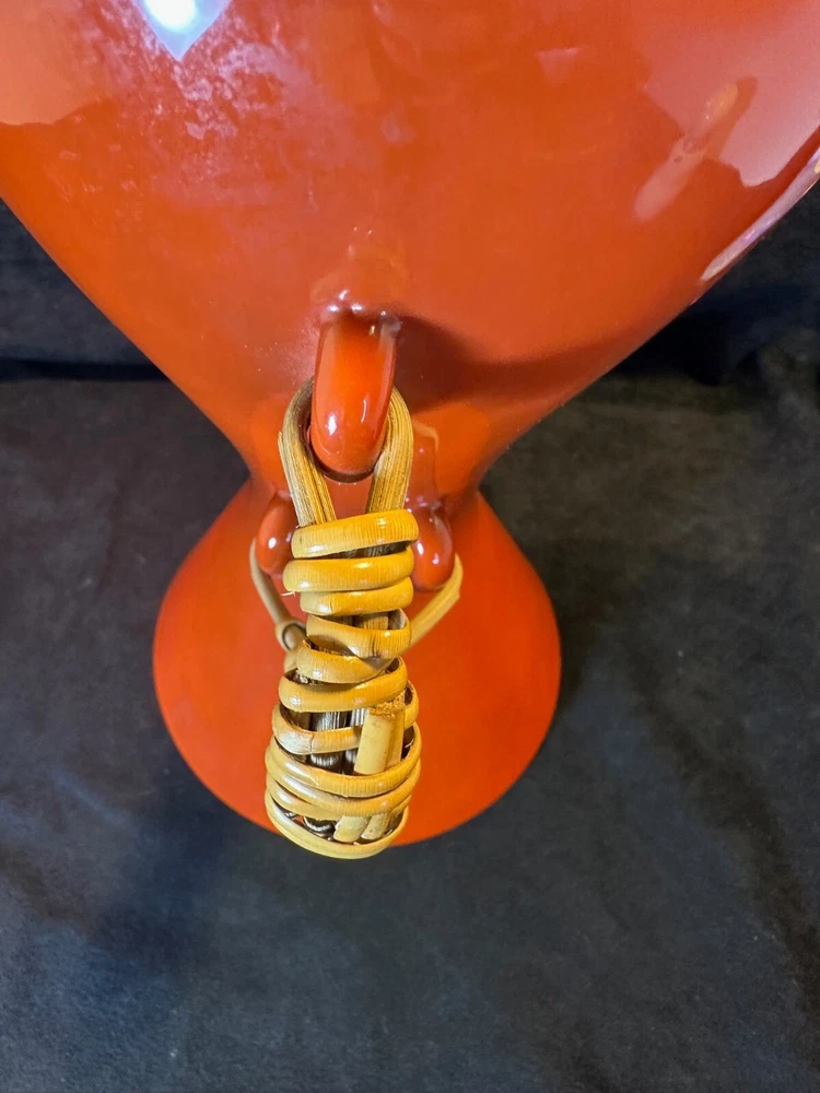 Kenji Fujita Mid Century Modern Orange Porcelain Coffee Carafe The carafe is in excellent condition with no chips or cracks. The bottom of the rattan handle is a little loose but stays wound up and it's a little dirty on the bottom of the inside. It's 11 1/8" high and 6" in diameter at the rim. It weighs about 2 1/2 lbs. See Pics.