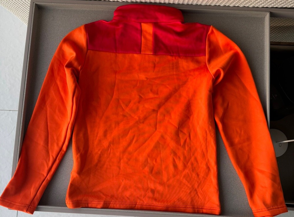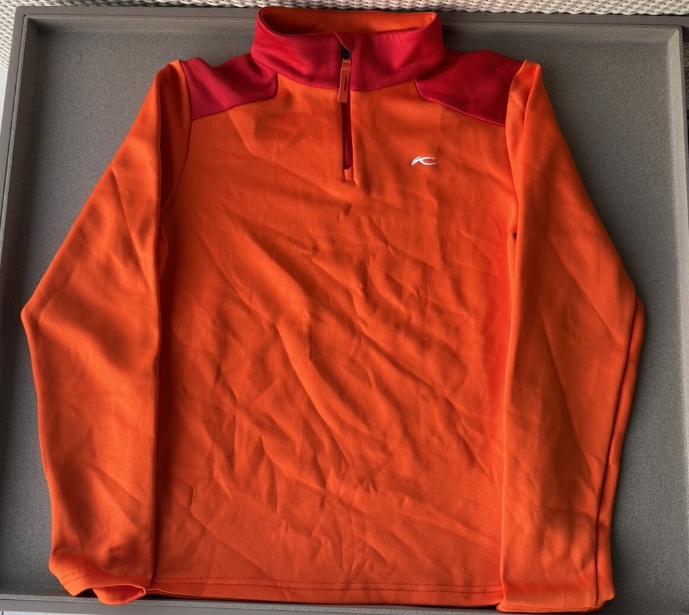 The KJUS Boys Ski Mid Layer in size 152 is a high-quality 1/4 zip sweater designed for young skiers. Made of polyester and elastolefin, this mid layer provides warmth and flexibility on the slopes. The vibrant orange color adds a touch of style to the practical design, making it suitable for both performance and fashion-conscious boys who enjoy skiing. Very good pre owned condition