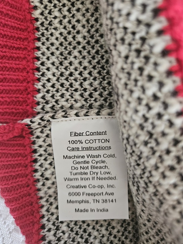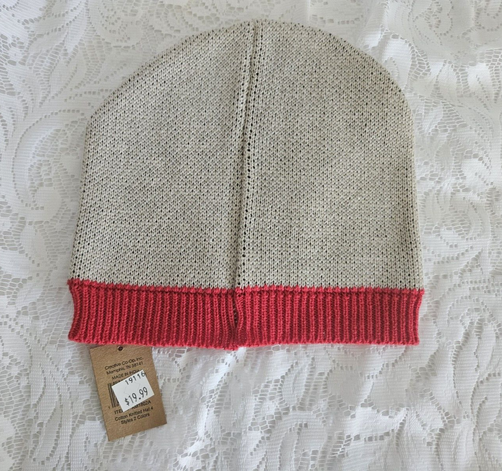 This knit 100% cotton hat is made in India and features a cream and black sheep on the front. This hat is brand new and will certainly make a unique gift. Measures 8" across the red front band x 8 1/2" from top to bottom 9
