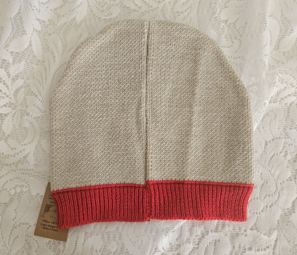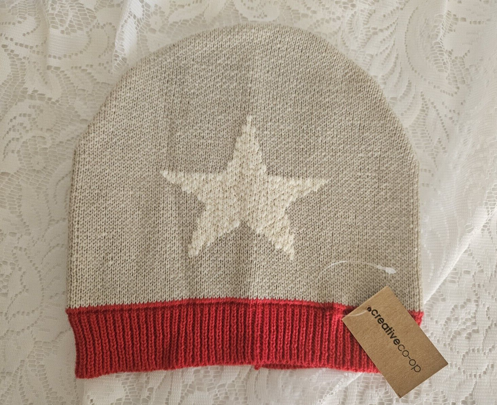 This knit 100% cotton hat is made in India and features a cream Star on the front. This hat is brand new and will certainly make a unique gift. Measures 8" across the red front band x 8 1/2" from top ...