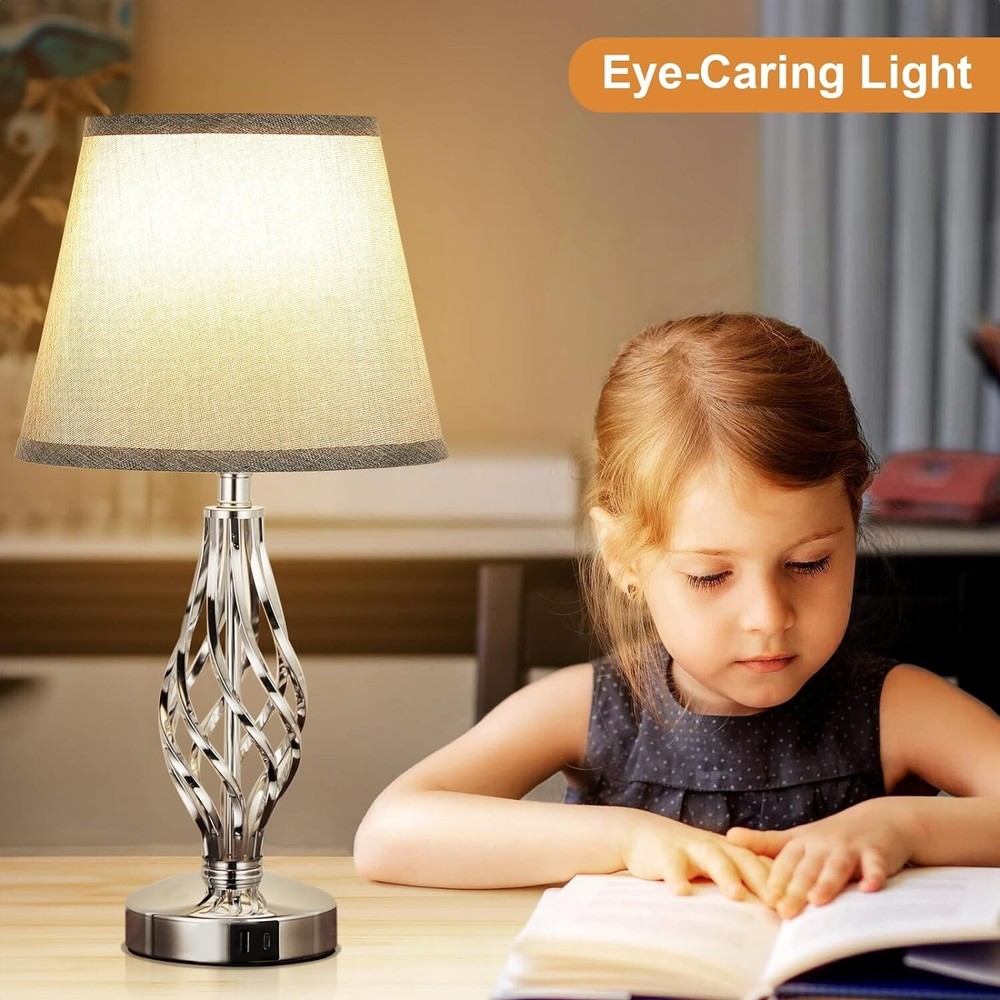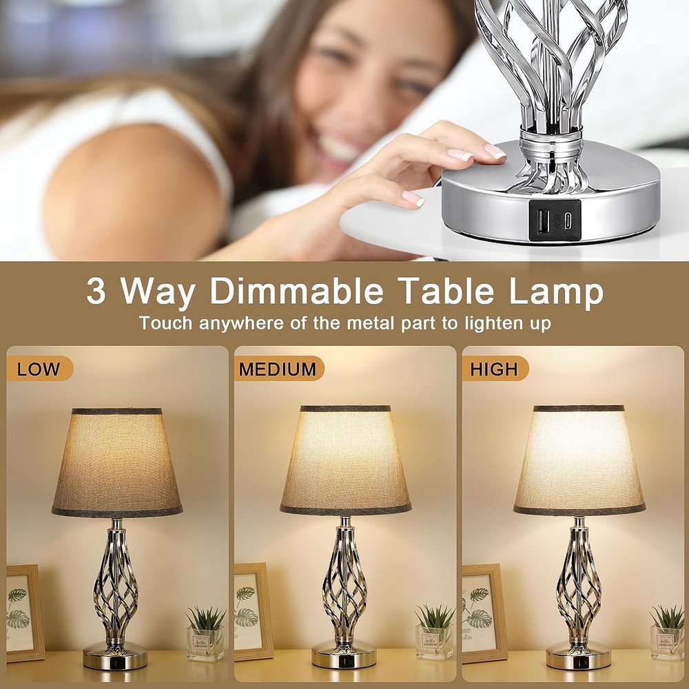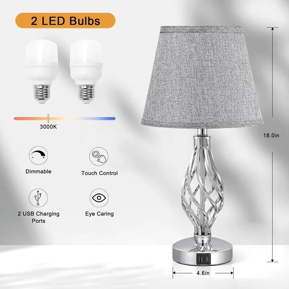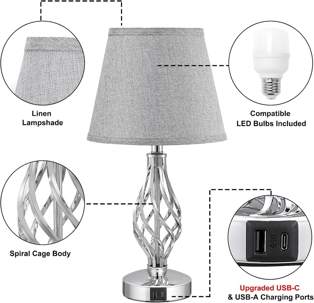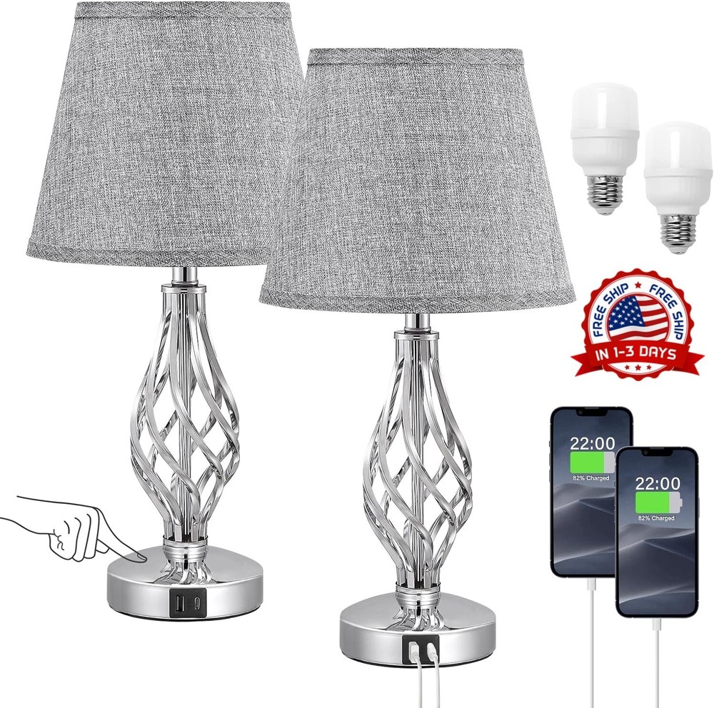Lámpara De Mesa 3 Colores Con Puerto Carga USB Para Escritorios Dormitorios Sala Juego de lámparas de mesa táctiles pequeñas y modernas para dormitorio: cada lámpara táctil para mesita de noche utiliza una pantalla gris duradera y una base de metal con diseño de jaula en espiral, con su apariencia única, que irradia la atmósfera de una industria elegante y muestra el mejor atractivo en simplicidad. Este juego de 2 lámparas de noche es muy adecuado para iluminar el dormitorio, la sala de estar, la oficina, la habitación de los niños, la mesa auxiliar y la sala de estudio. Mientras tanto, esta lámpara de mesa con puertos de carga USB es un regalo fantástico para familiares y amigos. Control táctil regulable de 3 vías: la lámpara de mesita de noche táctil gris con dos puertos USB está disponible para encender/apagar tocando la base de la lámpara. Toque cualquier lugar de la base y el cuerpo de metal negro perla para cambiar 3 modos de iluminación: alto, medio y bajo para trabajar, jugar, leer y relajarse para mostrar una luz brillante, moderada y suave, que se adapta a una variedad de escenarios de uso. Puertos de carga USB duales: con puertos de carga USB A y tipo C integrados, las pequeñas lámparas táctiles para mesita de noche están disponibles para cargar hasta 2 dispositivos electrónicos al mismo tiempo, ya sea que la luz esté encendida o apagada, como un teléfono móvil. Lector Kindle, tableta y auriculares inalámbricos. Adiós a los enchufes de carga que están lejos de tu mesita de noche o mesa auxiliar. Lámparas de dormitorio para mesita de noche con bombillas compatibles: dos bombillas con luz blanca cálida vienen con las lámparas de noche USB para mesa auxiliar. Por su seguridad, no instale otra bombilla en esta lámpara de mesa con atenuación. Esta bombilla consumirá menos energía, proporcionará una iluminación más estable y se combinará con la pantalla gris para emitir una luz suave para proteger su vista. Mejor luz, mejor vista: Lightings siempre cree en este credo y se esfuerza por brindar los mejores productos de iluminación interior a nuestro valioso cliente. Cada lámpara de mesa será inspeccionada estrictamente durante la producción y el embalaje para garantizar la excelente calidad del producto.