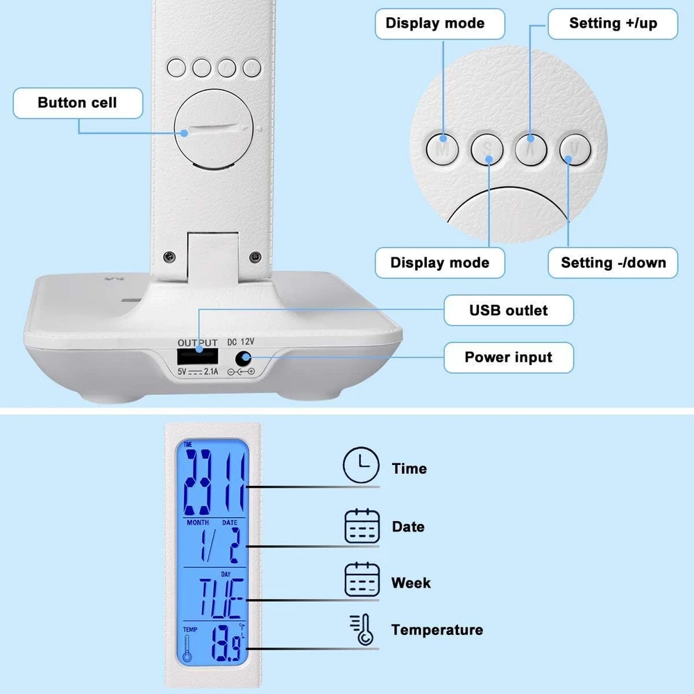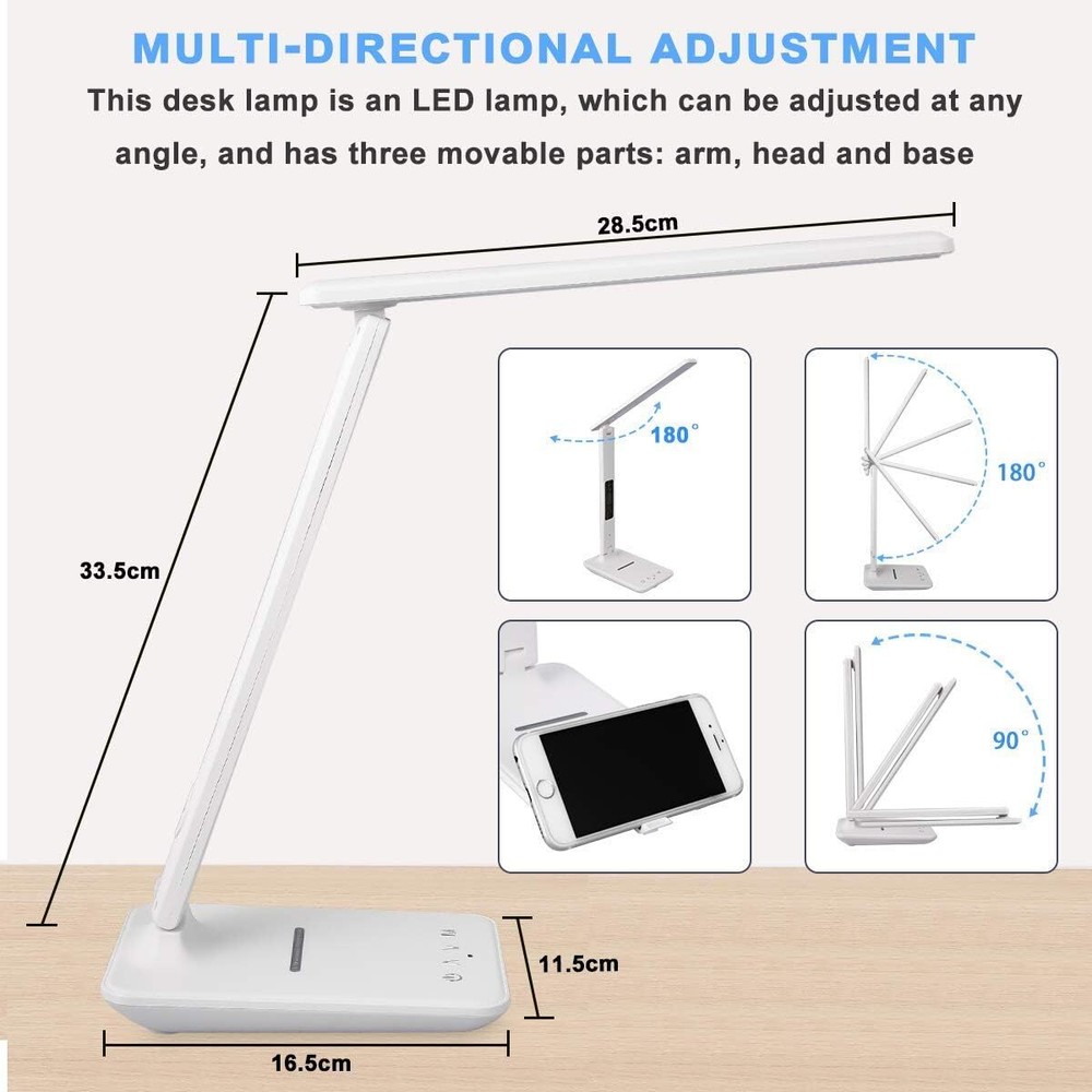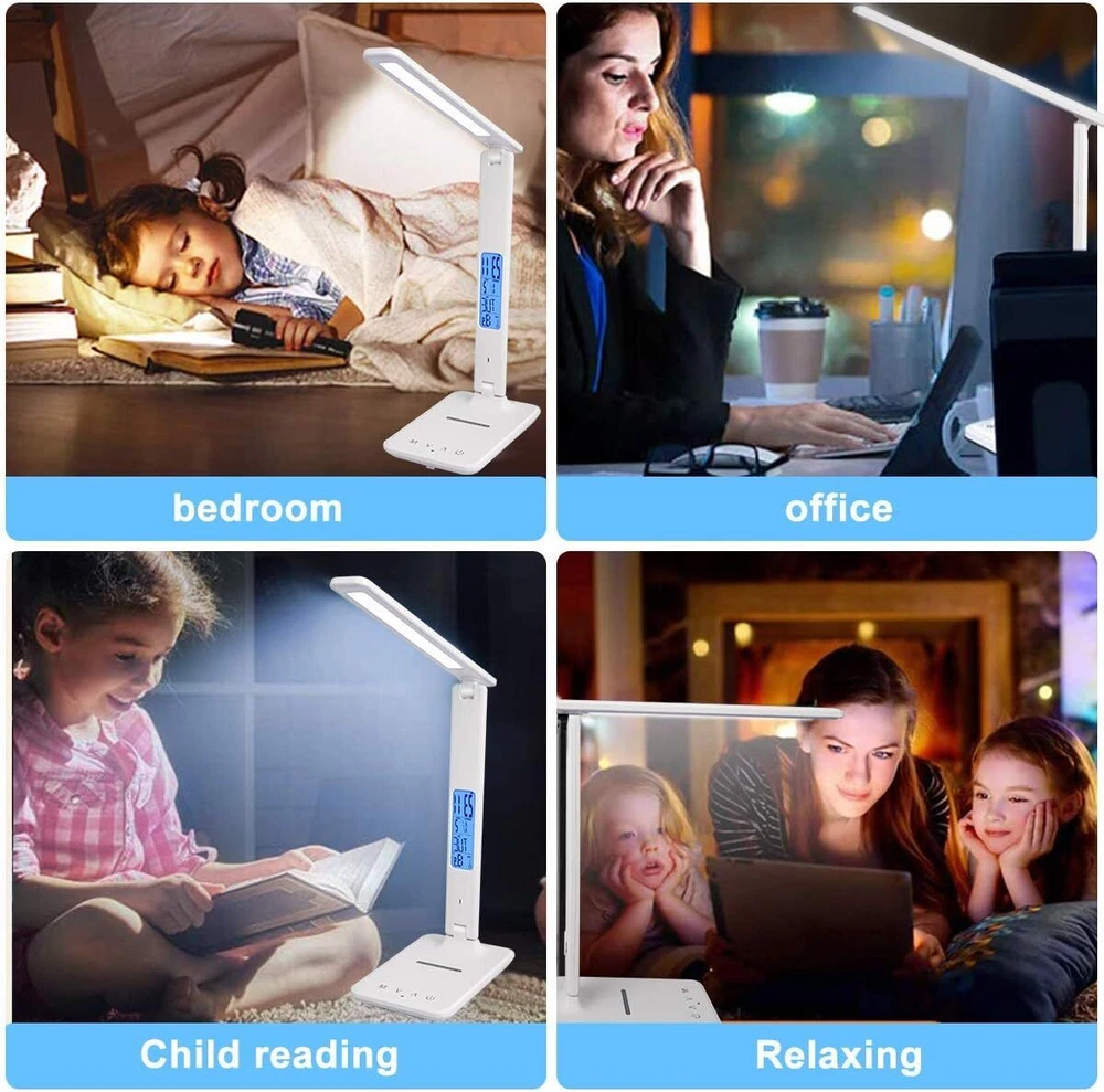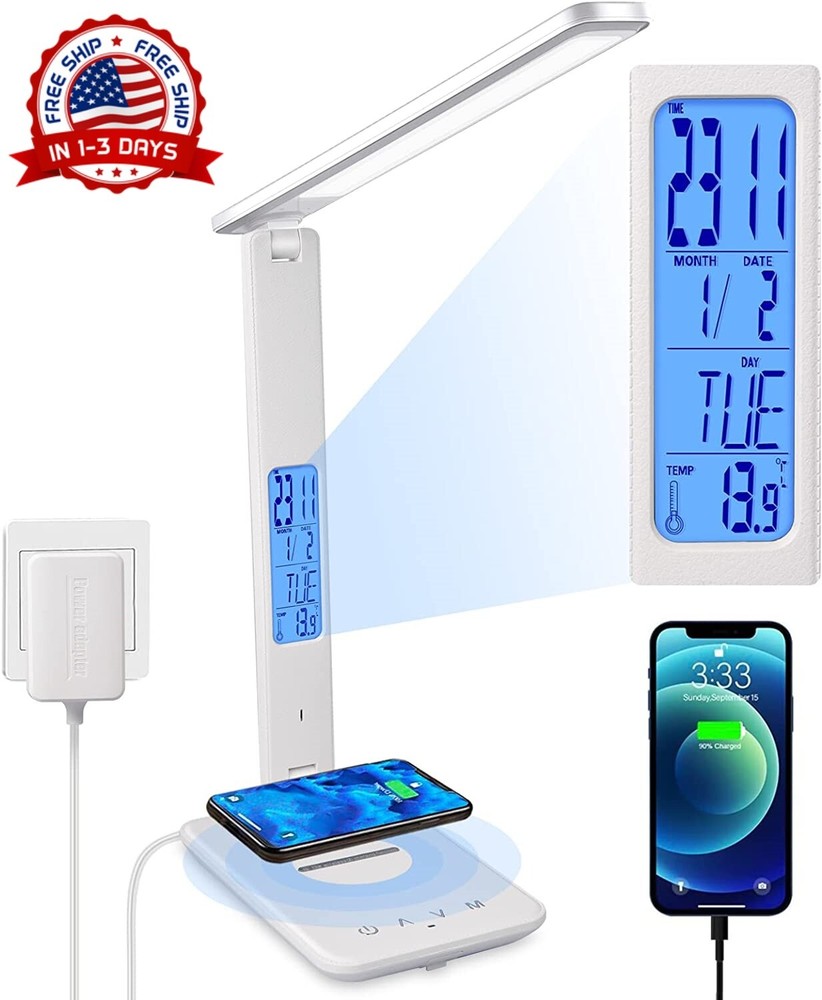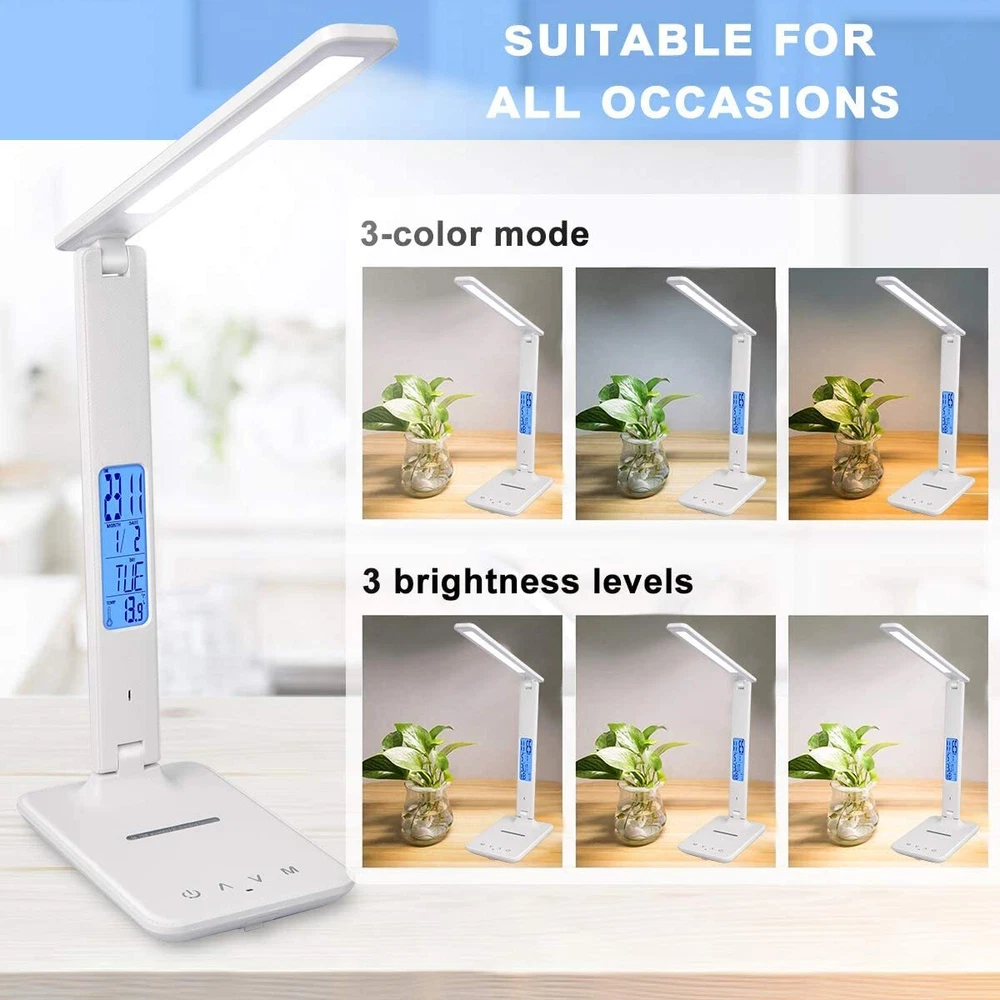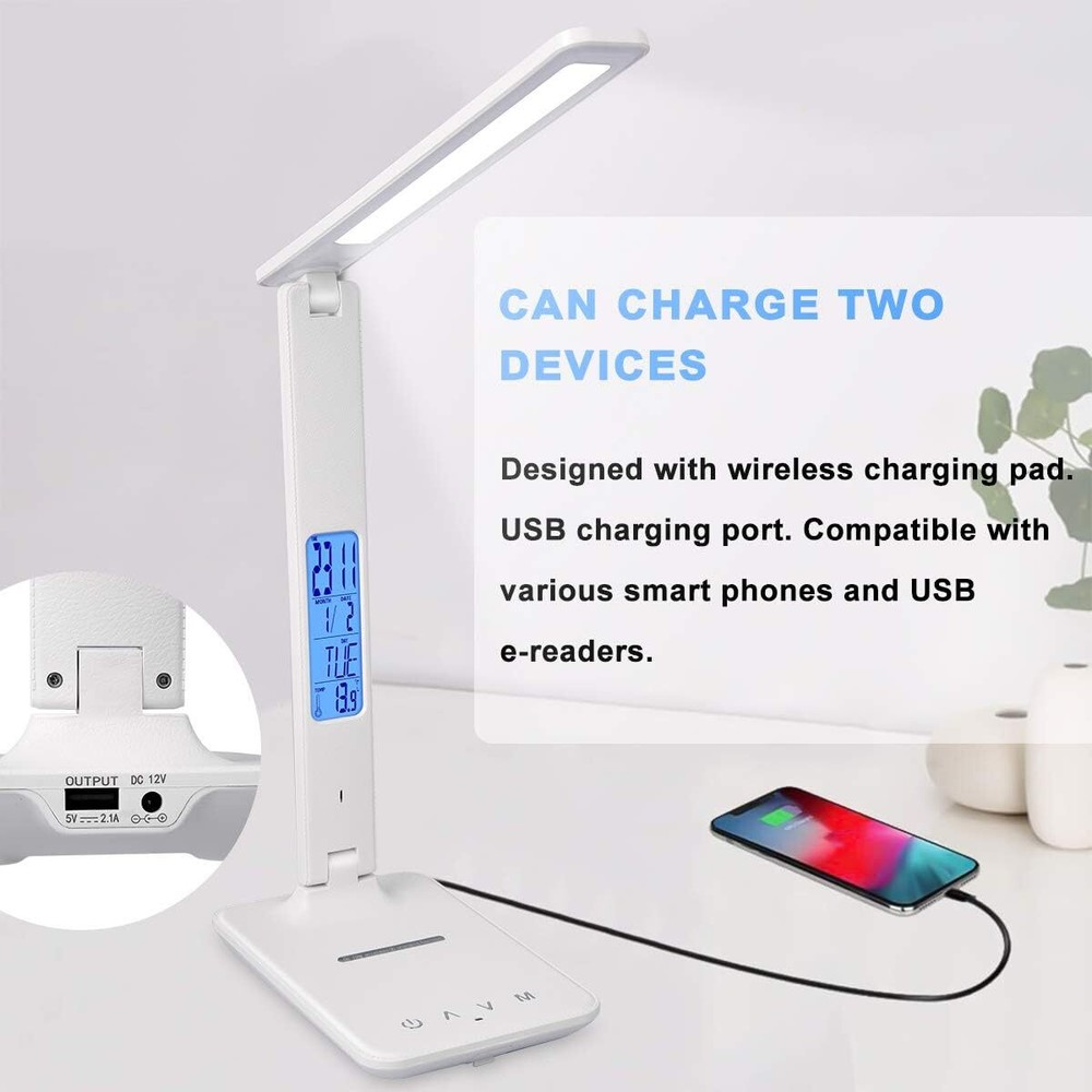 Lámpara LED para lectura de mesa, lámpara de cama, lámpara de escritorio Nuevo 【Ahorro de energía de protección ocular】 -Lámpara de escritorio LED de protección ocular con cargador inalámbrico, 45 perlas de lámpara de temperatura de doble color. El índice de visualización es superior a 80Ra, bajo consumo de energía, alta eficiencia y ahorro de energía, sin parpadeo, sin deslumbramiento, luz suave, ilumina tu espacio y protege tus ojos, es una opción ideal para leer, trabajar y estudiar. 【Carga rápida de teléfonos inteligentes】-Puerto USB incorporado y función de carga inalámbrica QI dos métodos de carga. Puede elegir su método de carga favorito para cargar rápidamente el teléfono de acuerdo con la situación real, de modo que el teléfono esté completamente cargado y pueda usarse convenientemente 【Rotación multieje, iluminación omnidireccional】 - Función de control táctil, temperatura de 3 colores, atenuación de 5 niveles, lámpara de escritorio de oficina plegable giratoria multiángulo de tres ejes, combinación única adecuada para diferentes entornos de uso, lo que hace que su uso sea más cómodo y conveniente 【Actualización de la función del reloj】 -Luz de lectura de la pantalla LCD, con funciones de reloj y calendario, puede mostrar la hora, la fecha, la temperatura, el diseño humanizado, puede presionar "ON / OFF" durante 3 segundos para encender / apagar la pantalla LCD, cuatro botones Se puede configurar la hora y la función de alarma. 【Ahorro de energía y servicio satisfactorio】 -En comparación con las lámparas de escritorio tradicionales, tiene un desempeño ambiental y puede reducir las facturas de electricidad hasta en un 78%.