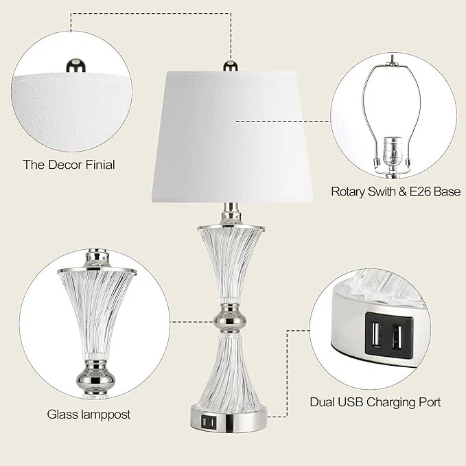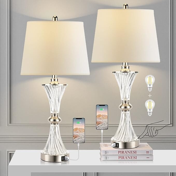 Diseño minimalista y elegante: nuestra encantadora lámpara, que se asienta sobre una base de cristal circular, es el punto focal perfecto para su espacio interior de transición, moderno o tradicional. Con una altura de 26 pulgadas, se puede colocar fácilmente en muchos entornos y su luz suave y cálida se filtra a través de la pantalla de tambor blanca, equilibrando la función y la belleza. 2 puertos de carga USB: agregamos 2 puertos de carga USB incorporados (5 V/2,1 A) dentro de nuestra lámpara de noche. Ya sea que la luz esté encendida o apagada, los puertos USB de la lámpara de noche pueden ser convenientes para cargar dos dispositivos electrónicos al mismo tiempo. Control táctil regulable de 3 modos: puede simplemente configurar la luz de abajo en 3 niveles de brillo diferentes con solo tocar cualquier parte de la base. 2 bombillas LED Edison incluidas: las lámparas de mesa vienen con 2 bombillas LED regulables que pueden ahorrar electricidad. Puede emitir 800 lúmenes más de brillo con casi ninguna salida de calor en comparación con las bombillas incandescentes, brilla con una iluminación natural de 2700 K desde un haz de 360 ??grados sin callejones sin salida. Sin zumbidos que interrumpan su trabajo o sueño. Agregue un encanto diferente a la decoración del hogar: acentuadas con vidrio y cromo, estas lámparas son audaces y detalladas de arriba a abajo. Más que simplemente funcional para su hogar moderno, esta lámpara de mesa auxiliar le brinda un atractivo artístico a su espacio mientras brilla. Intente agregar una a su entrada para agregar calidez cuando lleguen sus invitados.