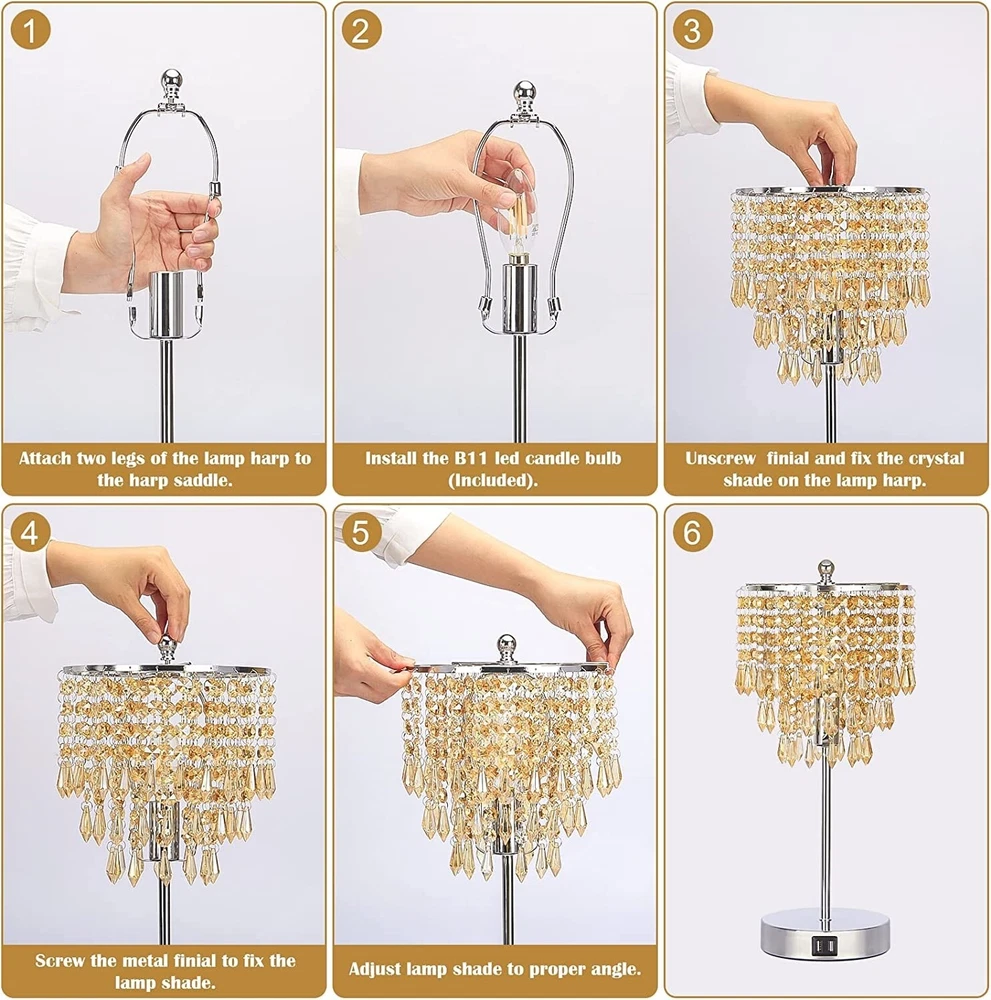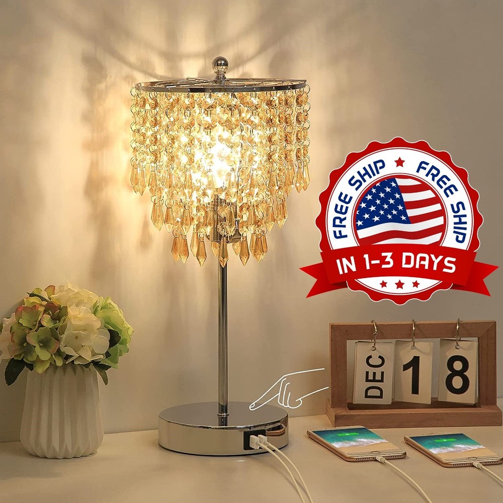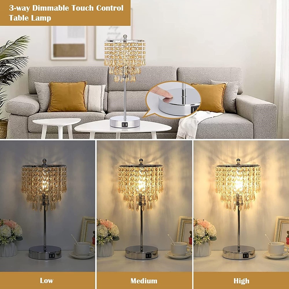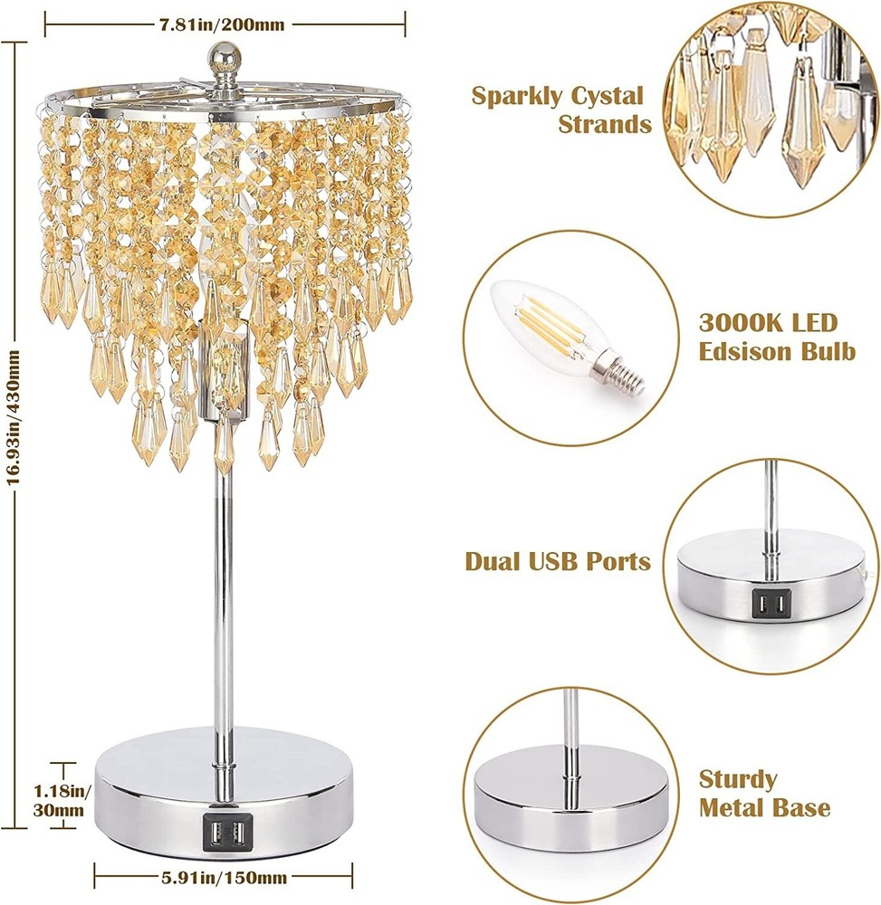 Lámpara de mesa de cristal Luz nocturna con dos puertos de carga USB, inducción 【Diseño elegante y delicado】La pantalla de cristal brillante deja impresionantes sombras en la pared, creando un ambiente romántico para el dormitorio, el comedor, la habitación de los niños, la habitación de las niñas, la habitación de invitados, la oficina. Cuenta con 3 capas de pantalla de hilos colgantes de cristal K9 amarillo ámbar y una base de metal brillante, esta lámpara de mesa de cristal seguramente agregará interés visual a la sala de estar. 【Fácil instalación】 Ya no se preocupe por rascarse las manos ensamblando los colgantes de cristal manualmente. Los hilos están unidos a la pantalla de la lámpara, por lo que la lámpara táctil para el dormitorio es útil para que cualquiera pueda terminar toda la instalación en 2 minutos, no requiere herramientas. Al proporcionar una hebra de cristal de lavanda adicional en el paquete, se puede reemplazar si algunas cuentas de cristal se rompen accidentalmente. 【Puertos de carga USB dobles integrados】Diseñada con dos puertos USB de 5 V/2,1 A en la base, la lámpara para niñas te permite cargar teléfonos móviles, tabletas, bancos de energía, lectores Kindle, relojes inteligentes u otros dispositivos eléctricos, reduce el desorden de cubos de energía, sin necesidad de mover muebles para acceder a los enchufes. Los puertos USB funcionan independientemente de si la lámpara está encendida o apagada. 【Control táctil y regulable de 3 vías】 La lámpara de mesa decorativa ofrece 3 niveles de iluminación (bajo, medio, alto), seleccionando para iluminar el espacio de tenue a brillante para satisfacer las diferentes necesidades del uso diario. Es conveniente ajustar el brillo simplemente tocando las partes metálicas plateadas sin tocar interruptores o botones por la noche. 【Bombilla LED B11 incluida】Después de selecciones cuidadosas, la lámpara de mesa de noche viene con una bombilla de vela LED de 6 W 3000 K (base E12), que combina perfectamente con el sistema de atenuación, ahorra tiempo y energía para buscar una bombilla compatible con la lámpara. La bombilla LED Edison B11 emite un brillo incandescente equivalente a 60 W, menos salida de calor. Sin parpadeos, sin zumbidos.
