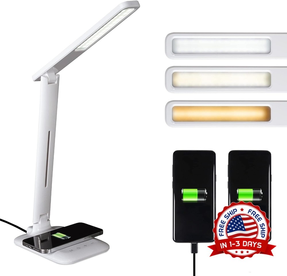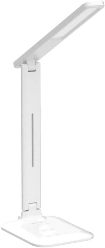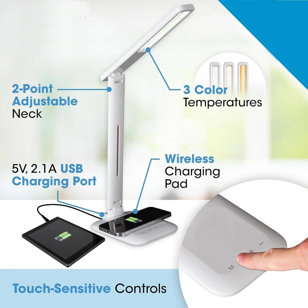 Lámpara de mesa de escritorio LED Cargador inalámbrico y puerto de carga USB NEW Lámpara de escritorio LED Charge Up: perfecta para leer en su dormitorio, hacer manualidades, estudiar en su dormitorio o trabajar en la oficina. El cuello ajustable le permite colocar la luz exactamente donde la necesita, extendiéndose en altura de 11 a 19 pulgadas con 2 puntos de articulación. Diseñado pensando en la salud ocular: sus ojos funcionan mejor con luz natural y equilibrada, por lo que la exclusiva tecnología LED está diseñada para igualar el espectro del sol, reduciendo la fatiga visual hasta en un 51%. Los LED tienen un índice de reproducción cromática (CRI) de 95+, una medida que revela con qué precisión una luz muestra el color en una escala del 1 al 100. Otras lámparas promedian un CRI de 83. Carga inalámbrica y puerto USB: cargue hasta 2 dispositivos a la vez con la elegante plataforma de carga inalámbrica de esta lámpara para dispositivos compatibles con Qi y el puerto USB integrado de 5 V y 2,1 A para auriculares, relojes inteligentes, teléfonos, tabletas y más. 3 modos de temperatura de color: los controles sensibles al tacto le permiten cambiar entre 3 modos de temperatura de color (luz cálida, blanco brillante y luz natural), cada uno con 3 configuraciones de brillo.
