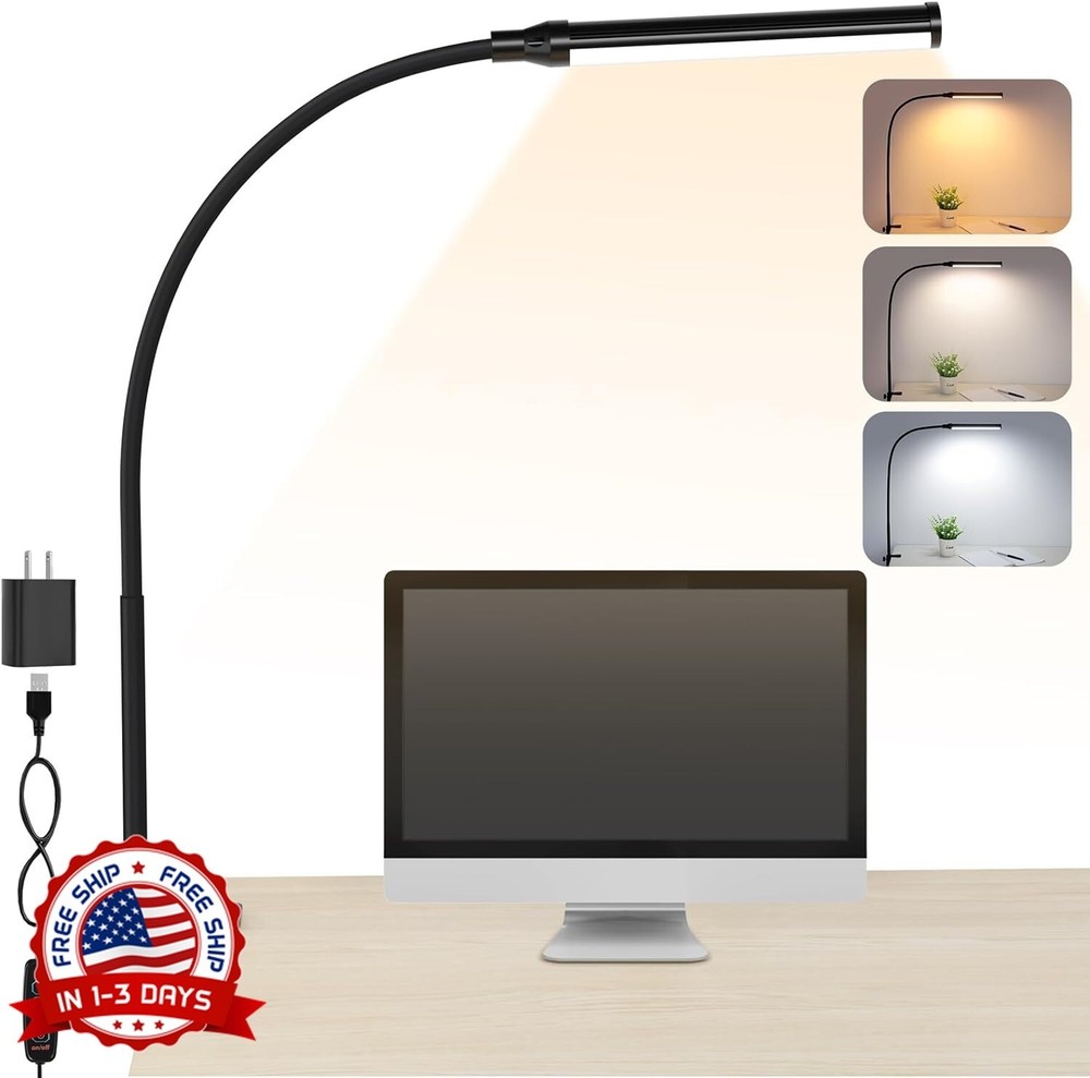 Lámpara de mesa de escritorio LED Cargador inalámbrico y puerto de carga USB NEW Protección para los ojos y CRI>90: la lámpara de escritorio LED ofrece una luz natural y suave cercana a la luz del sol, CRI>90. Sin parpadeo, sin deslumbramiento, menos peligro de luz azul. Ayuda a aliviar la fatiga ocular causada por mirar pantallas de computadora durante mucho tiempo, protegiendo así nuestros ojos 3 modos de color y atenuación continua: nuestra luz de escritorio negra para el dormitorio ofrece 3 modos de color distintos: luz cálida (3000K), luz blanca cálida (4000K) y luz fría (6000K), y 9 niveles de brillo, que puede ajustar sin esfuerzo con interruptores de control para una iluminación óptima. Ideal para leer, estudiar, relajarse, trabajar, pensar, relajarse, dibujar, tejer, coser, pasatiempos, manualidades, trabajos manuales, estudiar, dormitorio Cuello de cisne largo y flexible y ahorro de energía: el cuello de cisne flexible ajustable de 360 grados le permite ajustar fácilmente su luz de abrazadera regulable y dirigir la luz donde desee. Incorporando la estructura de aleación de aluminio, la placa de luz tiene un rendimiento de disipación de calor superior, es más eficiente energéticamente y extiende la vida útil de la lámpara Fuente de alimentación USB y ahorro de energía: Nuestras lámparas de escritorio de oficina vienen con un adaptador dedicado de 5 V/2 A, que es más seguro y confiable que otros adaptadores. No es necesario comprar un adaptador adicional. Incorporando la estructura de aleación de aluminio, la placa de luz tiene un rendimiento de disipación de calor superior, es más eficiente energéticamente y extiende la vida útil de la lámpara Qué obtendrás: Paquete que incluye 1 lámpara de escritorio, 1 abrazadera de metal, 1 adaptador de corriente (5 V/2 A) y 1 manual de usuario. ¡Simplemente disfruta de nuestra lámpara de escritorio que cuida la vista cuando llegue la temporada de regreso a clases!