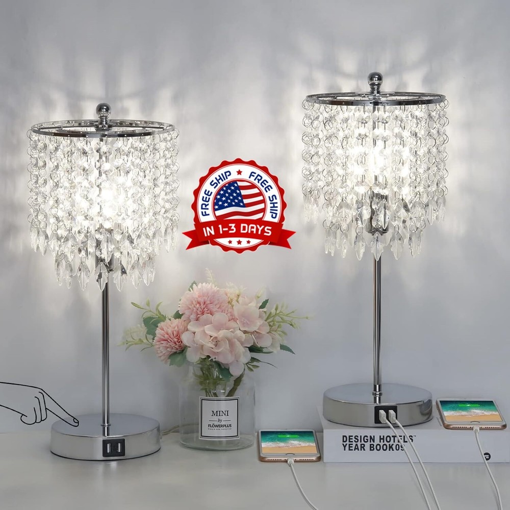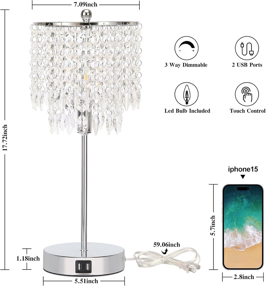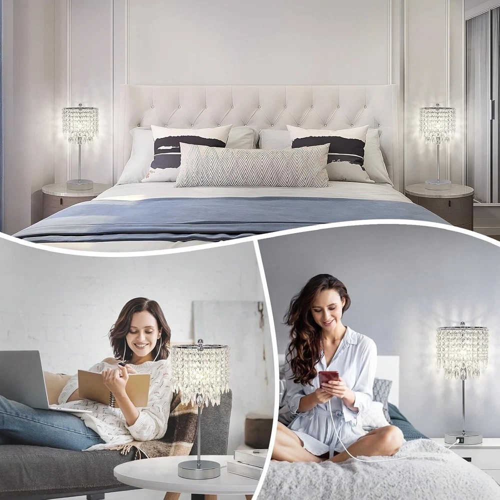 Lámpara de mesa regulable plateada con control táctil de cristal 2 USB 4W LED US Juego de lámparas de cristal exquisito: el diseño único del colgante de cristal de hoja irradia una apariencia elegante y sofisticada, que agrega un toque de glamour lujoso a nuestro hogar. Los cristales K9 de primera calidad permiten que la luz se refracte y refleje maravillosamente, creando un juego fascinante de luces y sombras, lo que lo convierte en un deleite para la vista. Nota: consulte nuestras imágenes y la página detallada para confirmar el tamaño. Lámparas de cristal regulables de 3 vías: las lámparas de cristal para dormitorio brindan brillo bajo, medio y alto con control táctil, satisfaciendo perfectamente sus diversas necesidades como leer, amamantar o maquillarse. Simplemente toque la base de la lámpara, el poste, la pantalla de metal o incluso el remate superior para cambiar los niveles de luz y crear diferentes atmósferas para su dormitorio, sala de estar, habitación de niñas, habitación de invitados o la entrada. Prácticos puertos USB de 5 V/2,1 A: dos puertos USB integrados en cada una de las pequeñas lámparas táctiles al lado brindan más opciones de carga. También pueden eliminar la preocupación de buscar un enchufe de pared antes de cargar su teléfono celular, iPad, Kindle, pequeños electrodomésticos y otros dispositivos digitales inteligentes. Los puertos funcionan incluso si la lámpara de cristal está apagada, lo que resulta muy útil en cualquier momento. Bombilla LED E12 gratuita incluida: cada lámpara de mesa táctil incluye una bombilla LED regulable B11 de 4 W y 4000 K para su comodidad. Una bombilla LED de 4 W equivale a una incandescente de 40 W con el mismo efecto luminoso, pero le permite ahorrar en la factura de la luz. Además, las bombillas sin parpadeos ni zumbidos reducen el consumo de las lámparas y protegen su vista de forma eficaz.