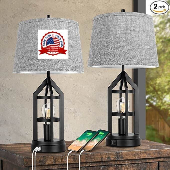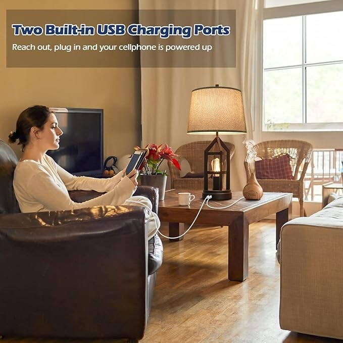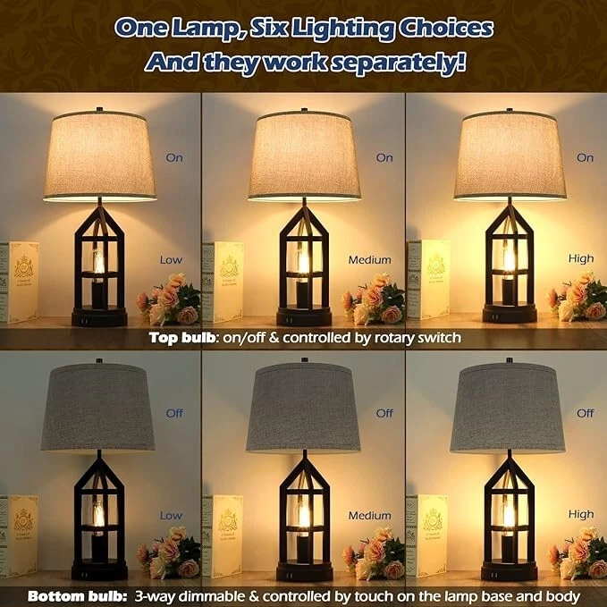 【Las lámparas de mesa de 2 luces ofrecen múltiples opciones de iluminación】Obtienes una lámpara de mesa normal y una luz de noche regulable con las lámparas de mesa de 2 bombillas de Beslowe. La luz superior se controla mediante el interruptor giratorio para encender/apagar y la luz inferior se controla mediante el tacto en el cuerpo de la lámpara calada o la base para la función de atenuación de 3 vías. Las dos luces funcionan por separado y no se afectan entre sí, lo que te deja opciones de iluminación más que suficientes para satisfacer diferentes necesidades, ya sea leer a altas horas de la noche, amamantar o trabajar. 【2 puertos de carga USB en la base de la lámpara】Con un tamaño que ahorra espacio y 2 puertos de carga USB integrados en la base, la lámpara de mesa es definitivamente un cambio de juego para la mesita de noche o la mesa auxiliar que tiene una superficie pequeña. Ocupa solo un área limitada del escritorio para proporcionar abundante luz y, mientras tanto, actúa como una estación de carga conveniente para cargar su teléfono celular, iPad, Kindle u otros dispositivos electrónicos. ?4 bombillas LED Edison de 7 vatios incluidas?¿Qué mejor combinación con estas lámparas de mesa de estilo rústico que las luces LED Edison? Son el tipo de bombilla más eficiente energéticamente disponible, duraderas y estéticamente atractivas tanto si la luz está encendida como apagada. Cada bombilla incluida emite un brillo de hasta 800 lúmenes que es comparable a una bombilla incandescente de 60 vatios. Por brillante que sea, la luz blanca cálida es agradable a la vista y ayuda drásticamente a reducir la fatiga ocular. ?Decoración del hogar de estilo rústico?La bombilla de filamento expuesta dentro del cuerpo de la jaula abierta es la parte única del diseño de la lámpara. Es llamativa e inyecta instantáneamente un toque de estilo rústico en el lugar donde se coloca. La elección perfecta si quieres añadir una pieza llamativa a tu hogar o espacio de trabajo. ?Fácil de montar?Las lámparas de mesa requieren montaje, pero es fácil y se puede hacer en 10 minutos. (La lámpara de mesa mide 22,5 pulgadas de alto desde la base hasta el remate cuando está ensamblada. Verifique cuidadosamente la dimensión antes de comprar).